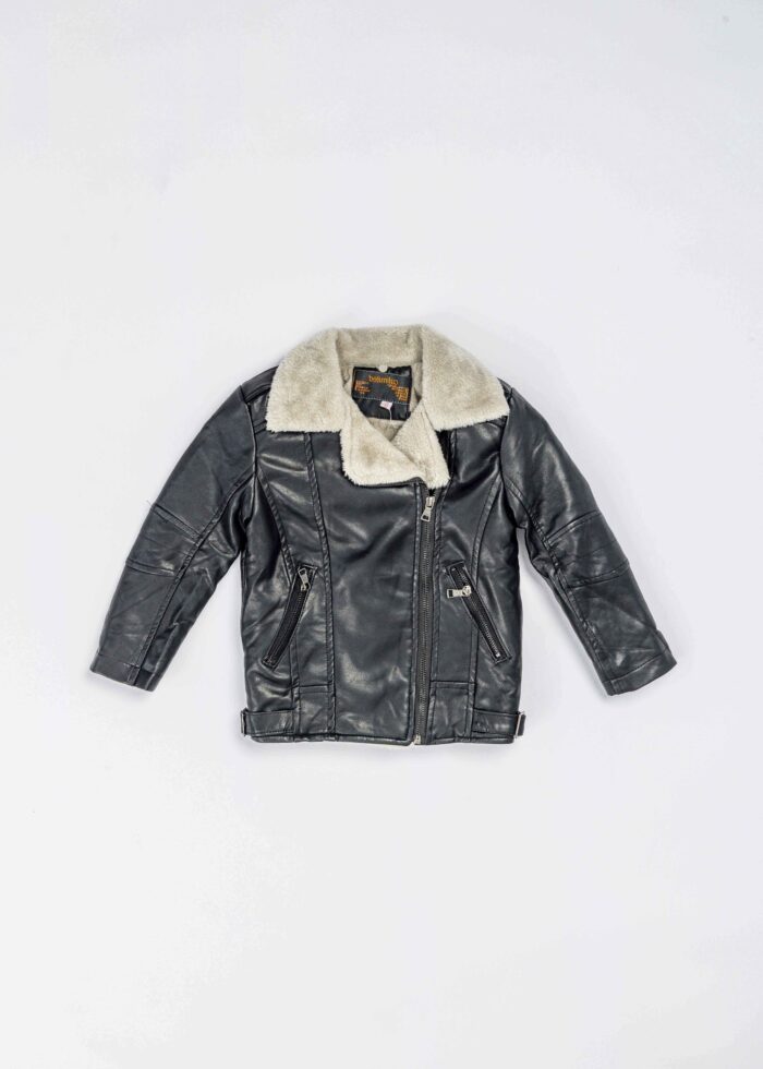 جاكيت اطفال بيبي ولادي, جلد, مبطن بالفرو, ياقة مثنية, سحاب من الامام للاغلاق, اكمام طويلة, جيوب من الامام مع سحابات للاغلاق, احزمة من الجانبين, انيق وعصري
