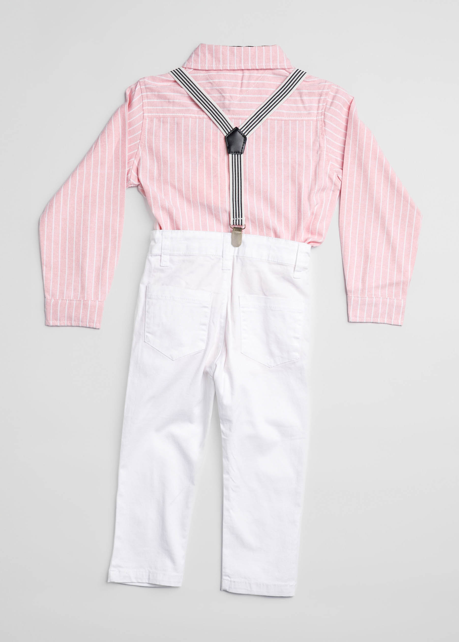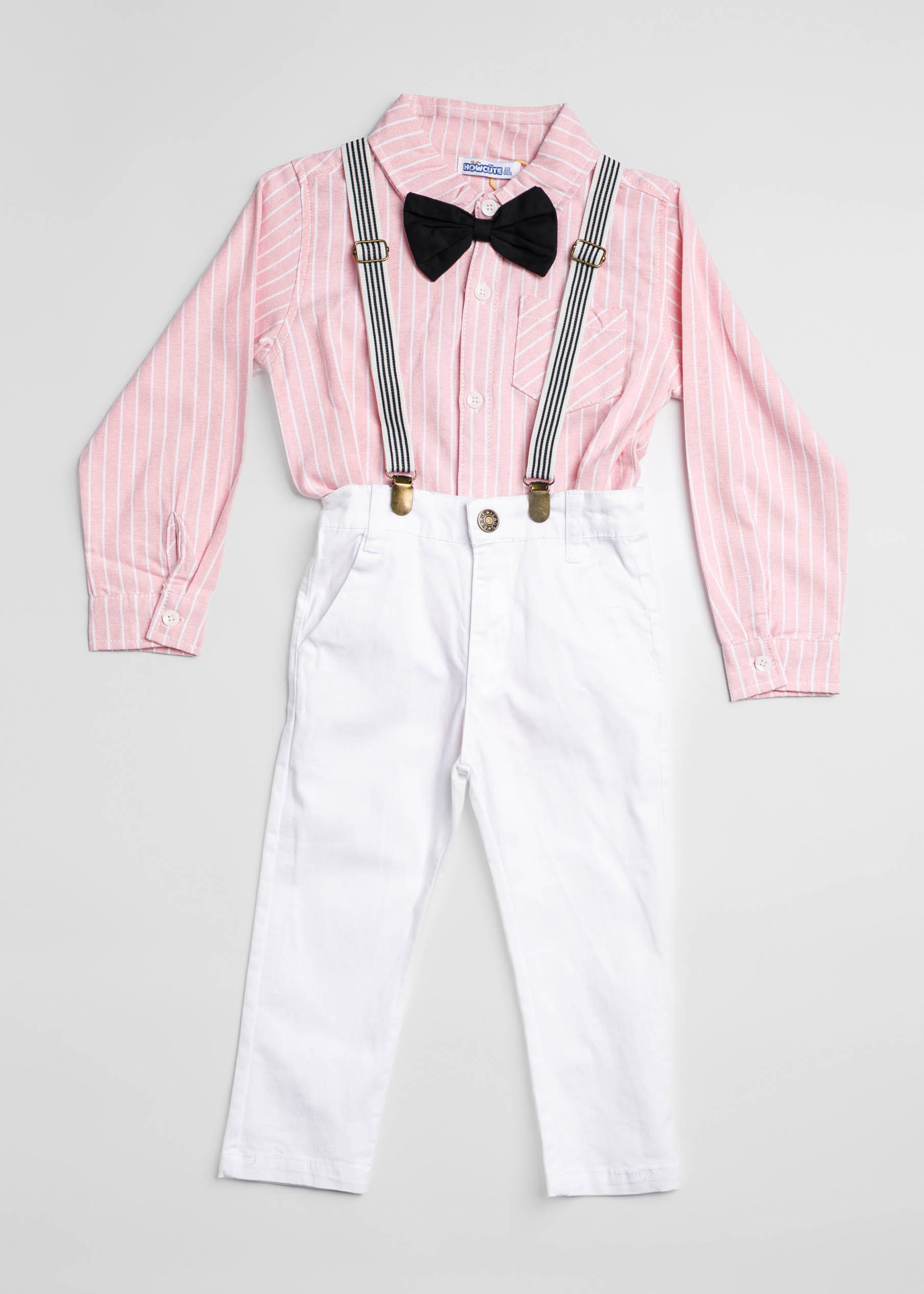 طقم اطفال بيبي ولادي, قطعتين, قميص, مخطط, ياقة مثنية مع فيونكة من الامام, ازرار من الامام للاغلاق, اكمام طويلة مع معصم ضيق, جيب صغير من الامام, شيالات, بنطلون, سادة, زر وسحاب من الامام للاغلاق, جيوب من الامام والخلف, انيق وعصري