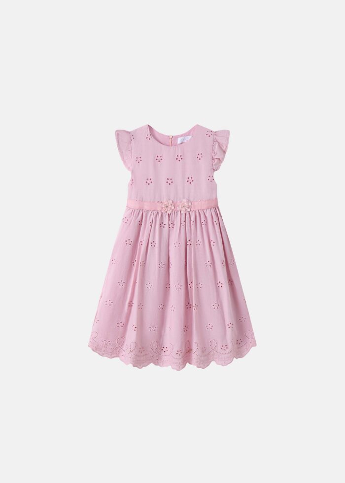 فستان اطفال بيبي بناتي, مزين بتطريز بثقوب, ياقة مدورة, سحاب من الخلف, اكمام كشكش قصيرة, خصر كسرات مزين بالورد من الامام, انيق وعصري