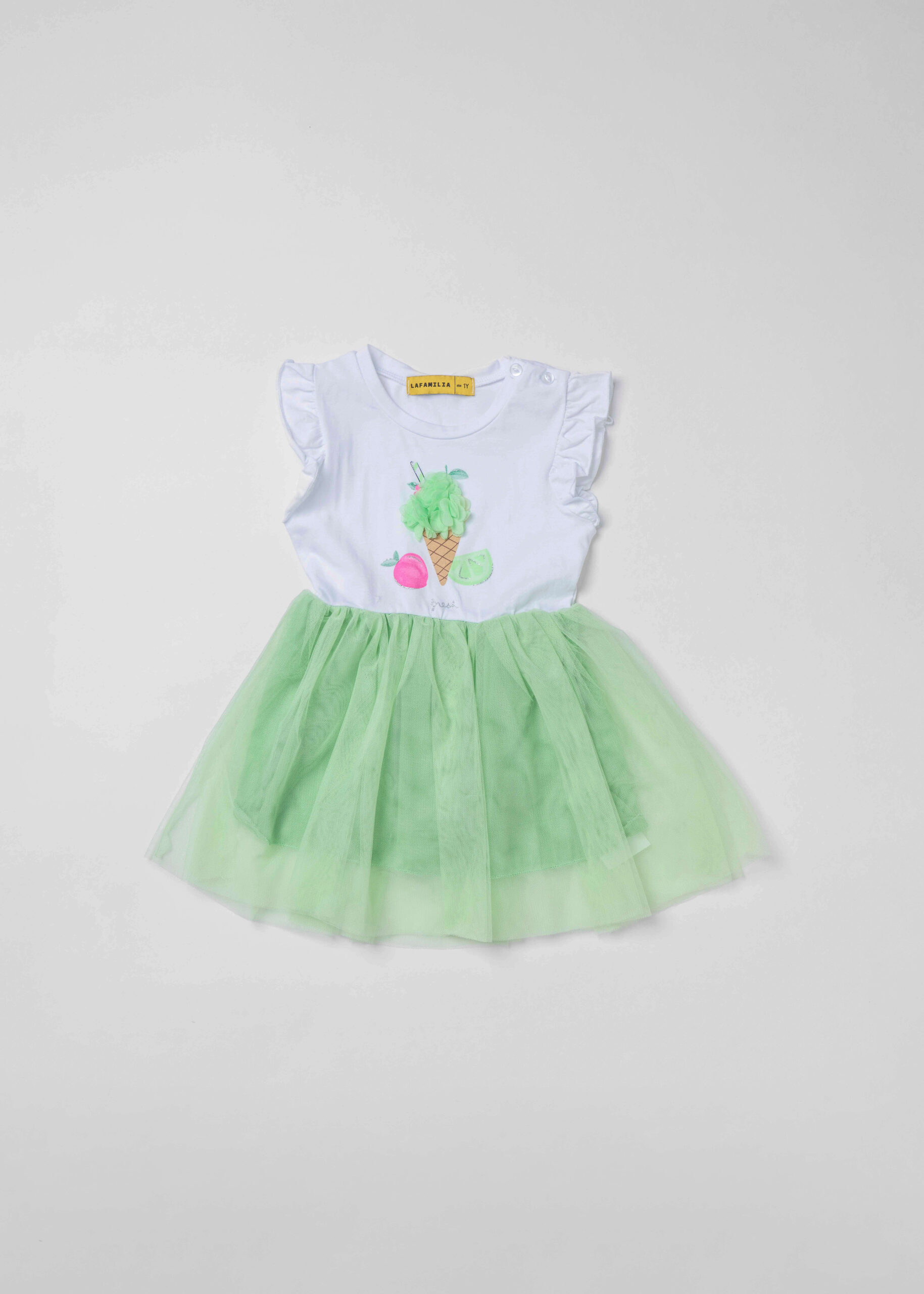 فستان اطفال بيبي بناتي, قصير, طباعة ايسكريم من الامام, ياقة مدورة مع ازرار جانبية, اكمام قصيرة, تنورة تل, خصر كسرات, انيق وعصري