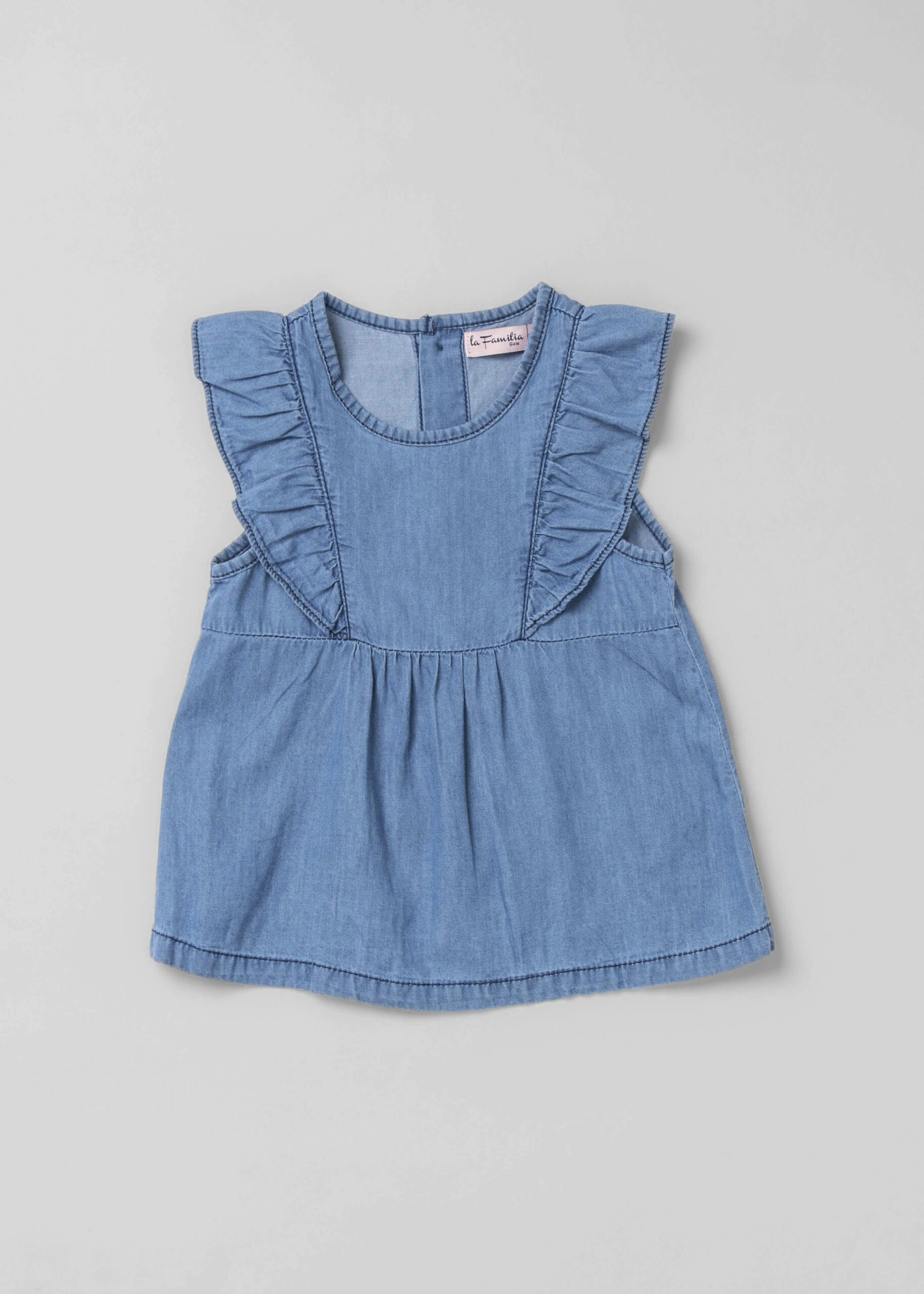 فستان اطفال بيبي بناتي, قصير, جينز, ياقة مدورة مع ازرار من الخلف للاغلاق, بدون اكمام مع اكتاف كشكش, انيق وعملي