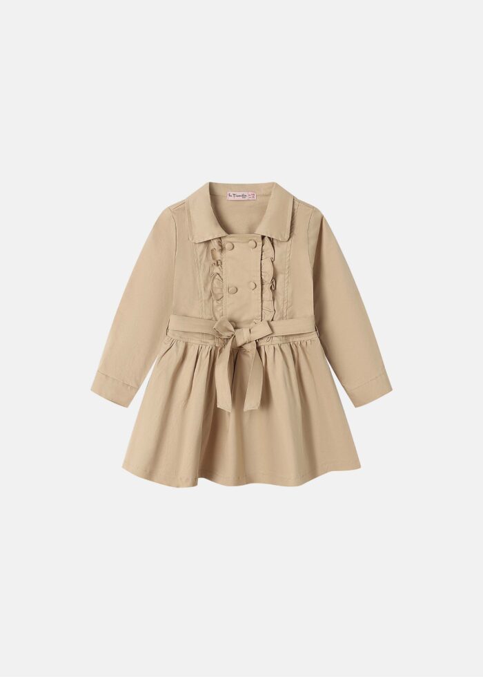 فستان اطفال بيبي بناتي, قصير, اكمام طويلة مع معصم ضيق, ياقة كلاسيكية مثنية, ازرار من الامام باطراف مزينة بالكشكش, خصر مطاطي مع حزام للربط, انيق ومميز