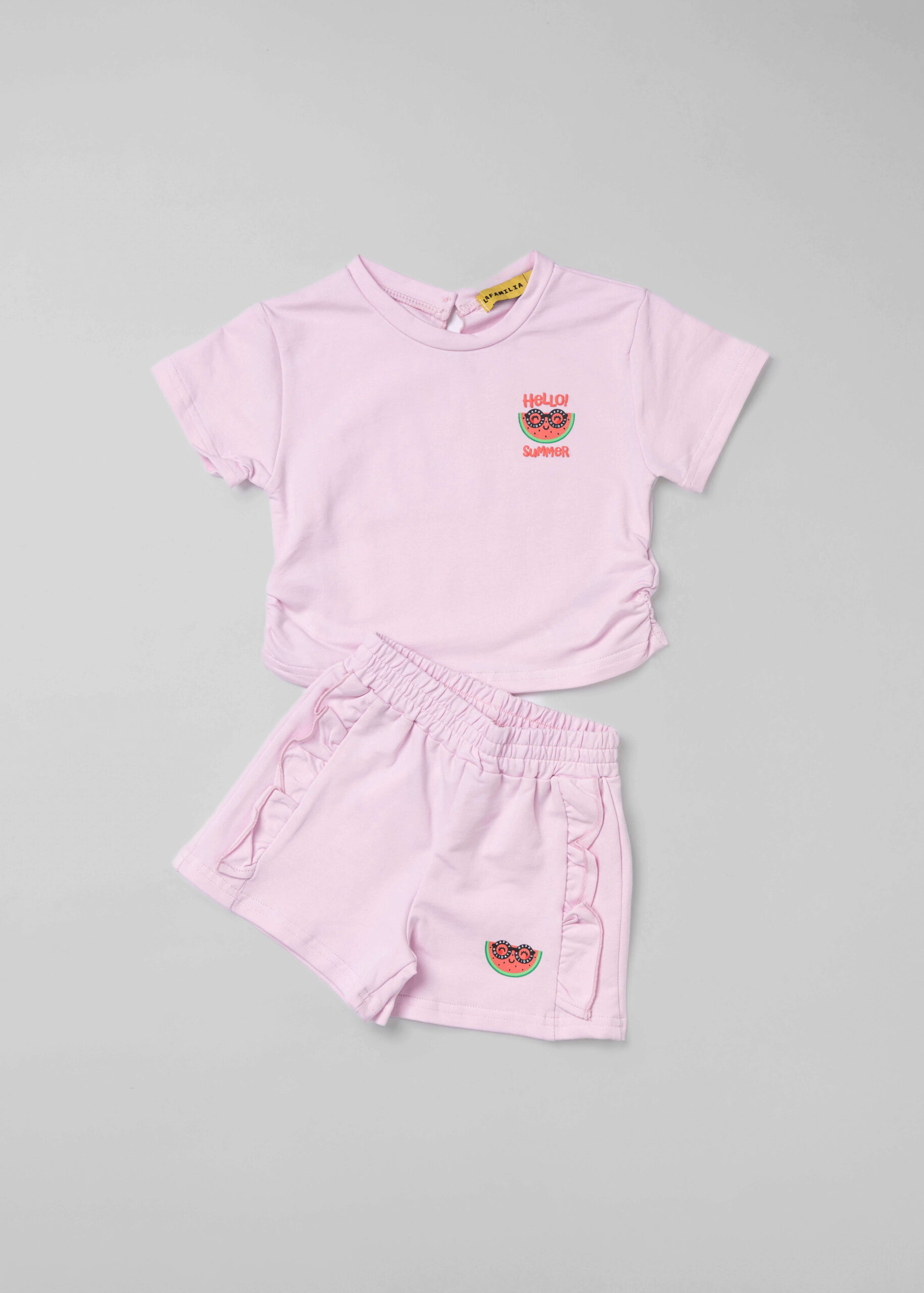 طقم أطفال بيبي بناتي, قطعتين, طباعة “Hello Summer”, تيشيرت, ياقة مدورة مع زر من الخلف, اكمام قصيرة, ثنيات من الجانبين, شورت, خصر مطاطي, تصميم كشكش, انيق وعملي