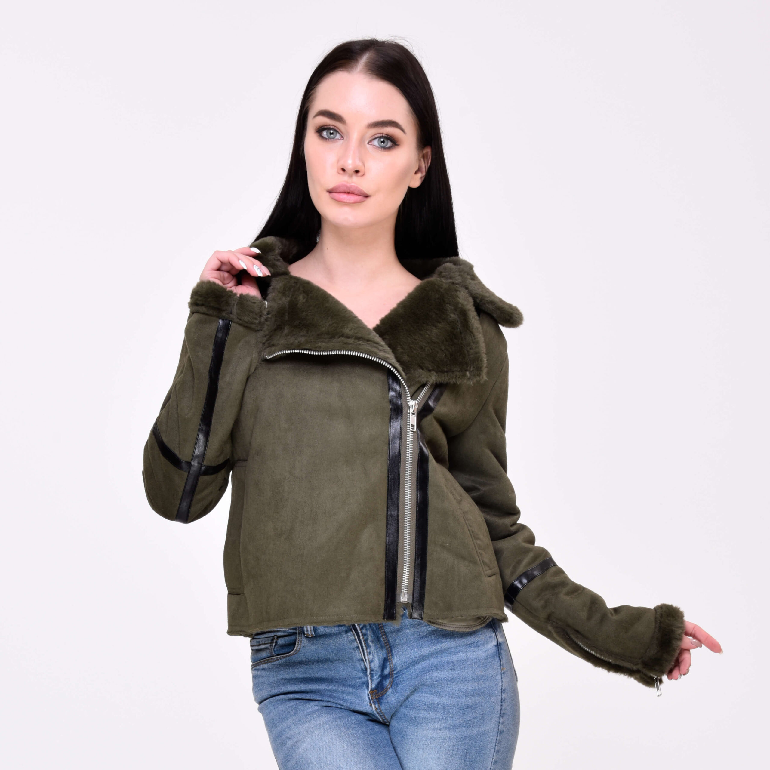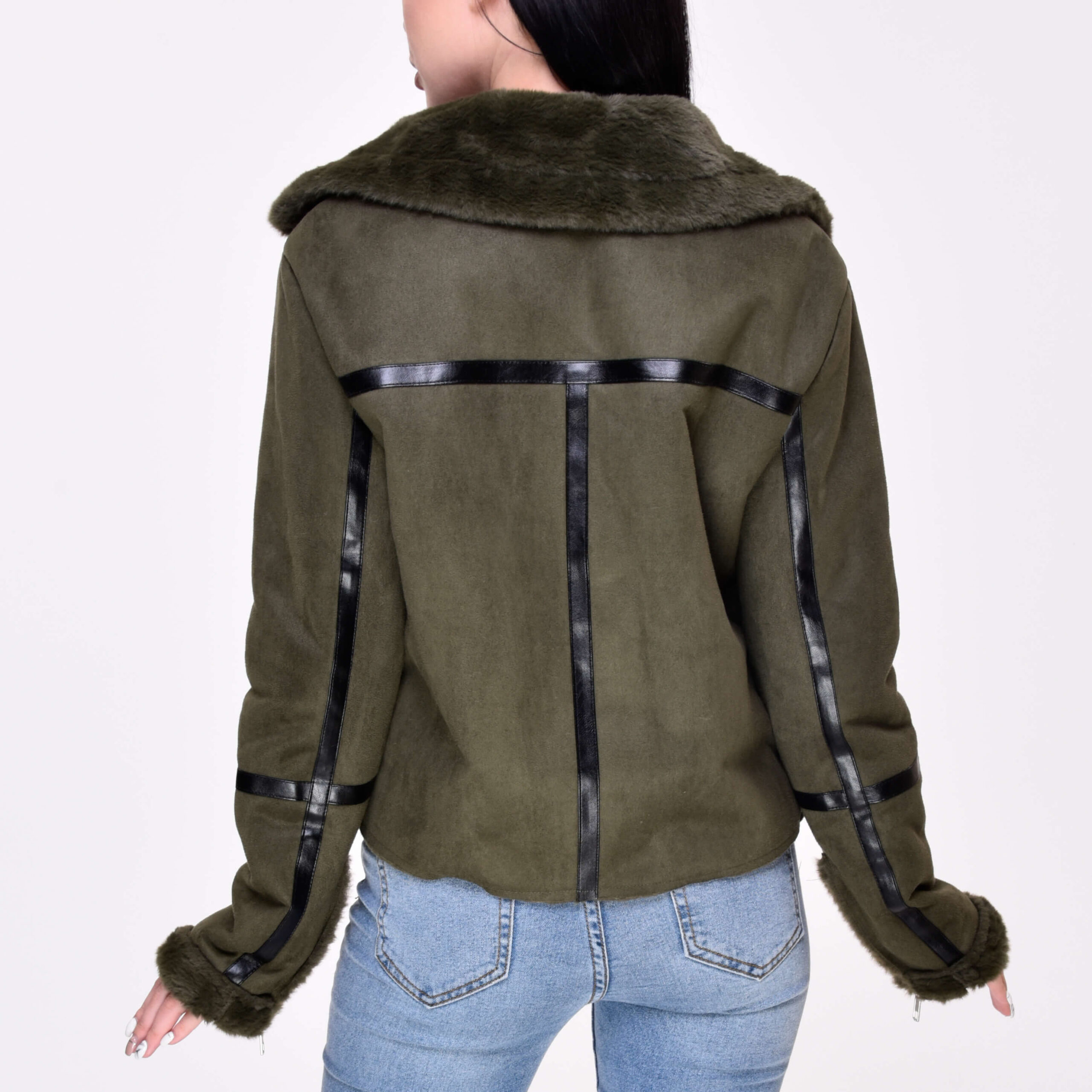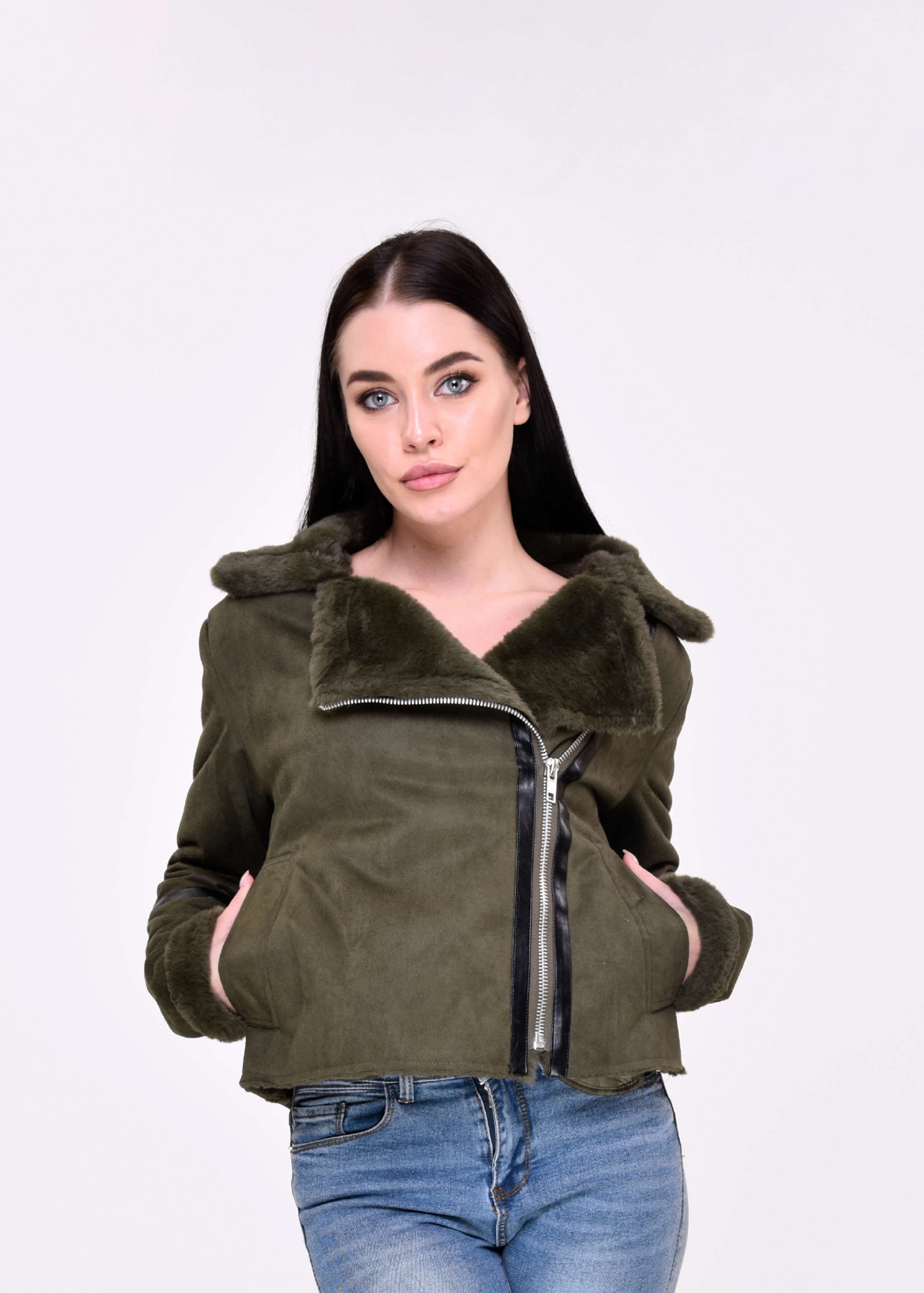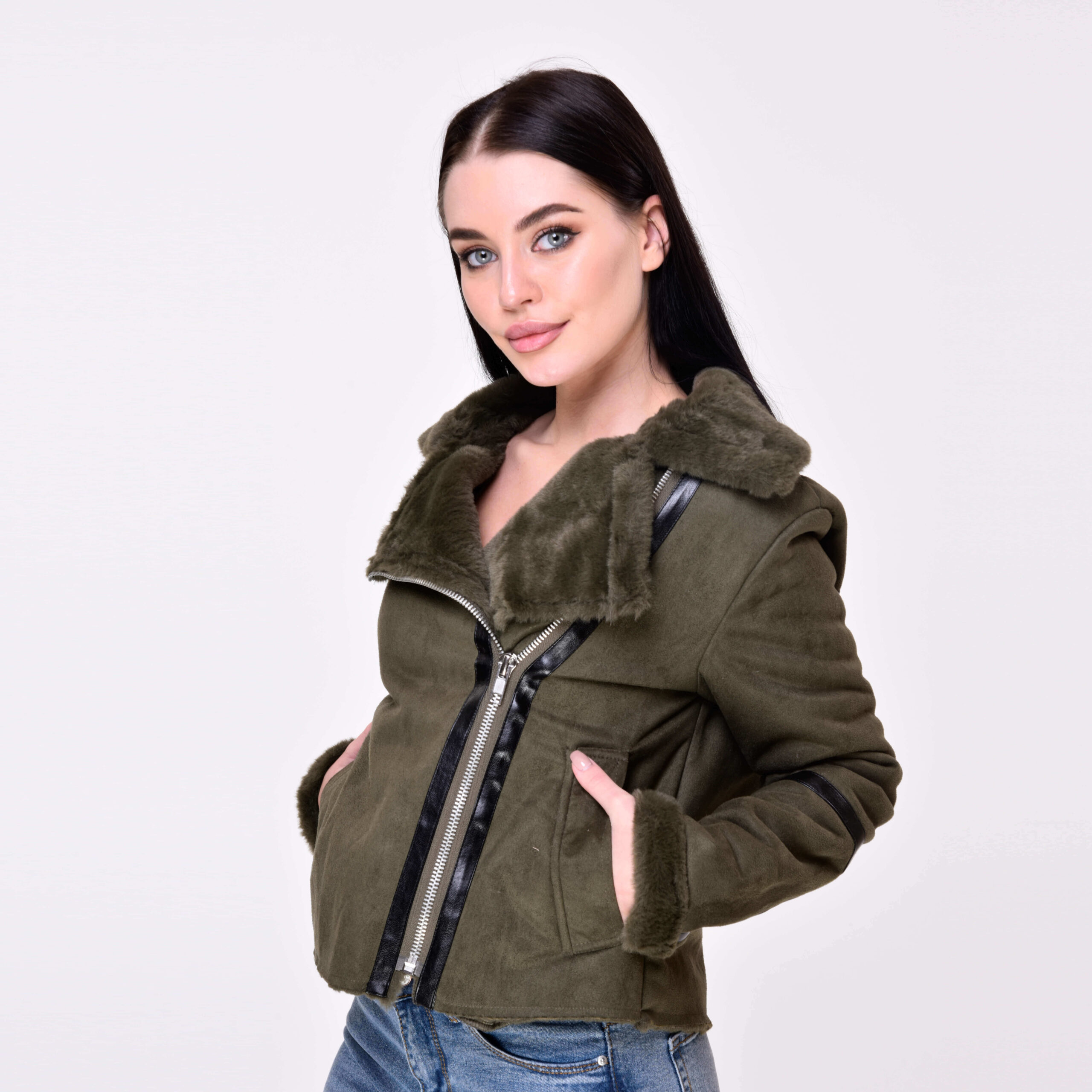 جاكيت مصنوع من نسيج جلد السويد الاصطناعي بجزء داخلي ممزوج بالفرو الاصطناعي، أكمام طويلة مُنتهية بسوار معصم بقلبة و سحاب، جيوب أمامية و إغلاق أمامي بسحاب.