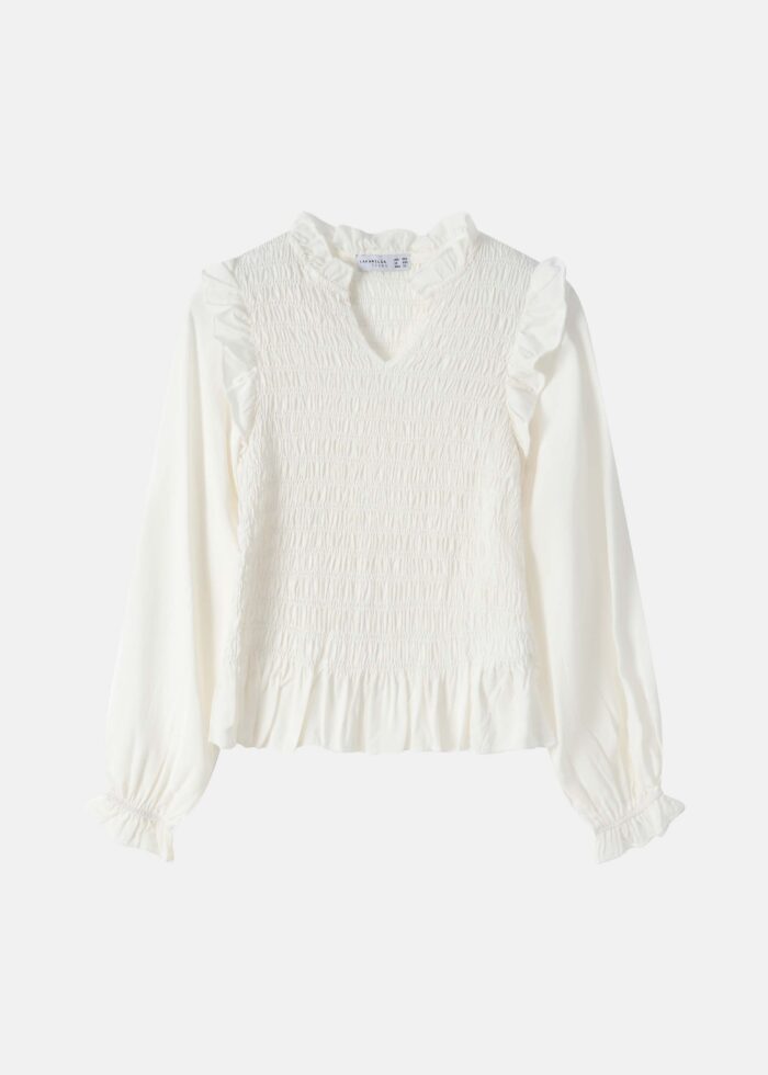 بلوزة بناتي, تصميم مطاطي بشكل ثنيات, ياقة سبعة, اكمام طويلة مع معصم كشكش مطاطي, اطراف كشكش, انيقة وعصرية