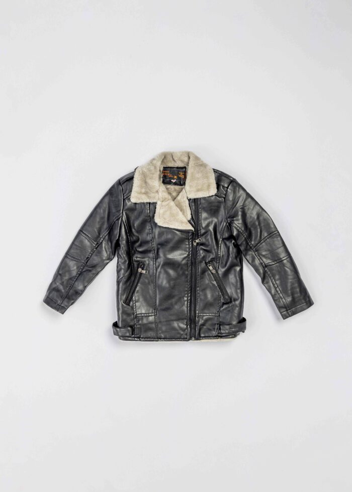 جاكيت اطفال ولادي, جلد, مبطن بالفرو, ياقة مثنية, سحاب من الامام للاغلاق, اكمام طويلة, جيوب من الامام مع سحابات للاغلاق, احزمة من الجانبين, انيق وعصري