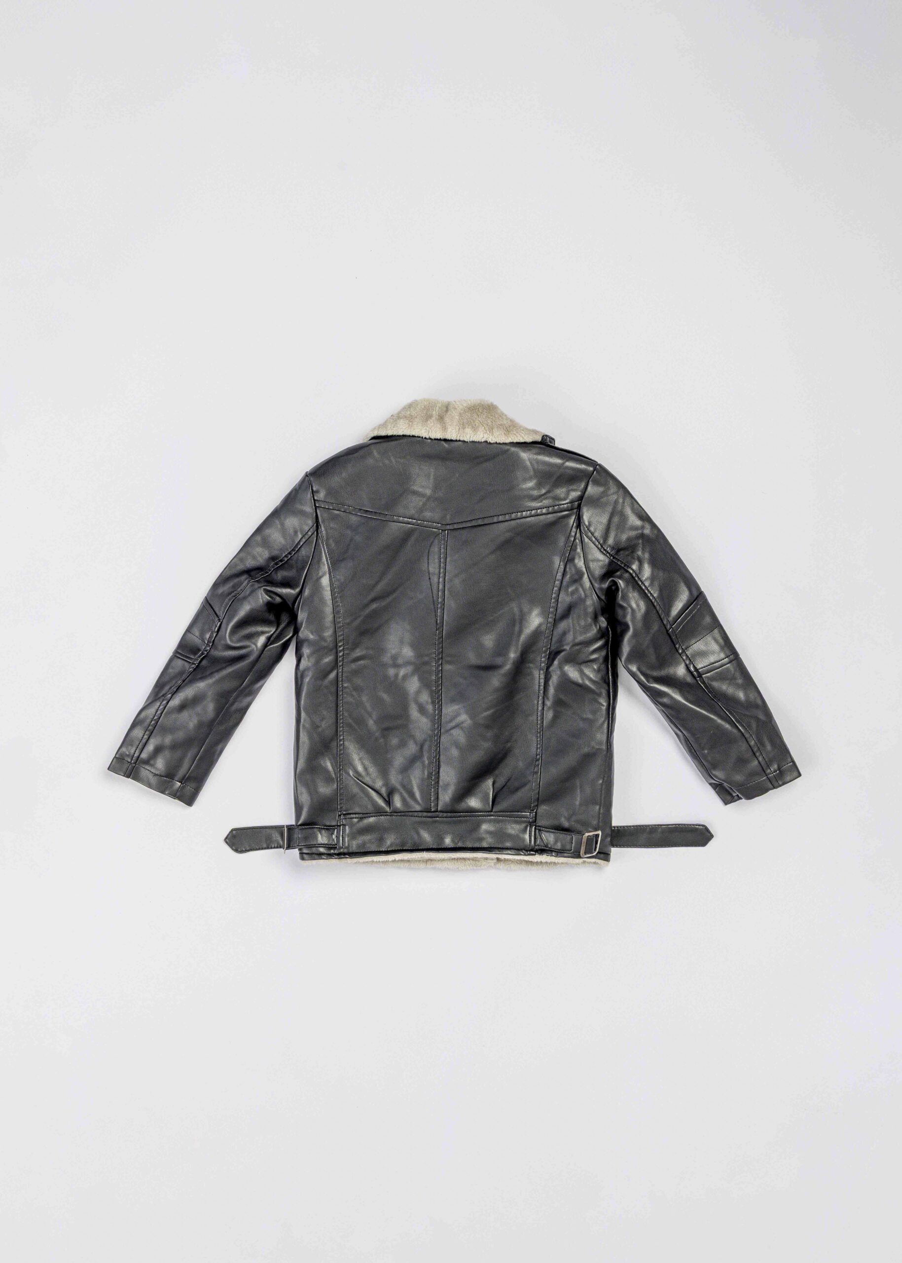 Kids boy jacket, leather, fur lined, rolled collar, front zipper closure, long sleeves, front pockets with zipper closure, side buckles, unique and modern