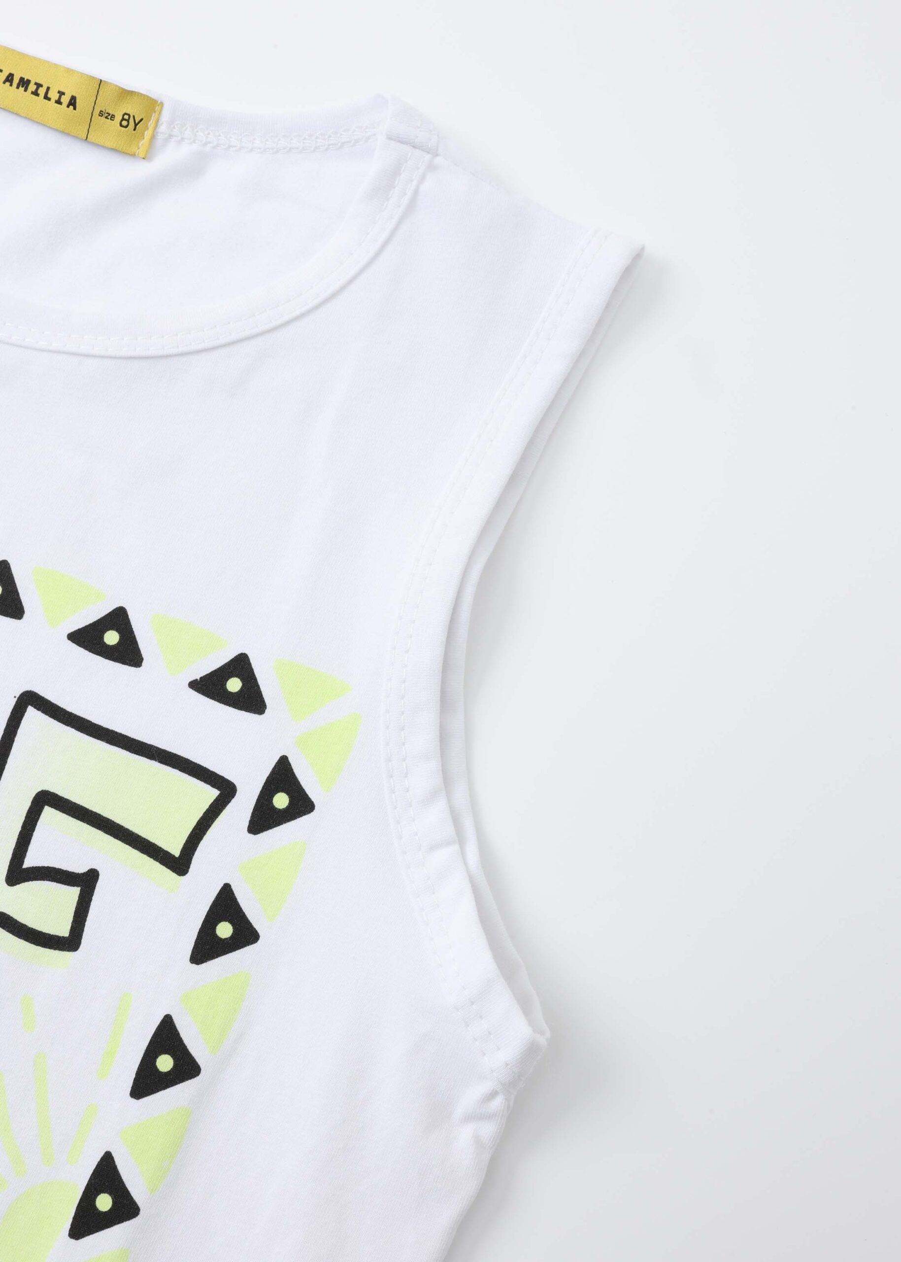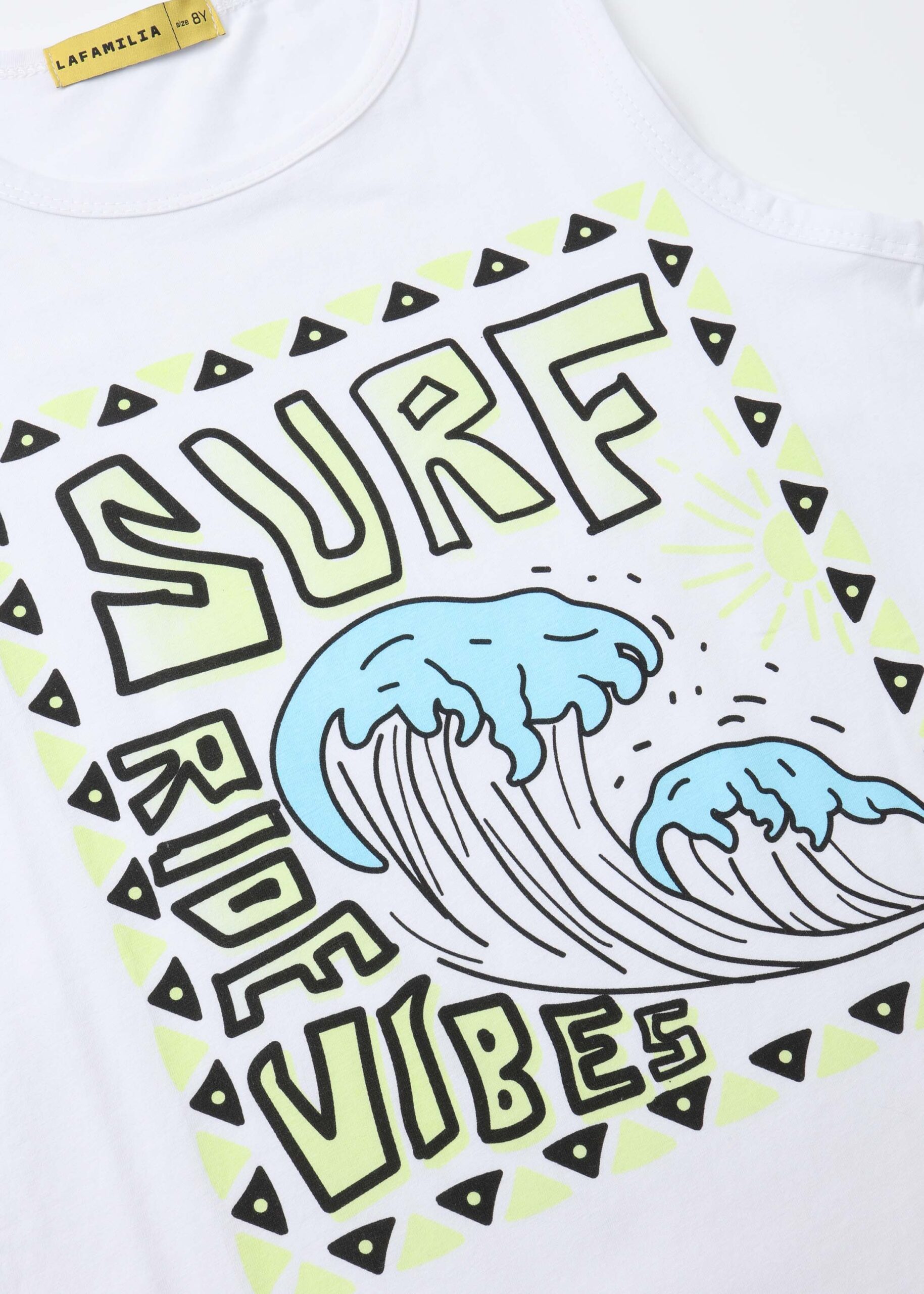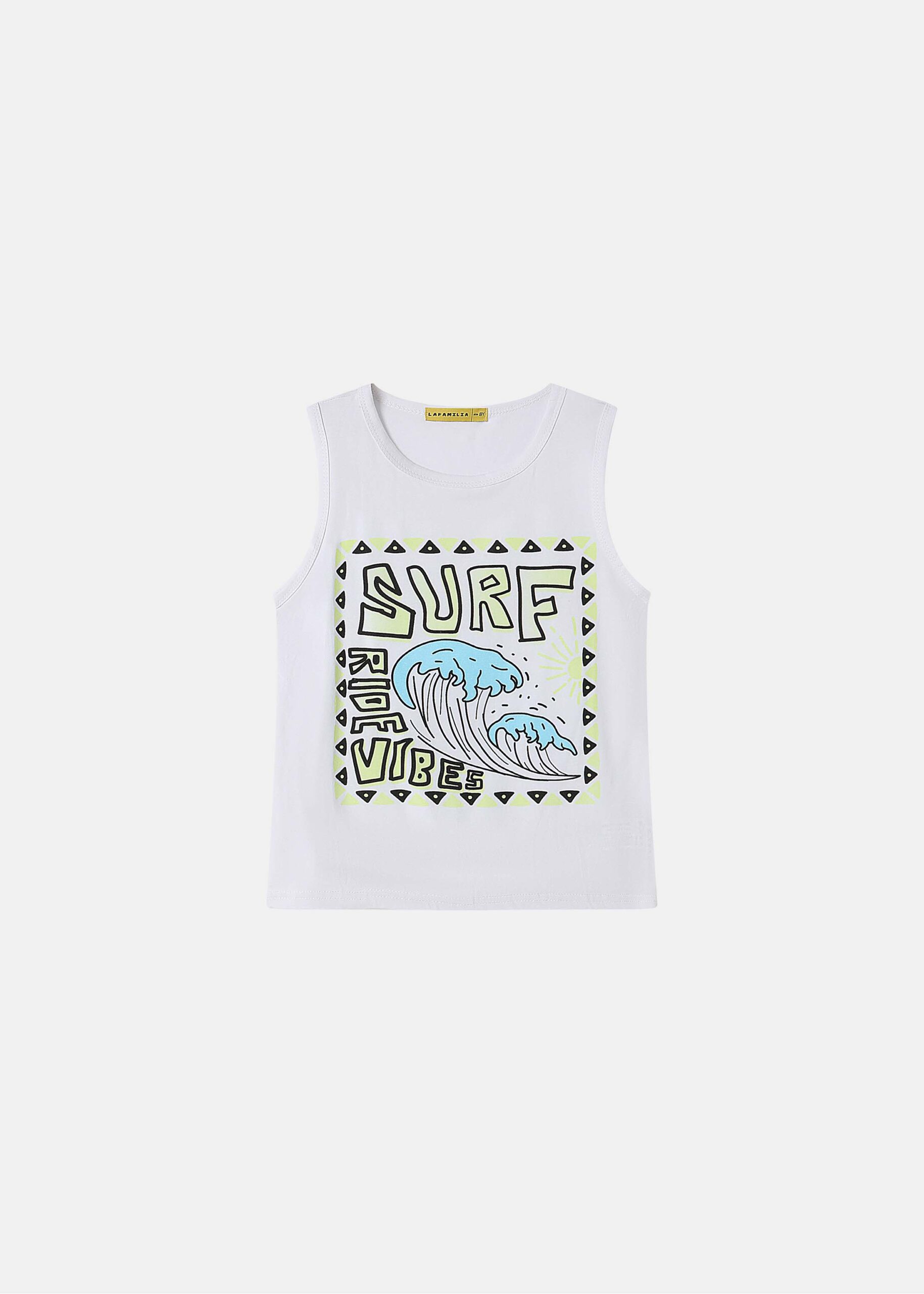 Kids boy top, front “Surf Ride Vibes” printed, round neck, sleeveless, unique and modern