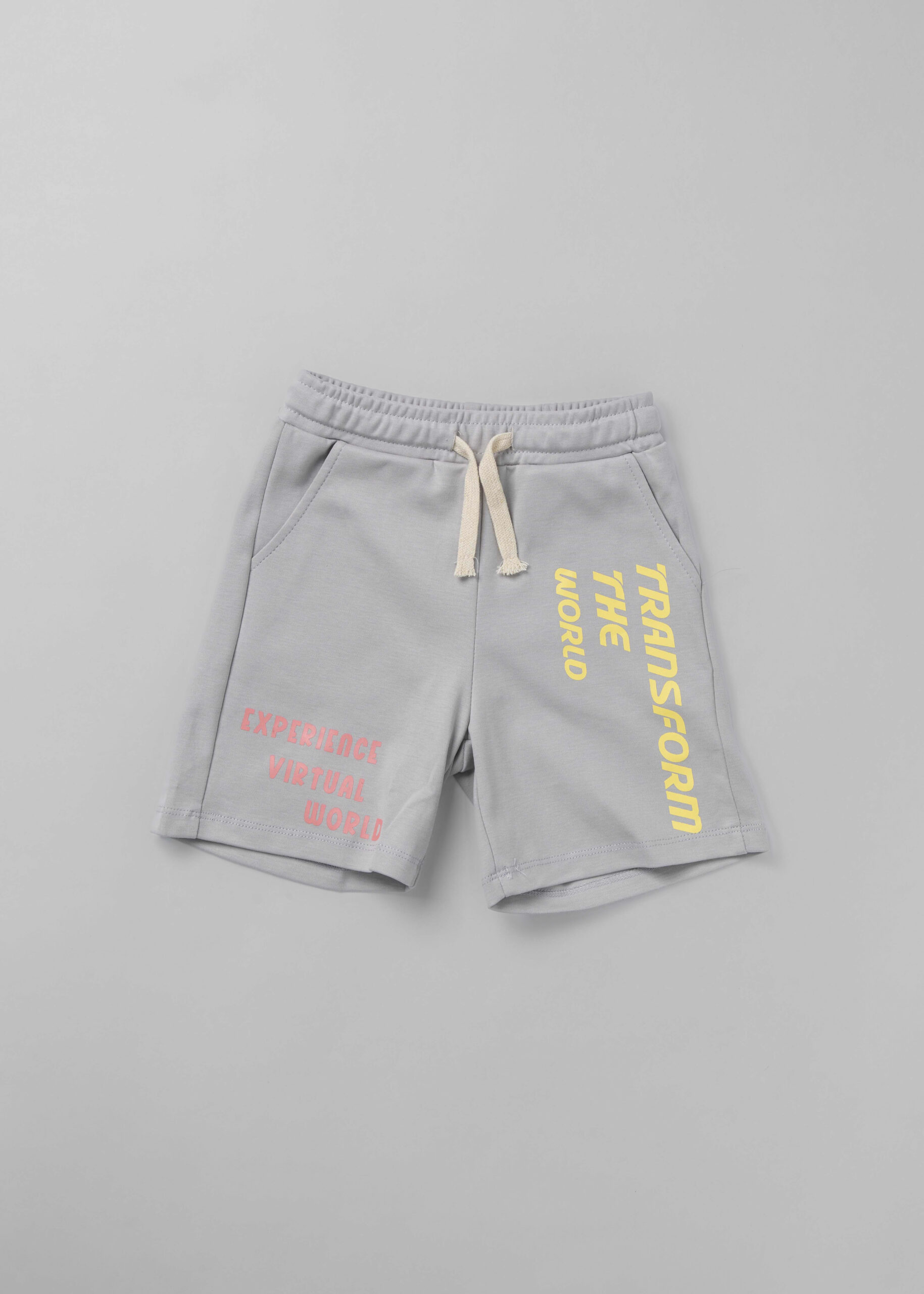 شورت اطفال ولادي, رياضة, خصر مطاطي مع حبل للربط من الامام, طباعة “Transform the World” من الامام, جيوب من الامام, مريح وعملي