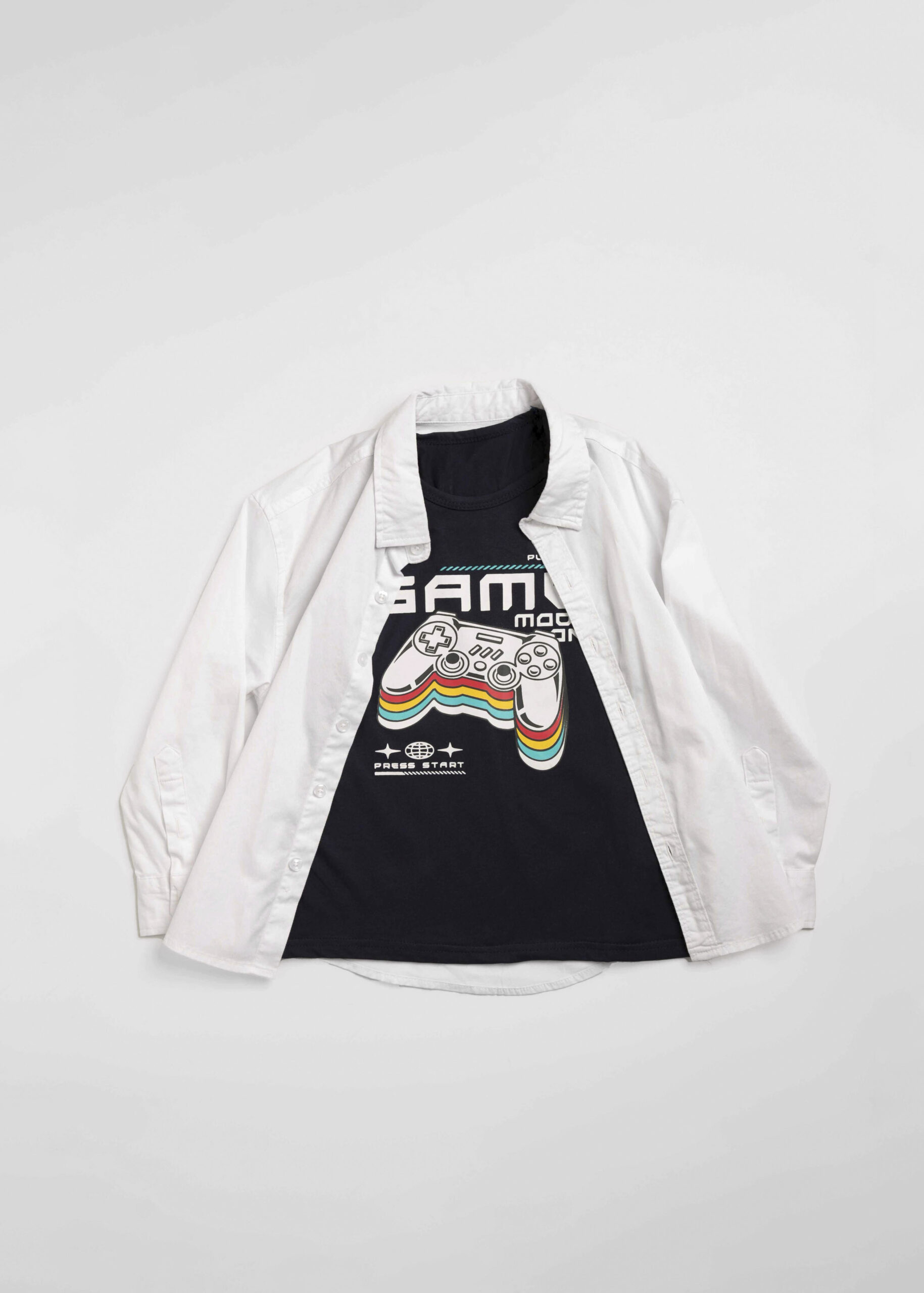 طقم اطفال ولادي, قطعتين, تيشيرت, طباعة يد تحكم من الامام, ياقة مدورة, اكمام قصيرة, قميص, سادة, اكمام طويلة مع معصم ضيق, ازرار من الامام للاغلاق, ياقة مثنية, انيق وعصري