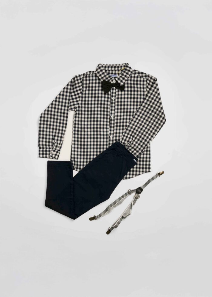 طقم اطفال ولادي, قطعتين, قميص, بنقش, ياقة مثنية مع فيونكة من الامام, ازرار من الامام للاغلاق, اكمام طويلة مع معصم ضيق, شيالات, بنطلون, سادة, زر وسحاب من الامام للاغلاق, جيوب من الامام والخلف, انيق وعصري