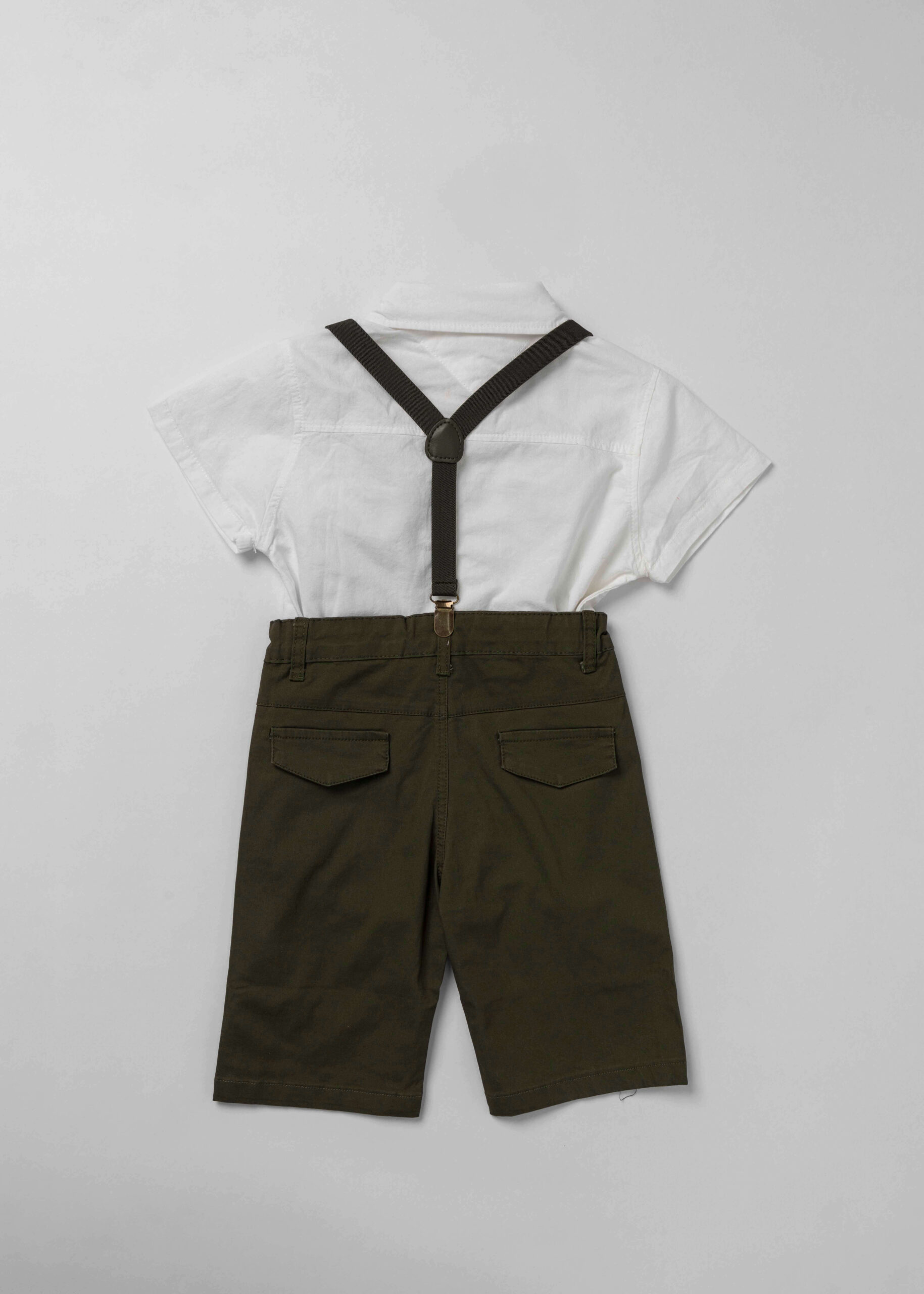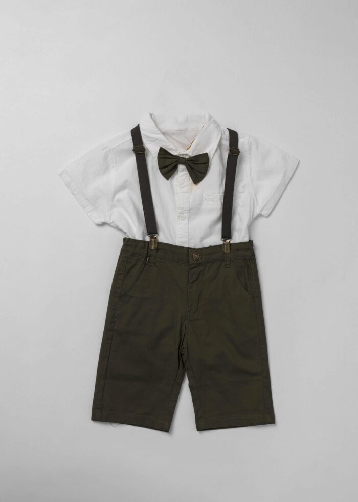 طقم اطفال ولادي, قطعتين, قميص, سادة, ياقة مثنية مع فيونكة من الامام, ازرار من الامام للاغلاق, اكمام قصيرة, شيالات, شورت, سادة, زر وسحاب من الامام للاغلاق, جيوب من الامام والخلف, انيق وعصري