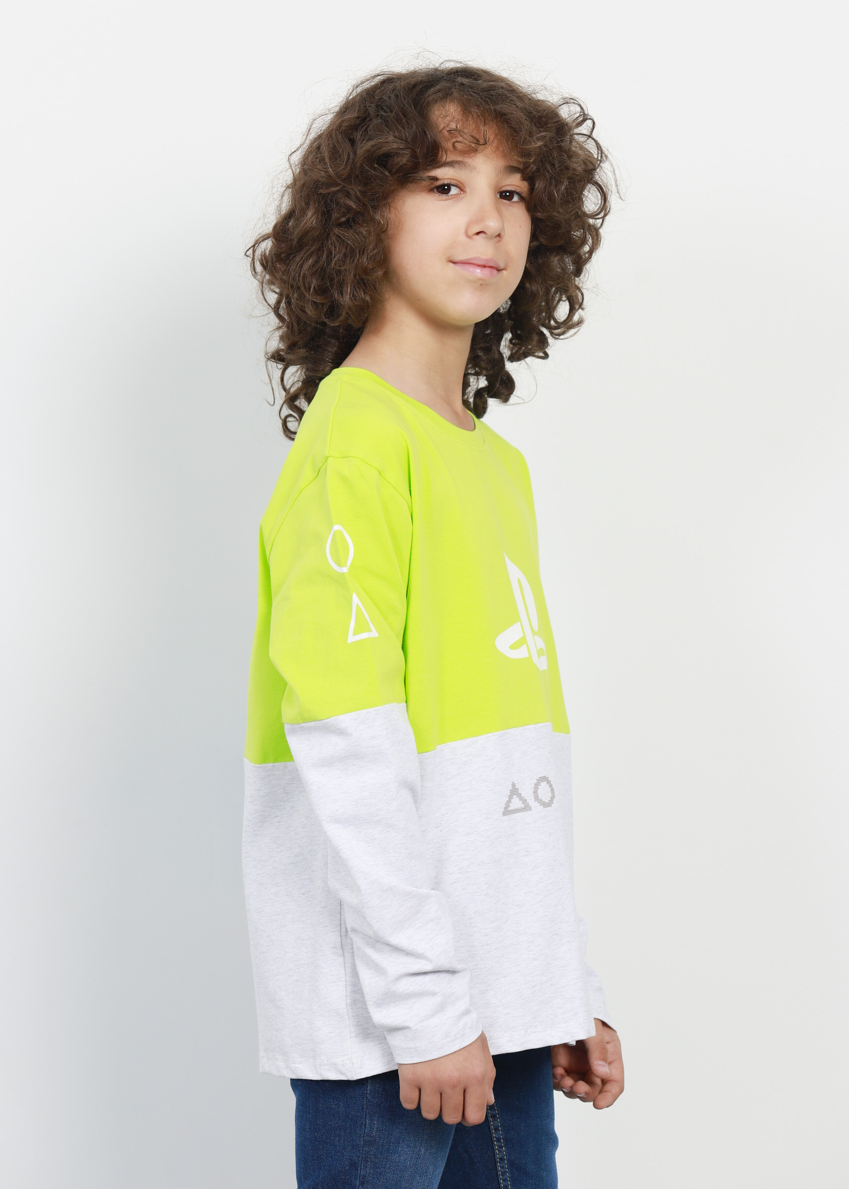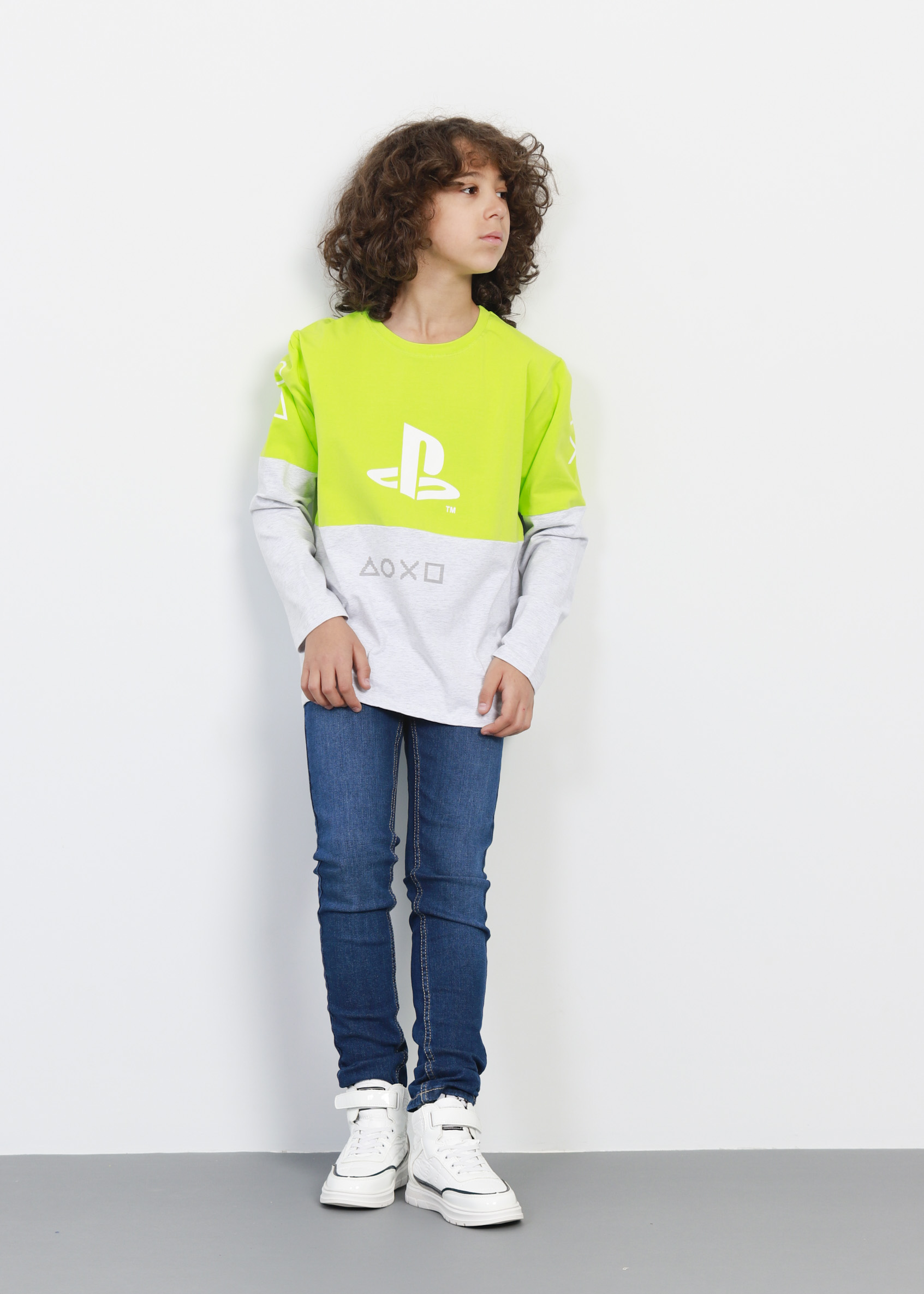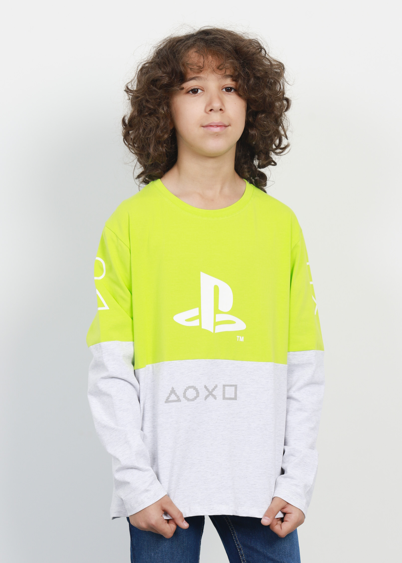 بلوزة اطفال ولادي, لونين, اكمام طويلة, ياقة مدورة, طباعة شعار ورموز بلايستيشن من الامام وعلى الاكمام, انيقة وعصرية, 70% قطن 25% بوليستر 5% سباندكس