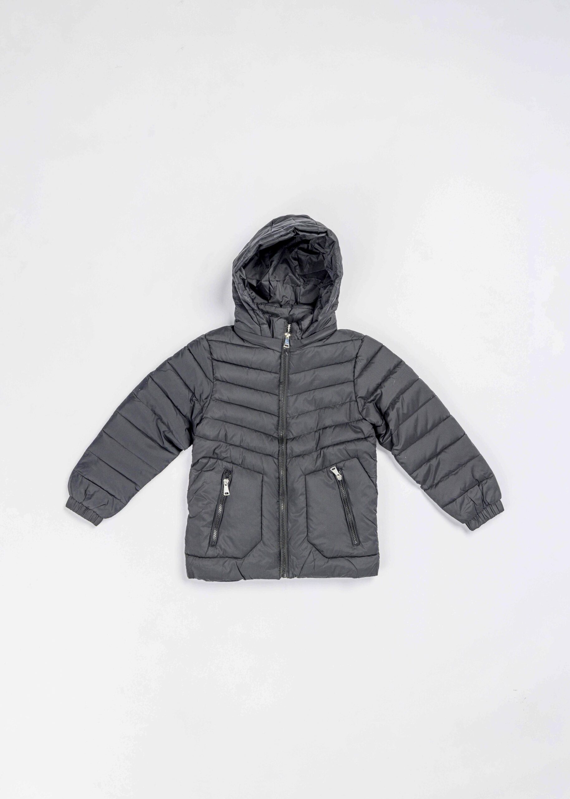 Kids boy jacket, waterproof, striped fabric, hood, front zipper closure, long sleeves with elastic cuff, front pockets with zipper closure, warm and practical