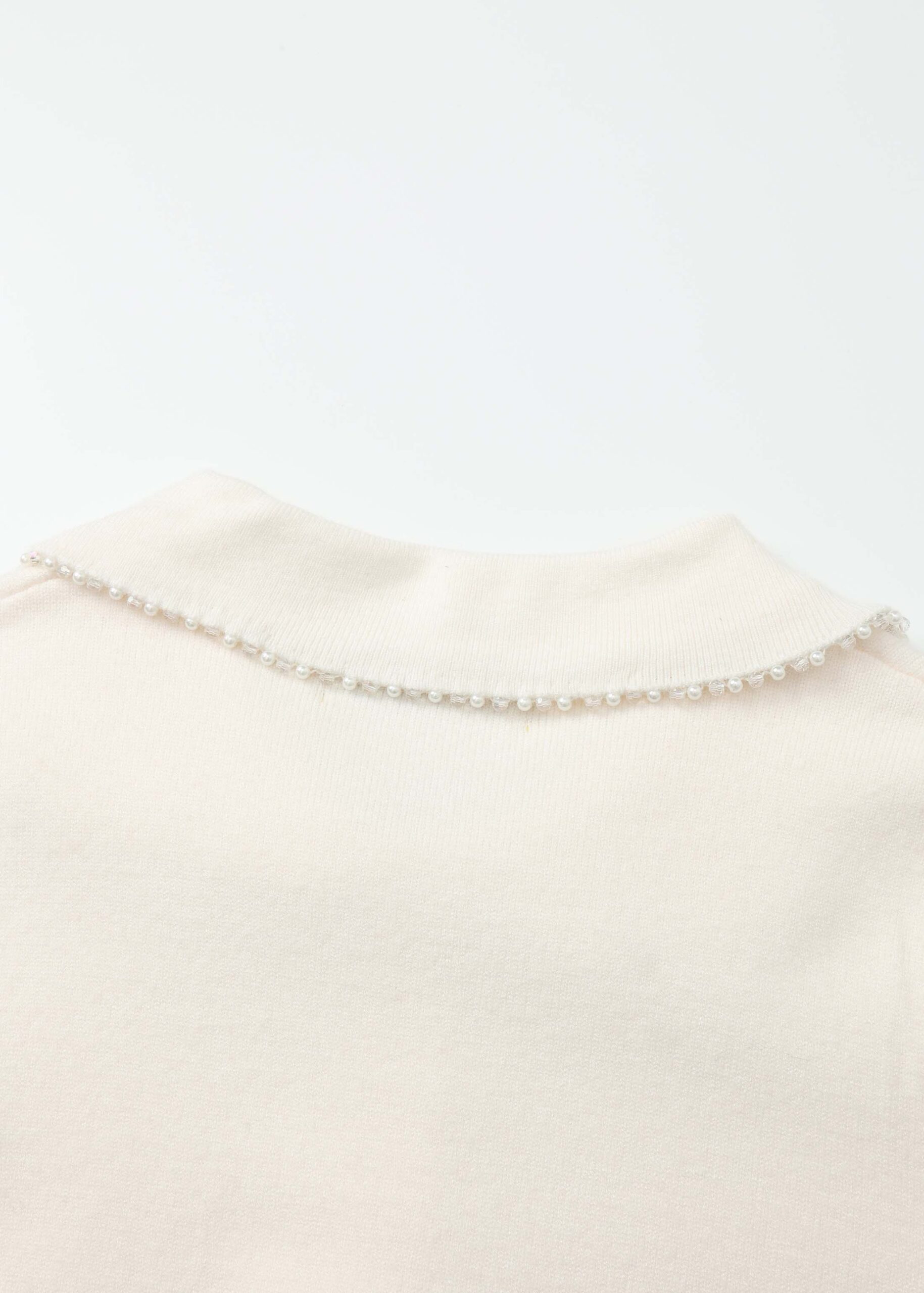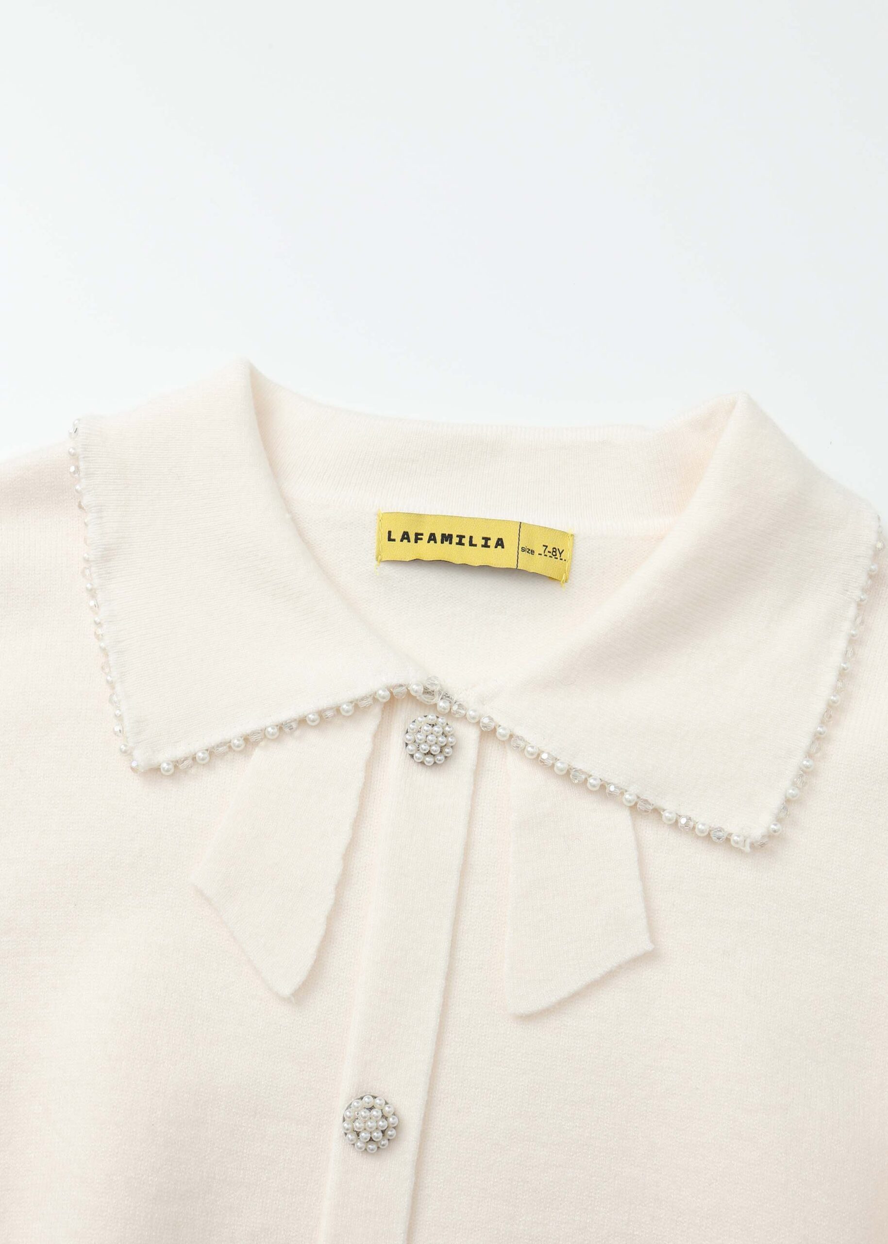 Kids girl blouse, knitted fabric, rolled collar with strass decor, front strass fake buttons, long sleeves with tight cuff, unique and modern