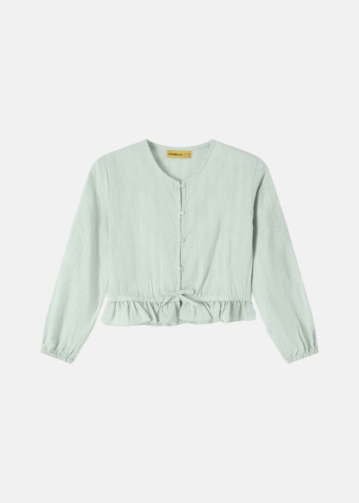 قميص اطفال بناتي, منقط, ياقة مدورة, ازرار من الامام للاغلاق, مزين بفيونكة من الامام مع طبقة كشكش, اكمام طويلة مع معصم مطاطي, انيق وعصري