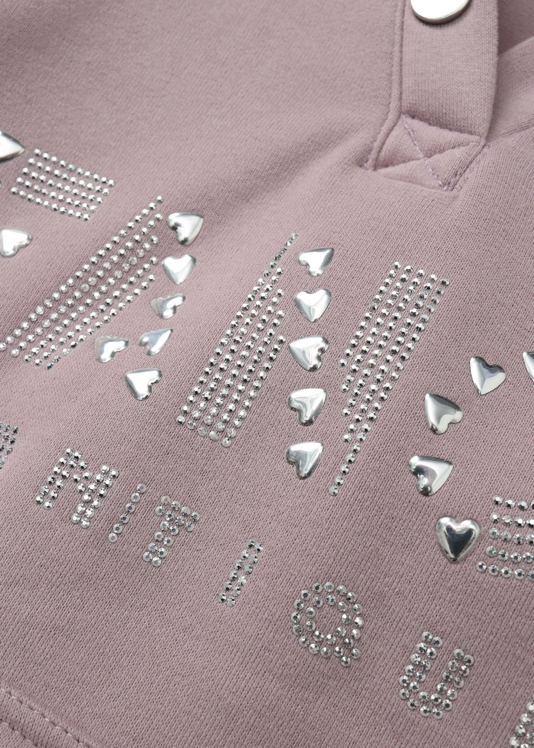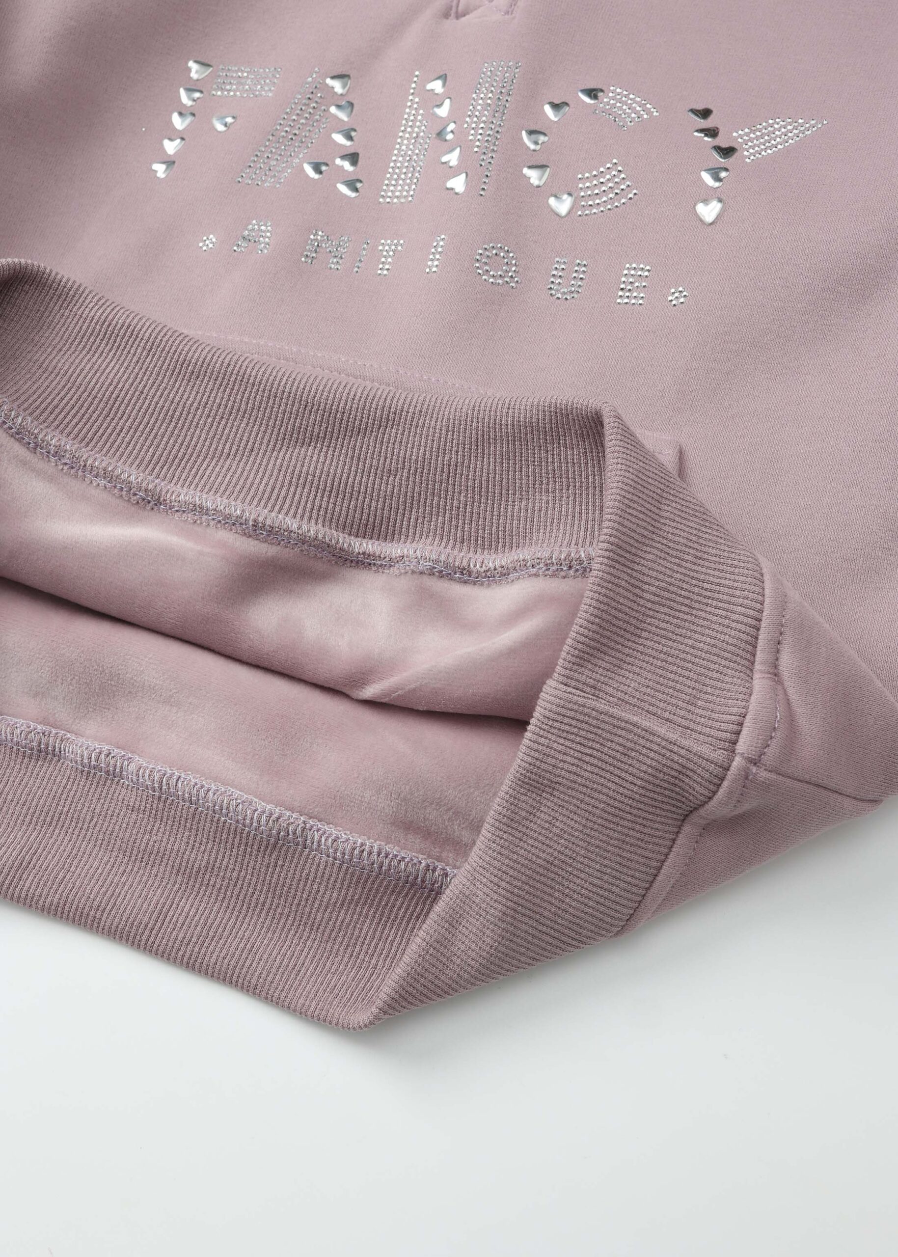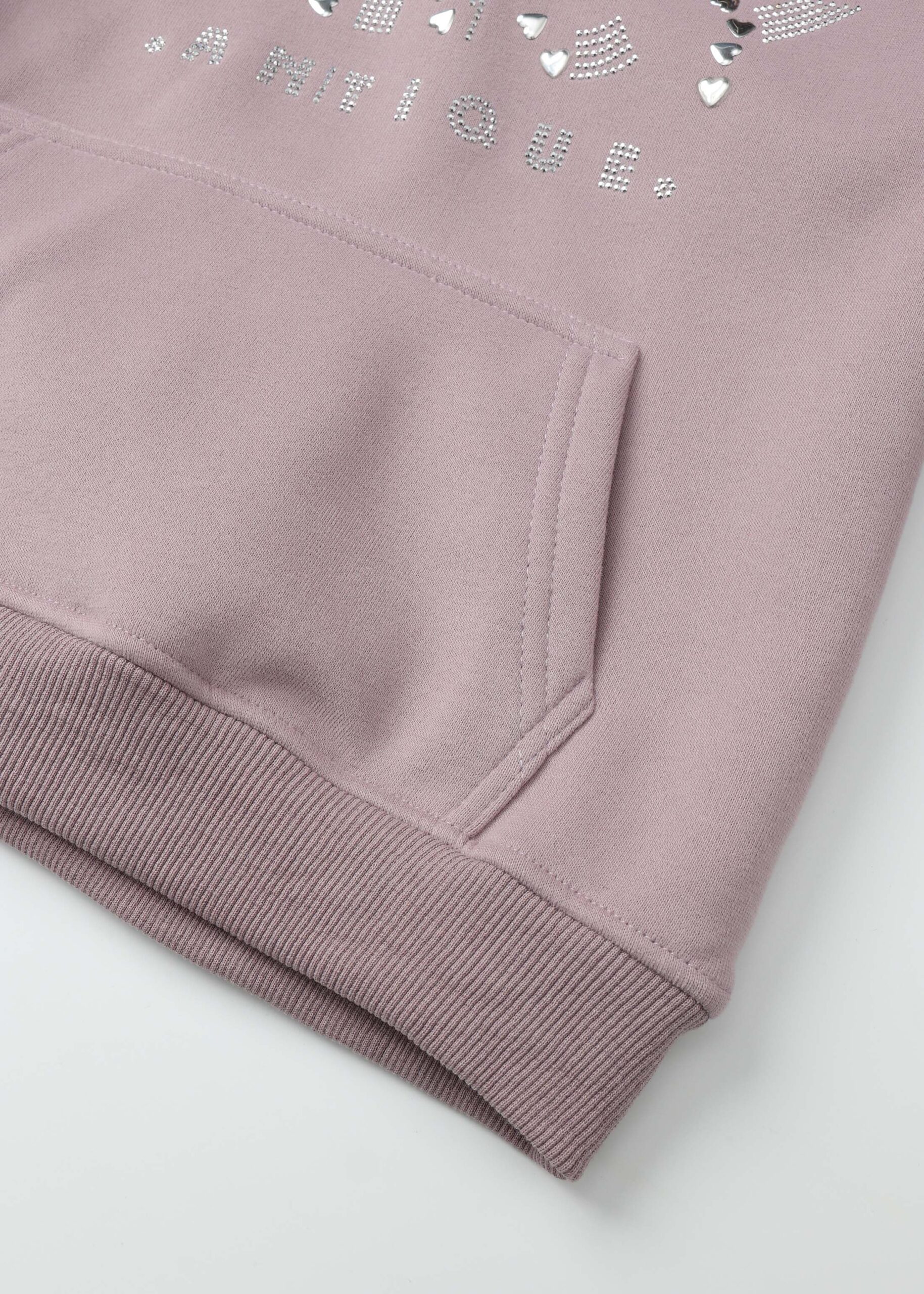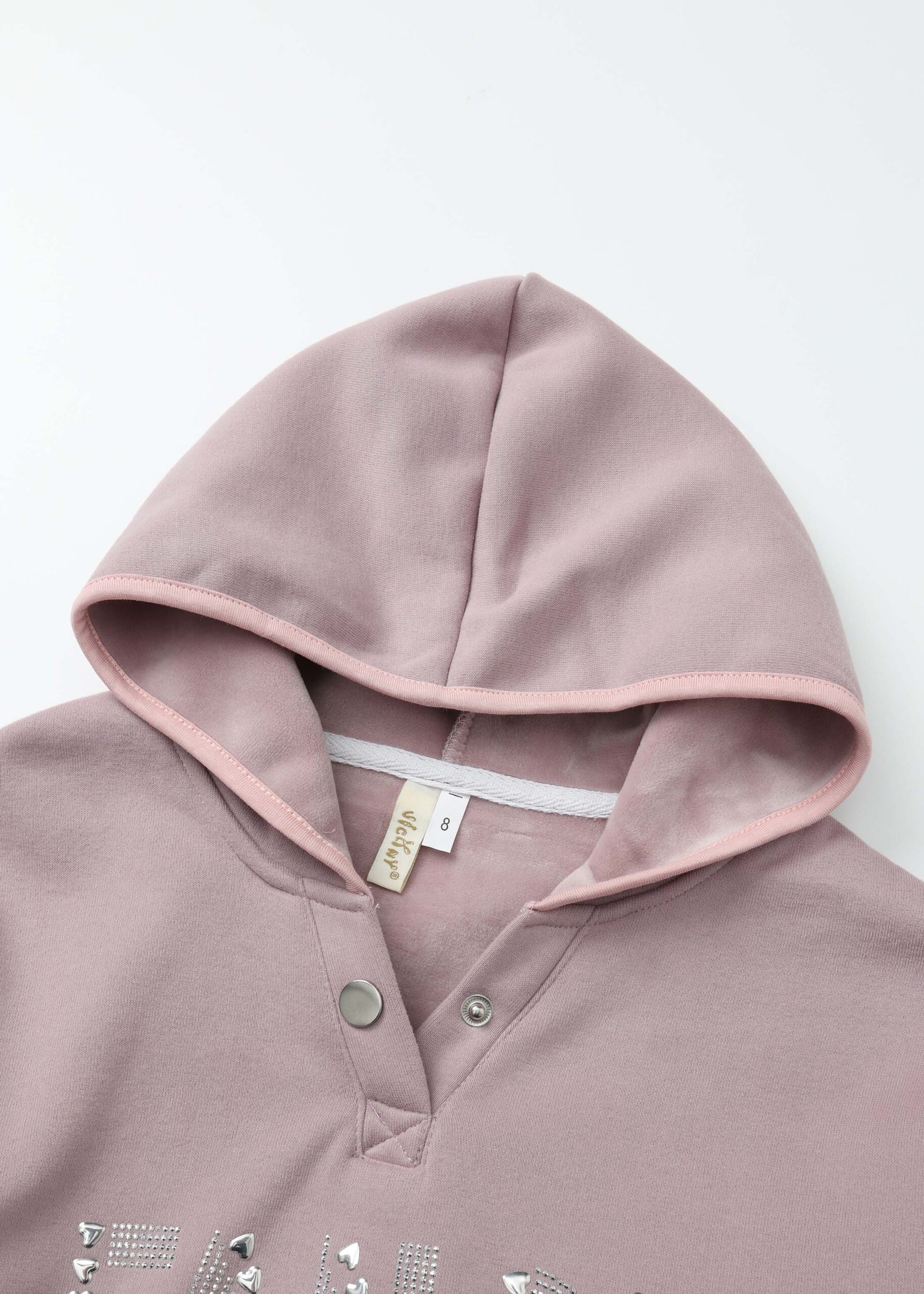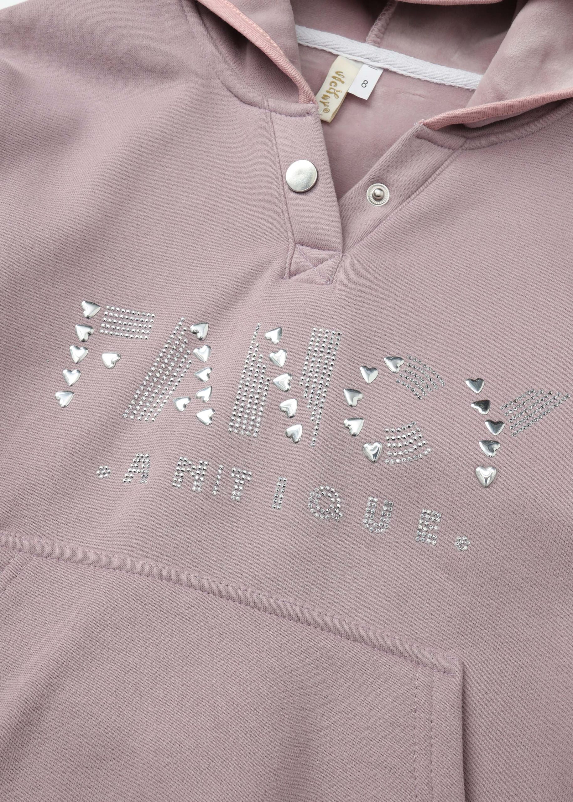 Kids girl hoodie, “Fancy” printed from the front with strass decor, front pocket, long sleeves with tight cuff, hood with front snap buttons, uniuqe and practical