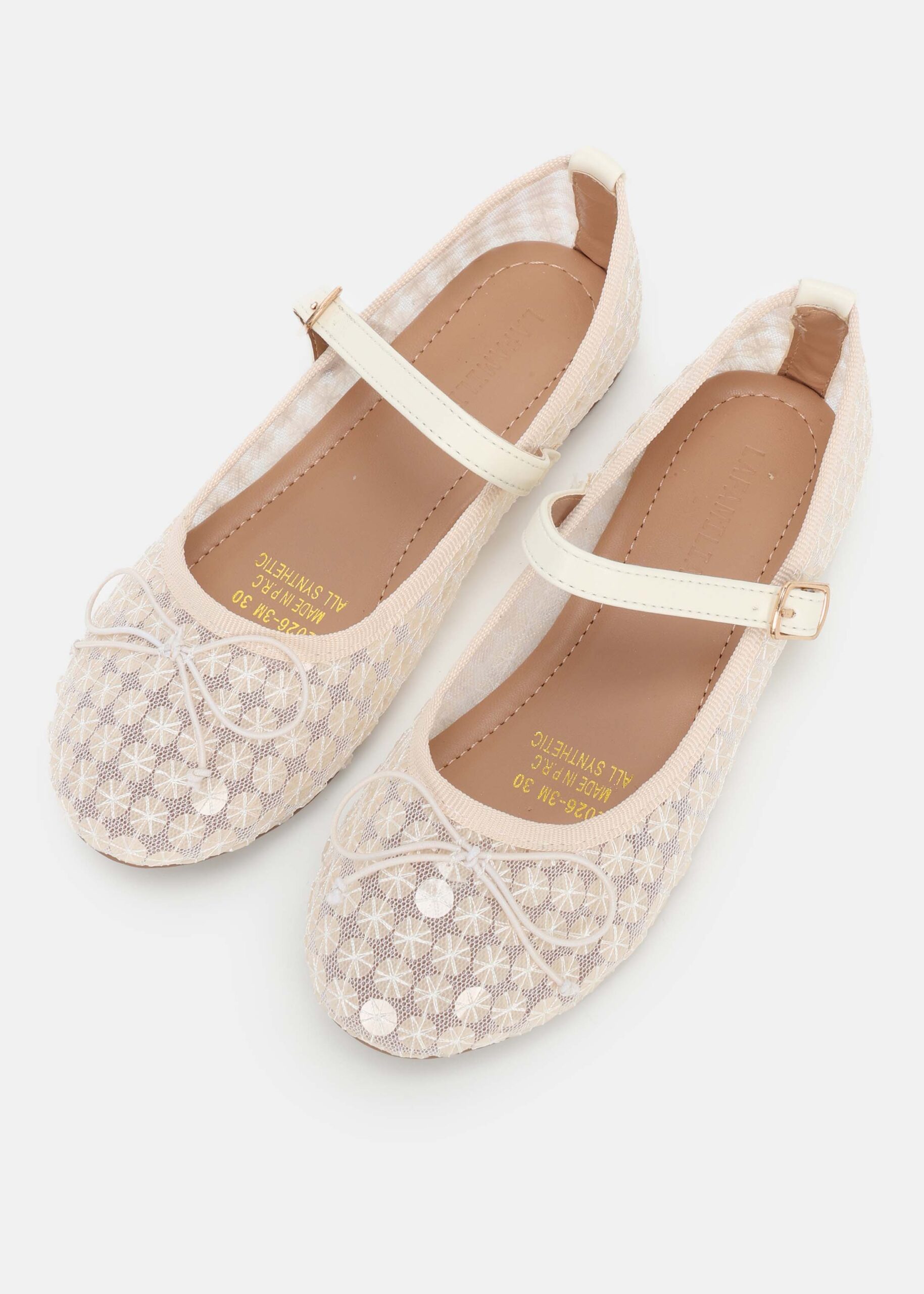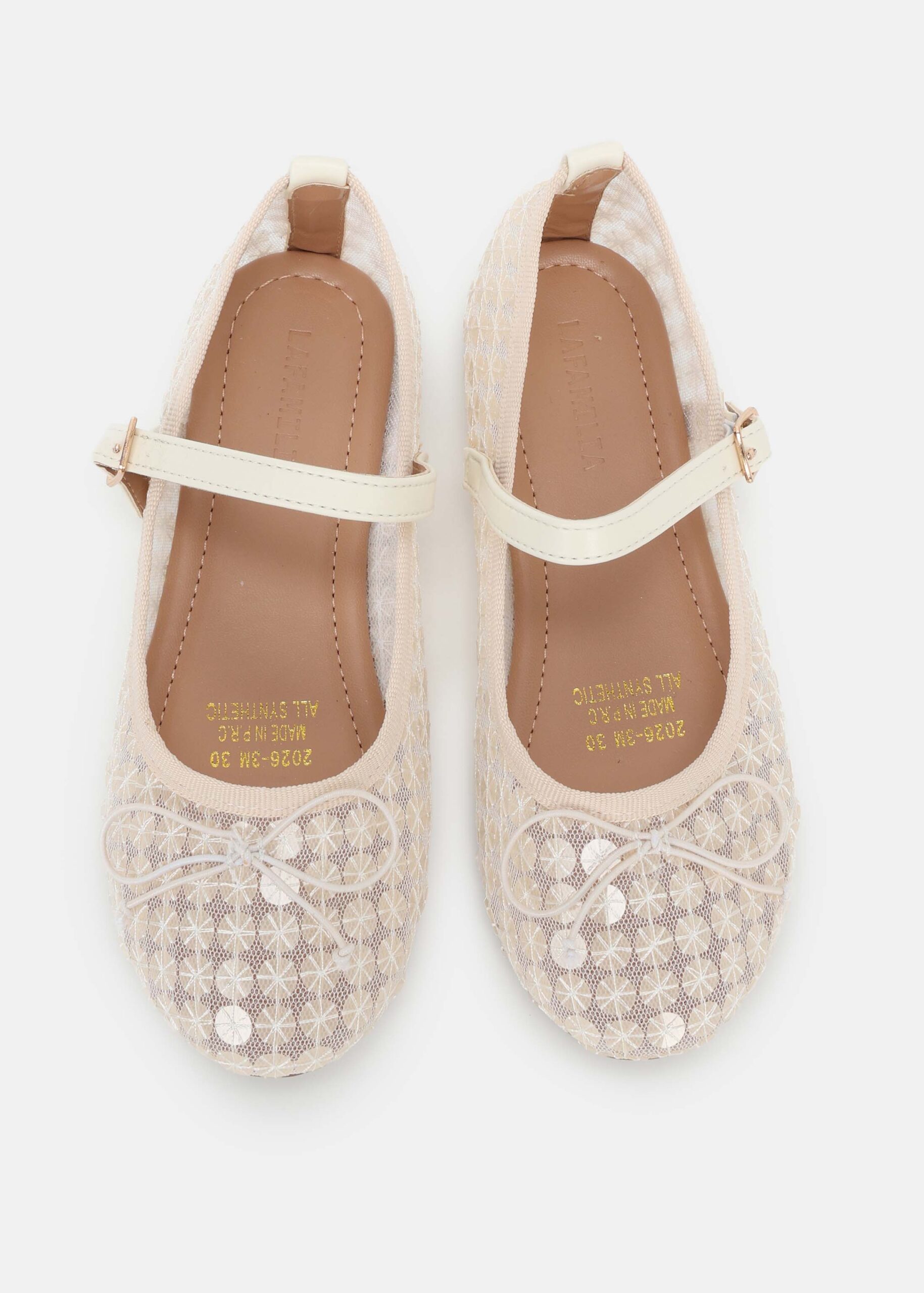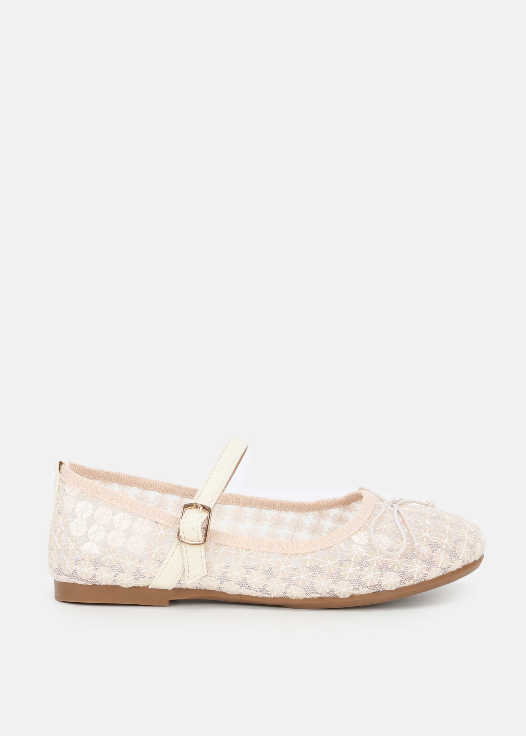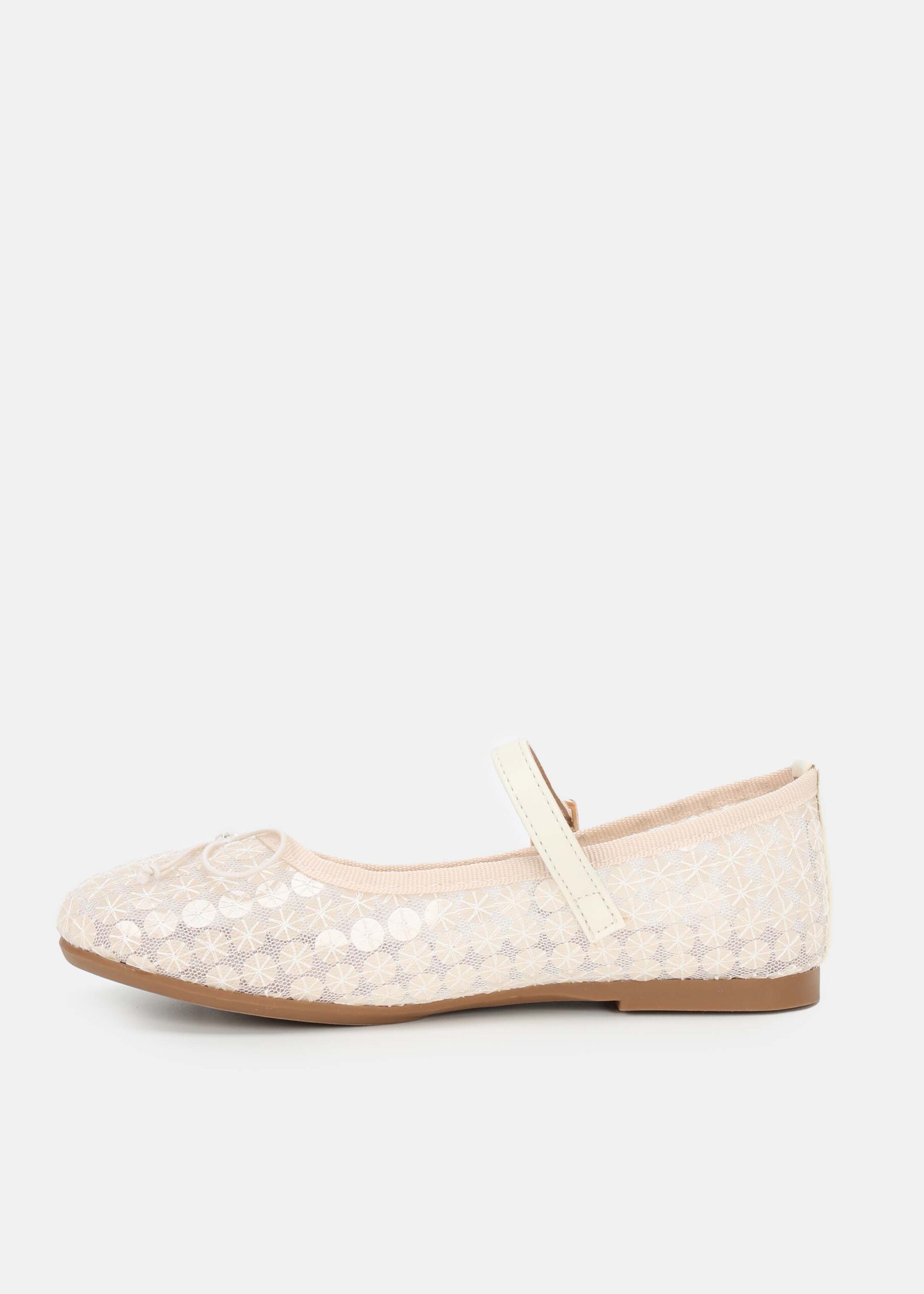 باليرينا اطفال بناتي, من الدانتيل المخرم المزين بقطع من الترتر, مقدمة مدورة, مزين بفيونكة من الاعلى, شريط علوي مع مشبك معدني من الجانب للاغلاق, انيق وعصري