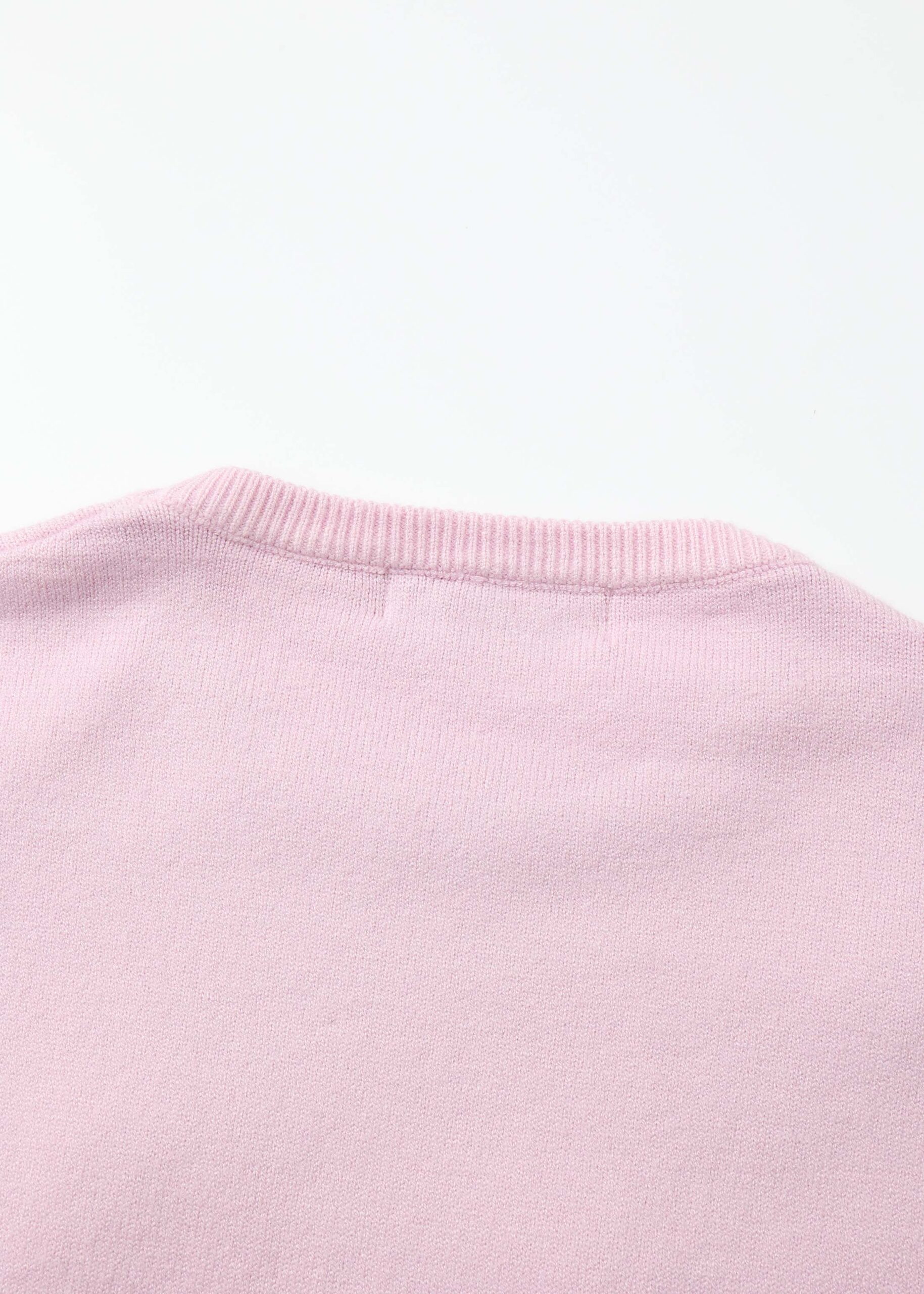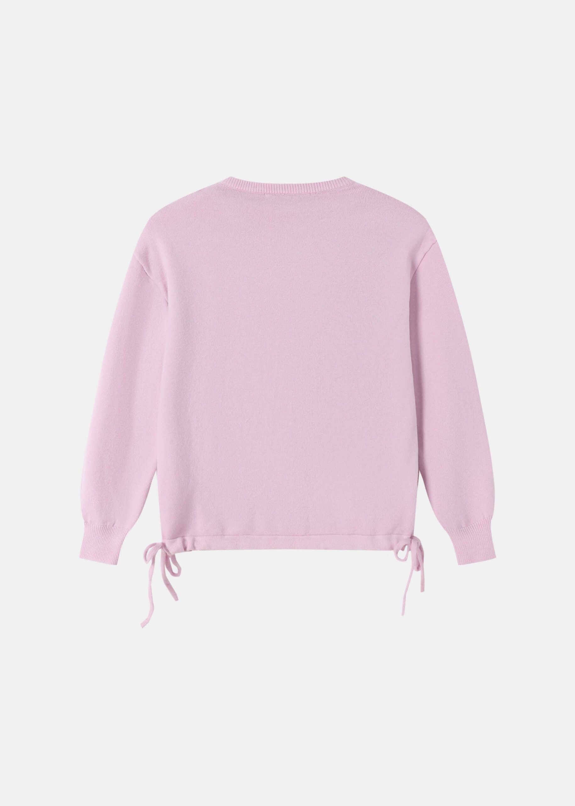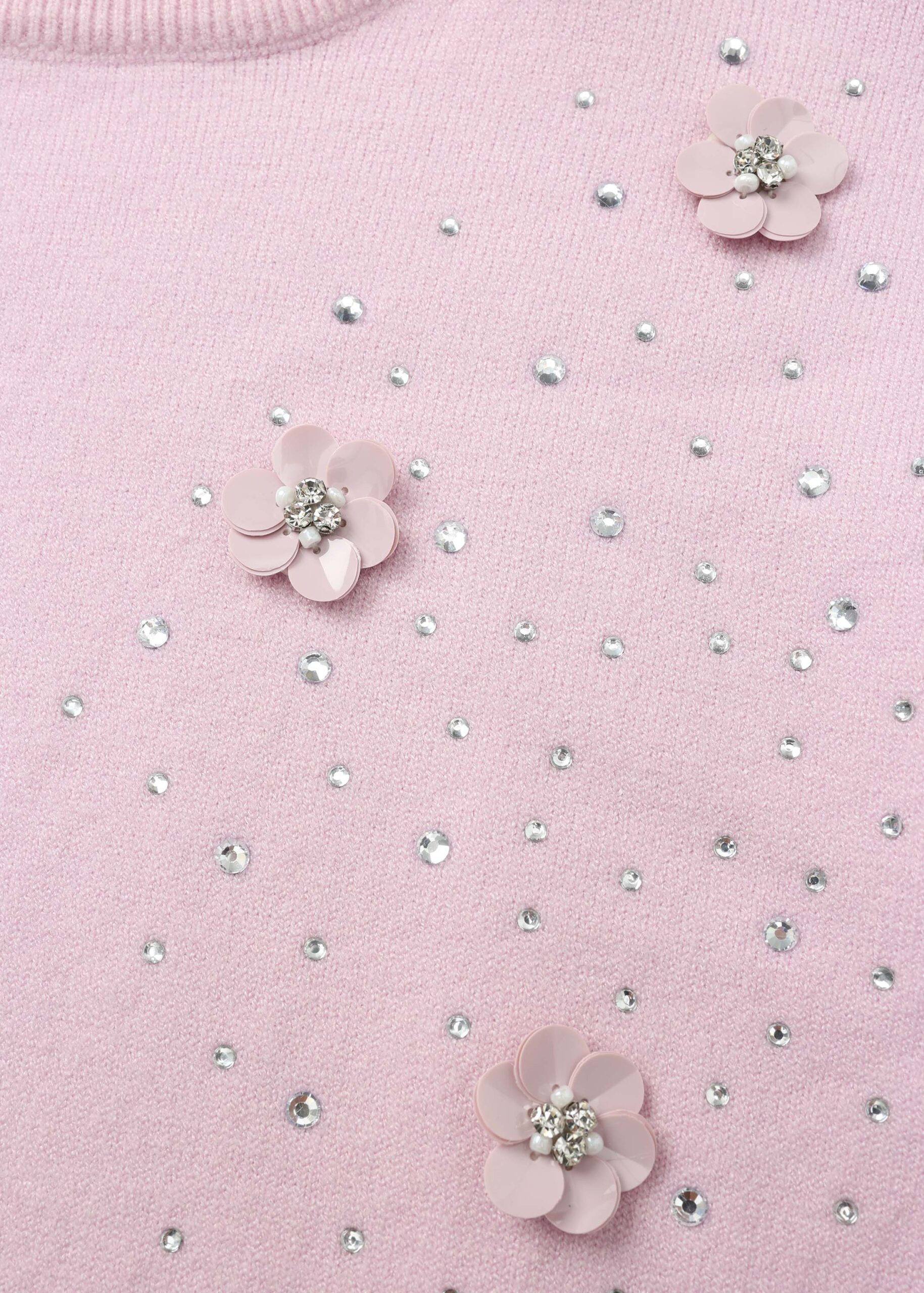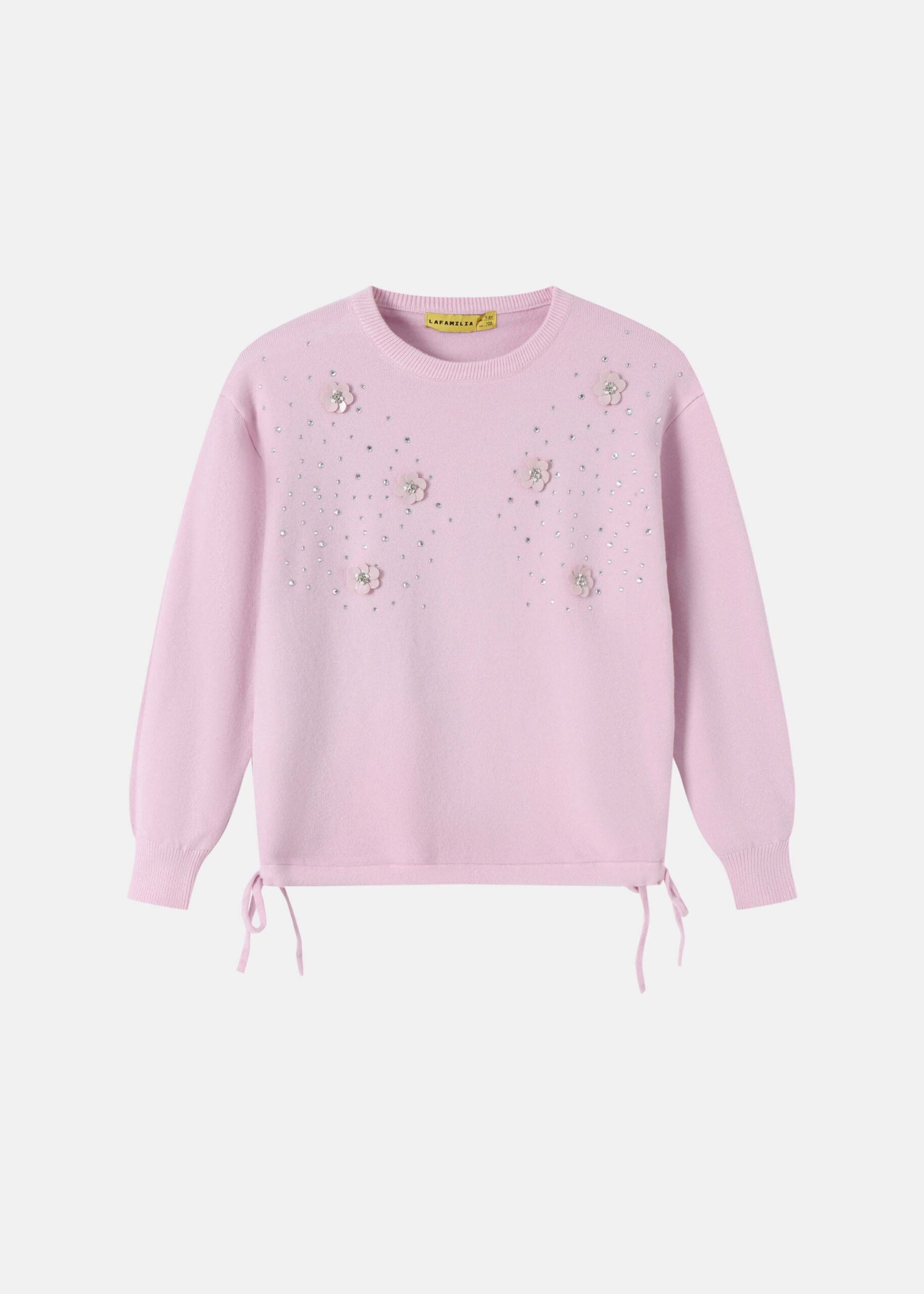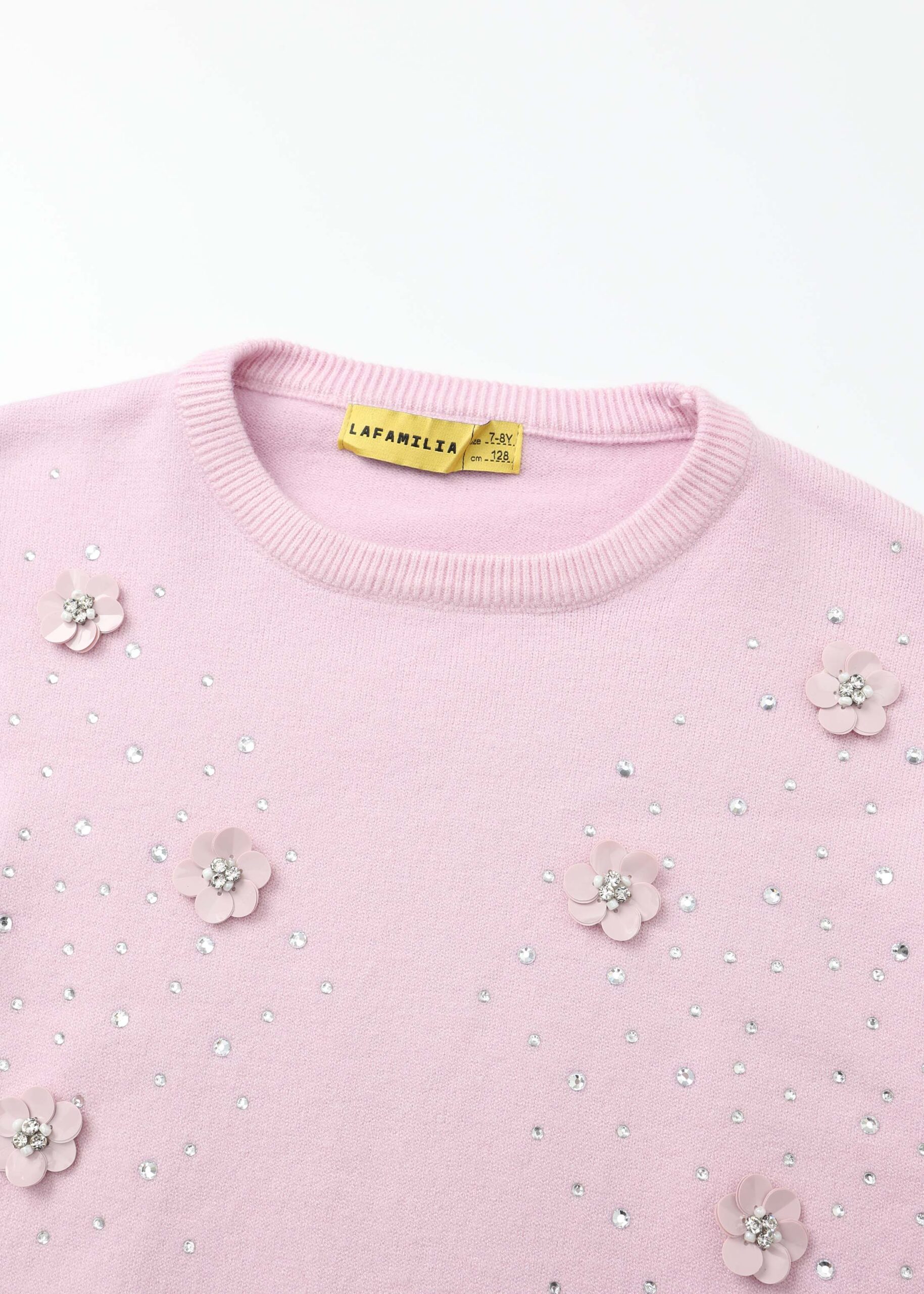 Kids girl blouse, knitted fabric, flowers and strass decor from the front, round neck, long sleeves with tight cuff, side ties, unique and warm