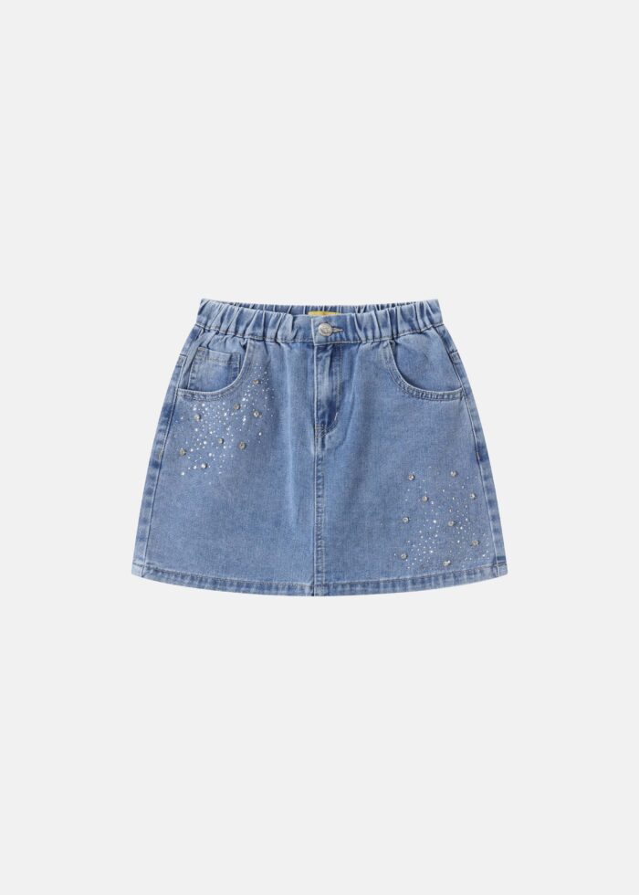تنورة اطفال بناتي, جينز, مزينة بالستراس, خصر مطاطي مع زر وسحاب من الامام للاغلاق, جيوب من الامام, انيقة وعصرية