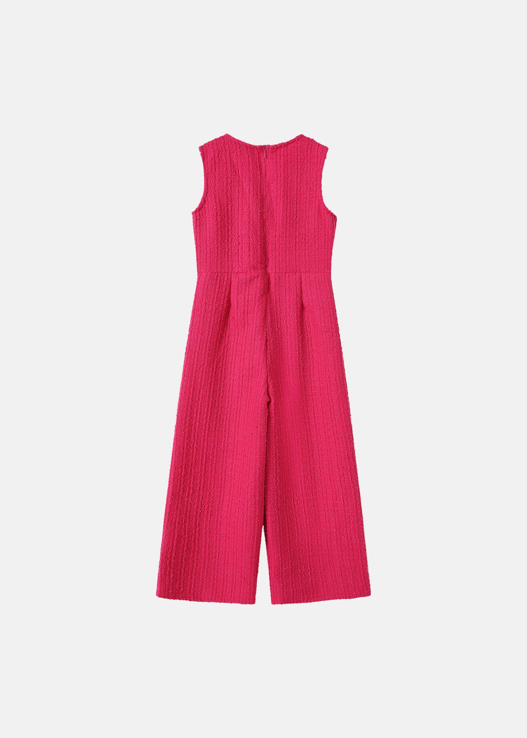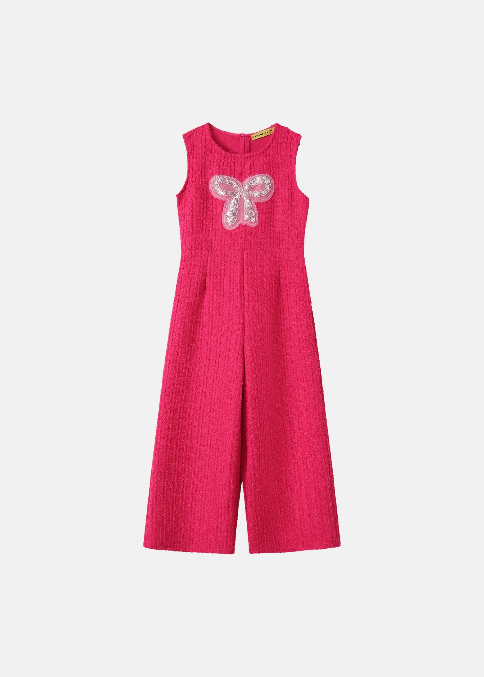 Kids girl jumpsuit, knitted fabric, round neck, back zipper closure, sleeveless, wide-leg trouser, front bow decor, unique and modern