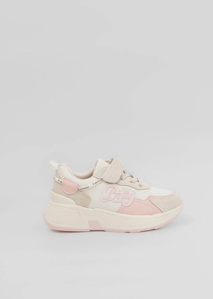 حذاء اطفال بناتي, رياضة, جلد وشامواه, مقدمة مدورة, نعل مطاطي, رباط مطاطي مع شريط لاصق للاغلاق, طباعة “pretty” انيق ومريح