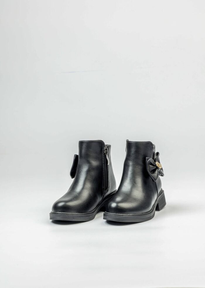 جزمة اطفال بناتي, جلد, مقدمة مدورة, نعل مطاطي, سحاب من الجانب للاغلاق, مزينة بفيونكة من الجانب, انيقة وعملية