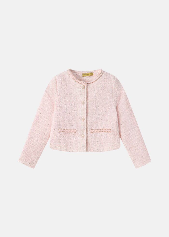 جاكيت اطفال بناتي, بنقش مزين بالستراس, ياقة مدورة مزينة بتطريز, ازرار من الامام للاغلاق, اكمام طويلة, جيوب وهمية من الامام, انيق وعصري