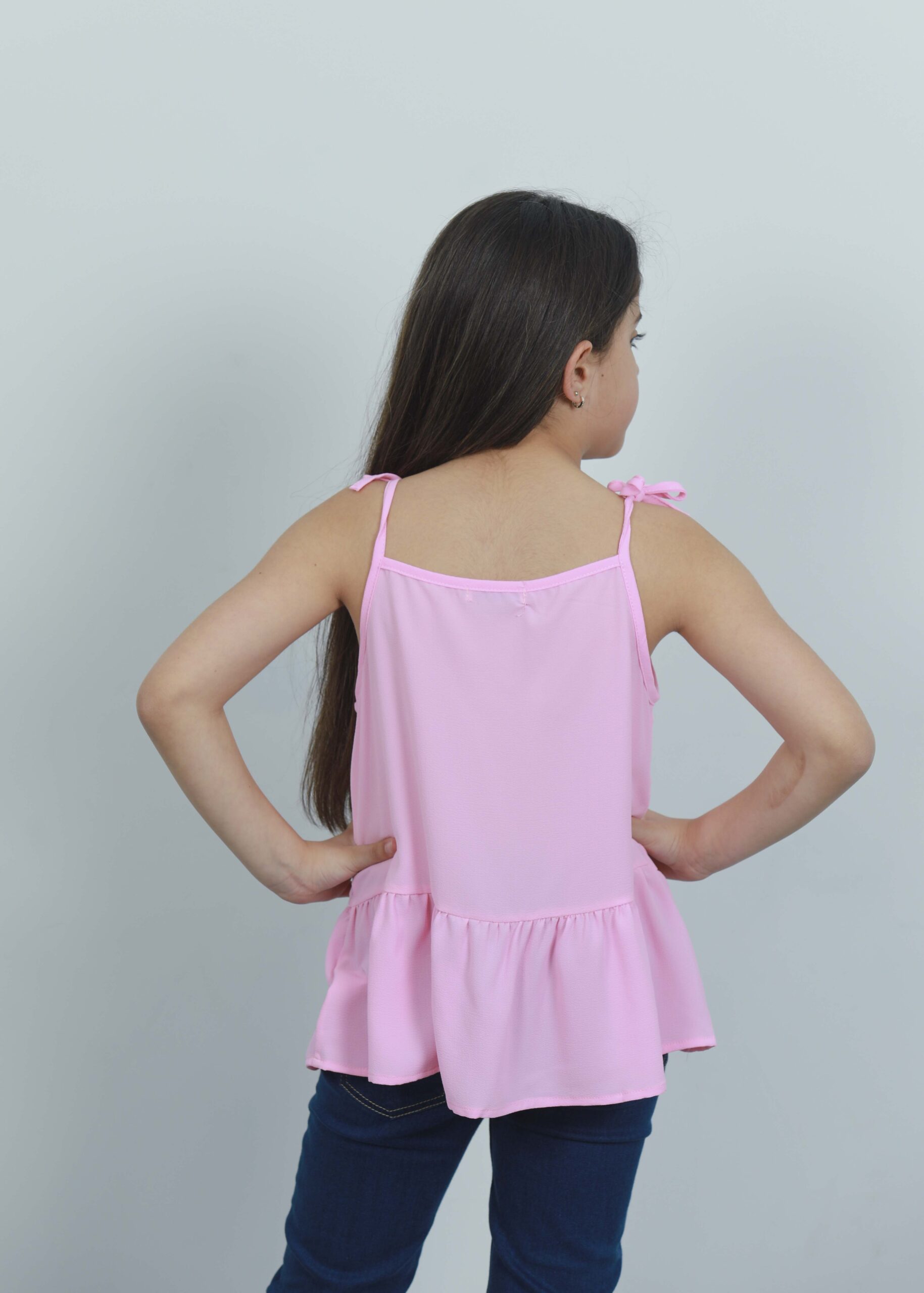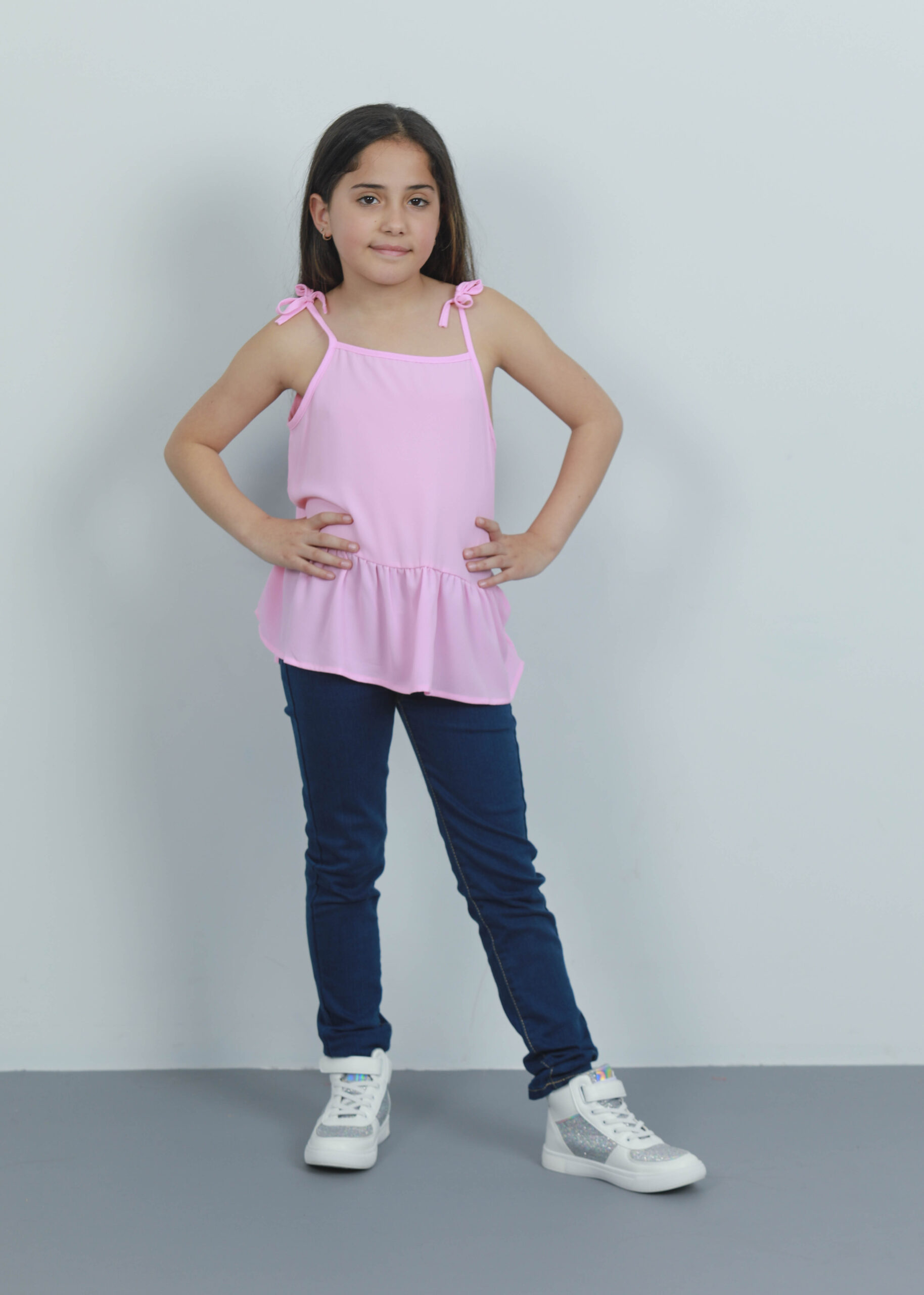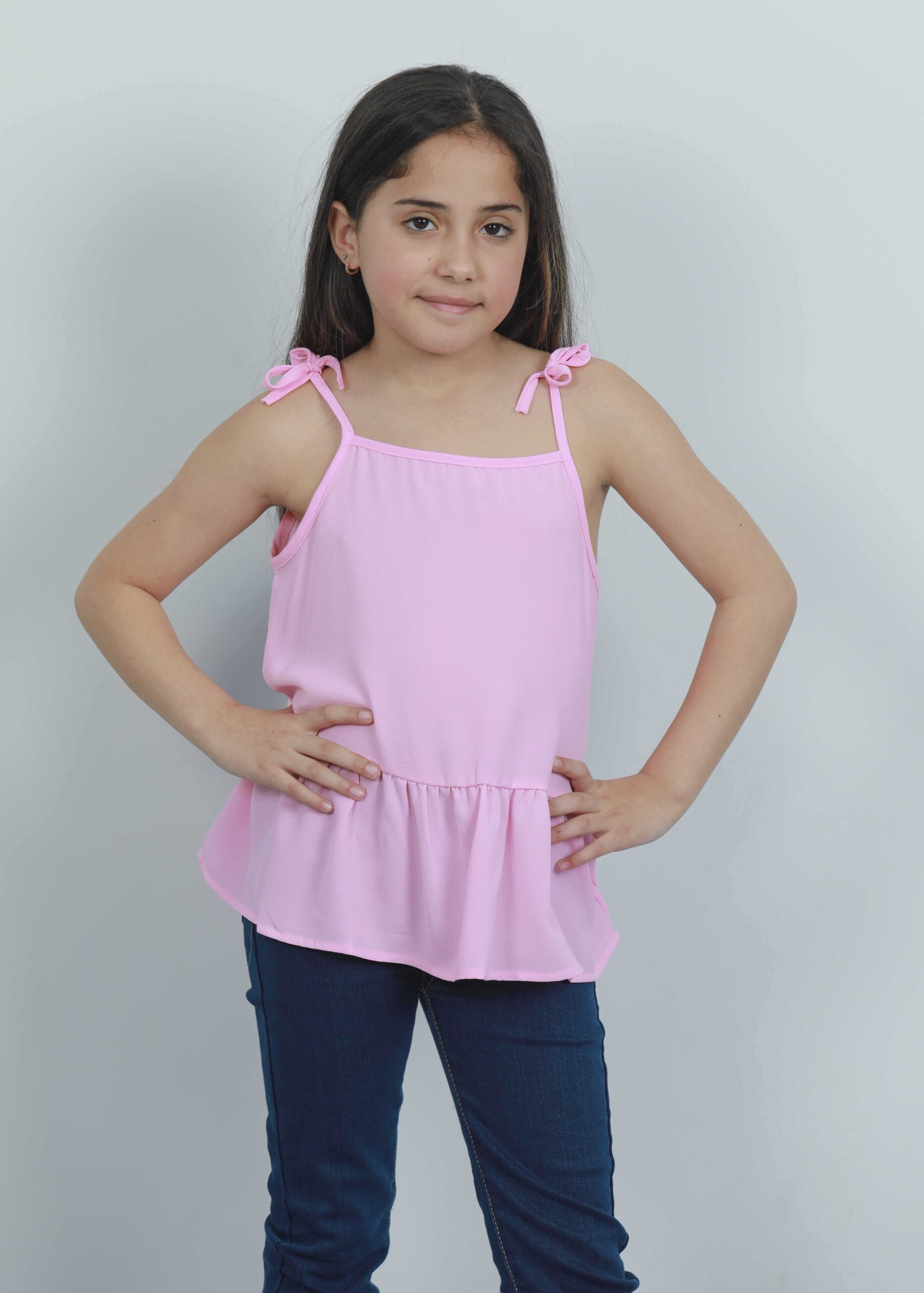 بلوزة اطفال بناتي, سادة, ياقة مربعة, بدون اكمام مع اشرطة كتف للربط, طبقة كشكش من الاسفل, انيقة ومميزة, 100% بوليستر