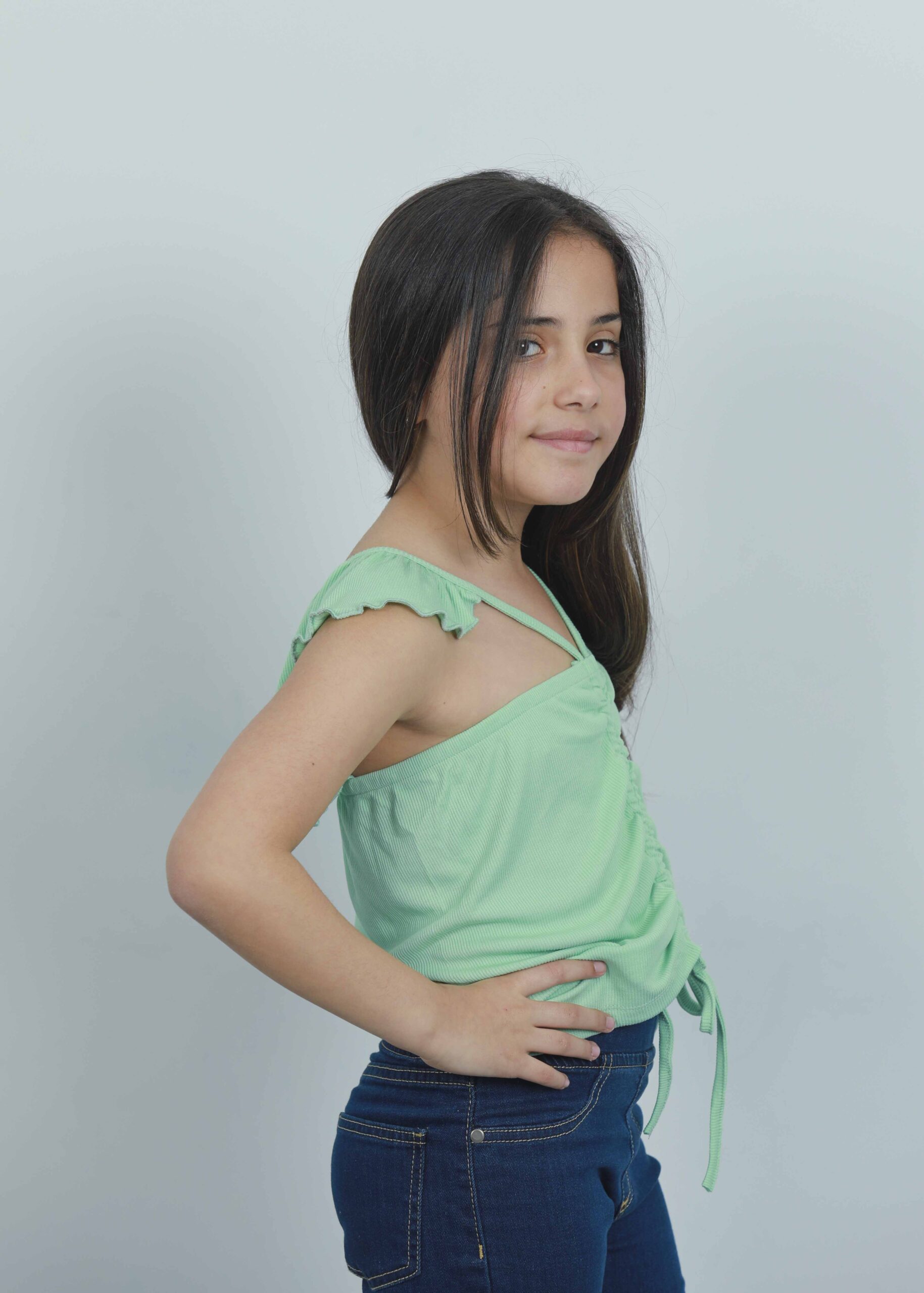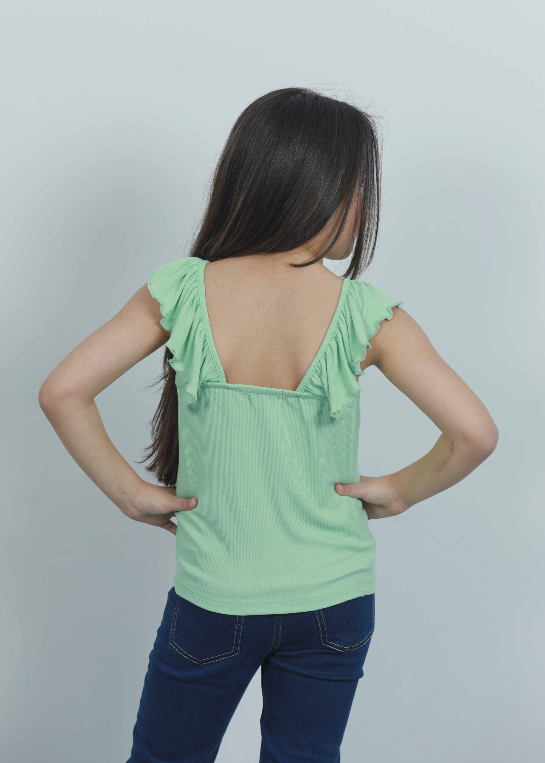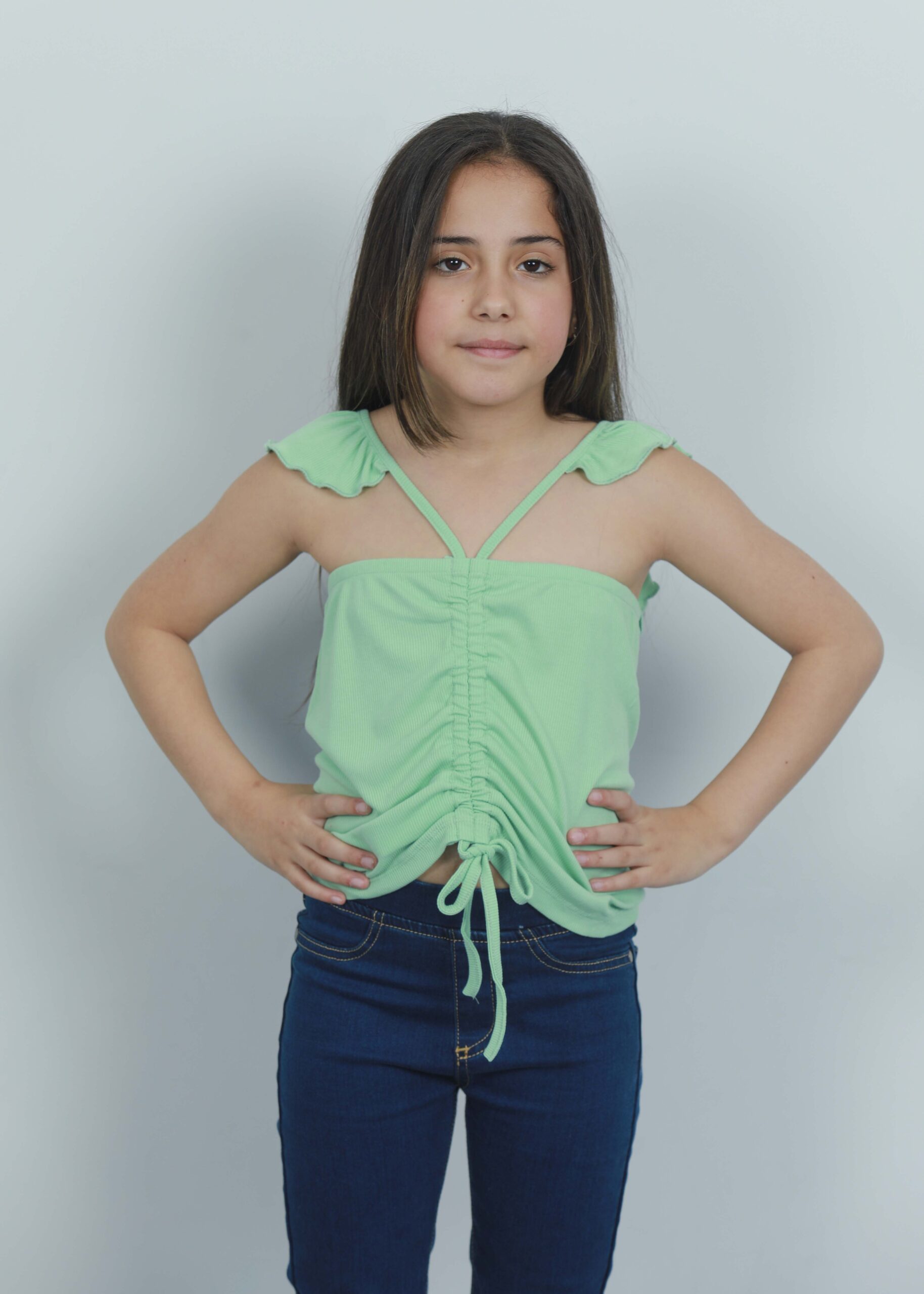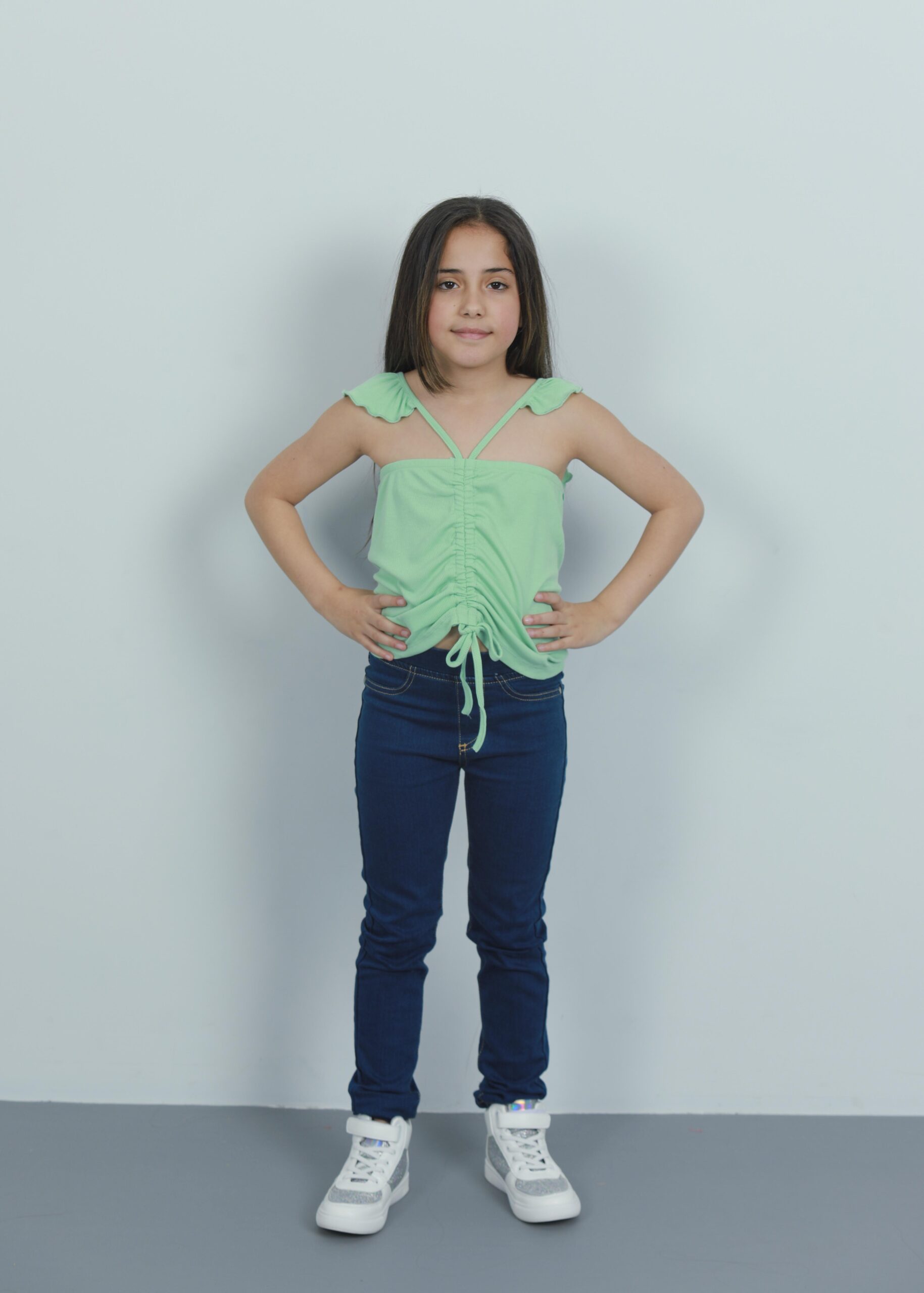 توب اطفال بناتي, سادة, تصميم مطاطي من المنتصف مع حبل قابل للتعديل والربط من الاسفل, بدون اكمام, اشرطة كتف مزينة بكشكش, انيقة ومميزة