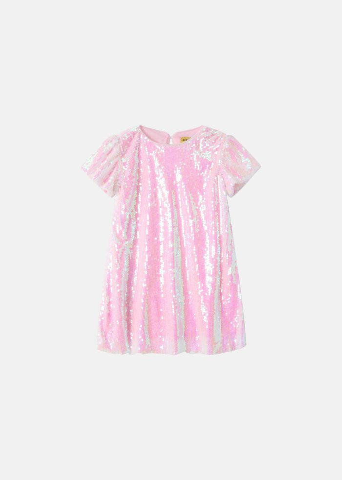 فستان اطفال بناتي, نسيج مزين بالترتر, ياقة مدورة مع زر من الخلف, اكمام قصيرة, انيق وعصري