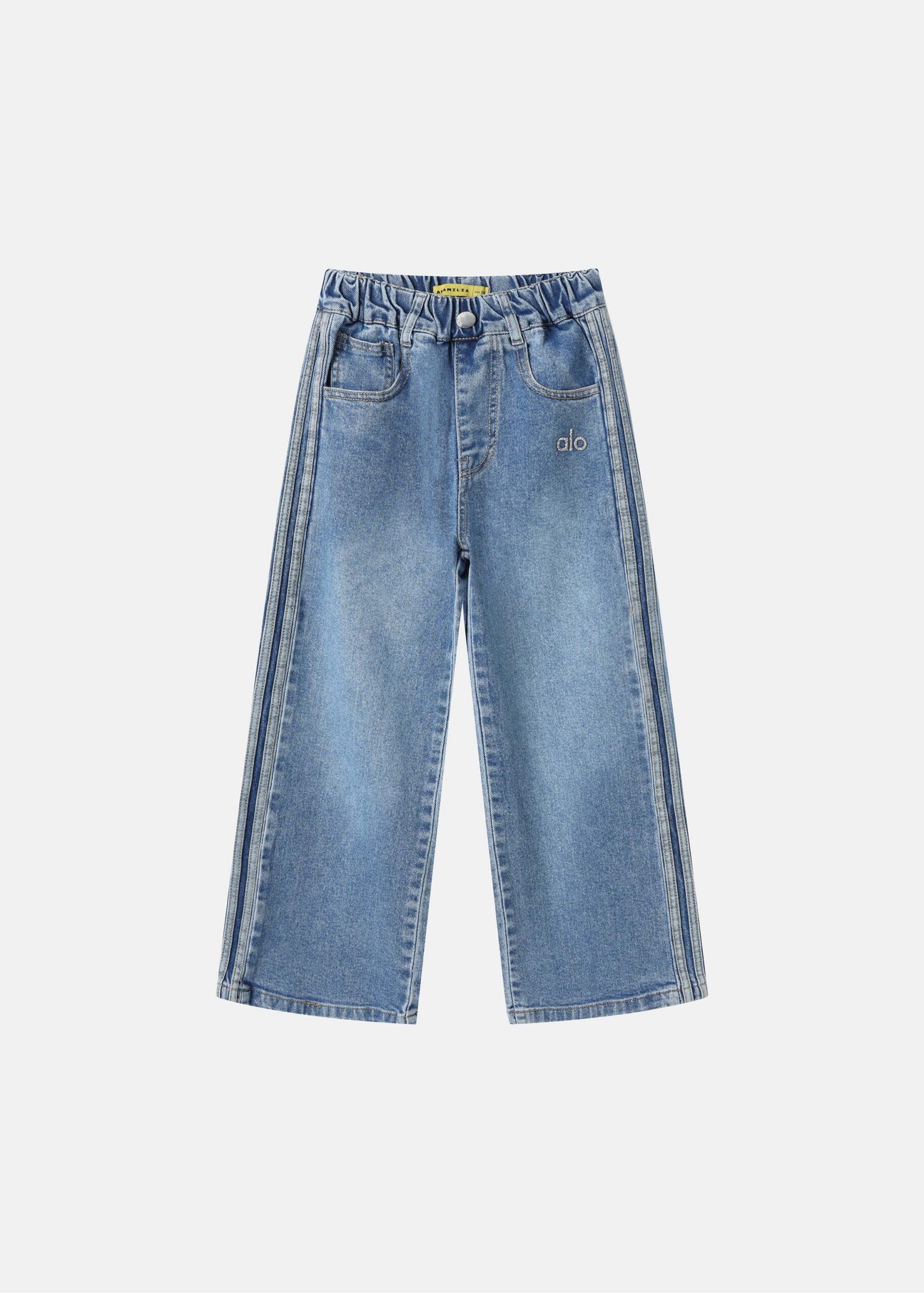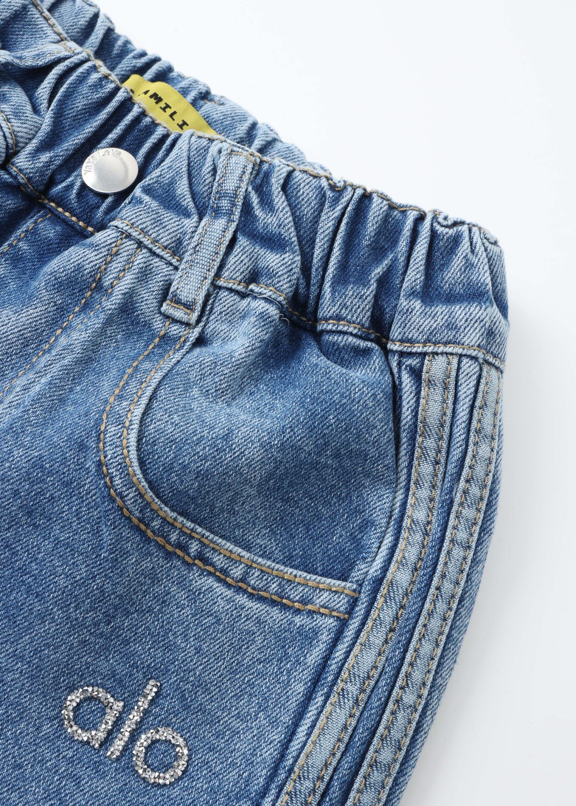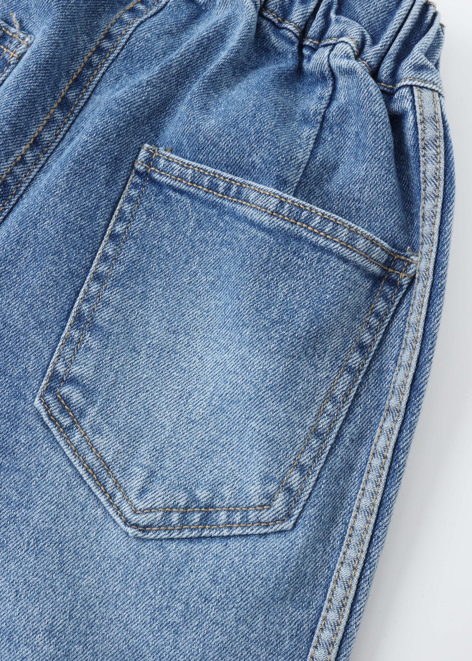 بنطلون اطفال بناتي, جينز, ساق مستقيمة,مخطط من الجانبين, خصر مطاطي, تصميم زر وسحاب وهمي من الامام, جيوب من الامام والخلف, انيق وعصري