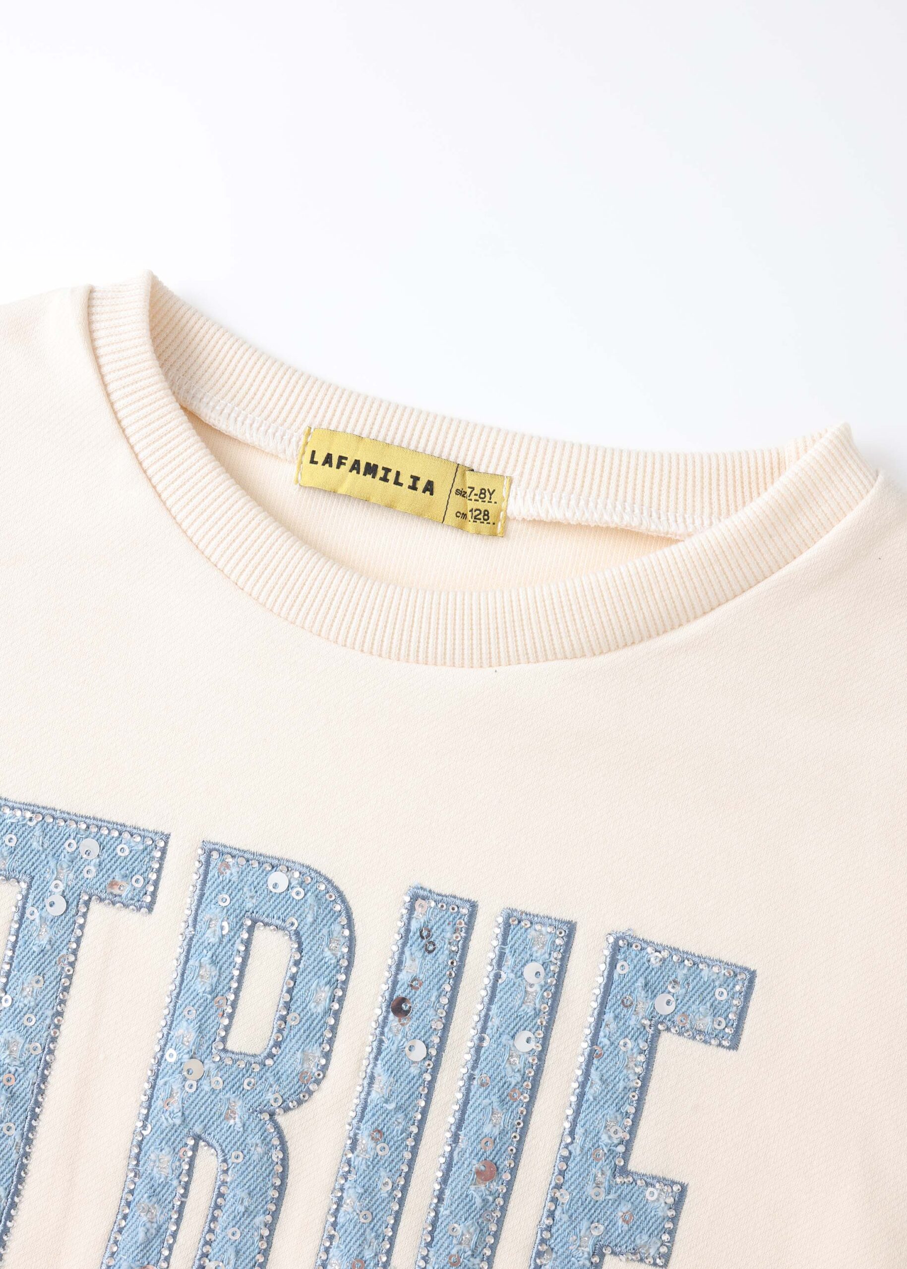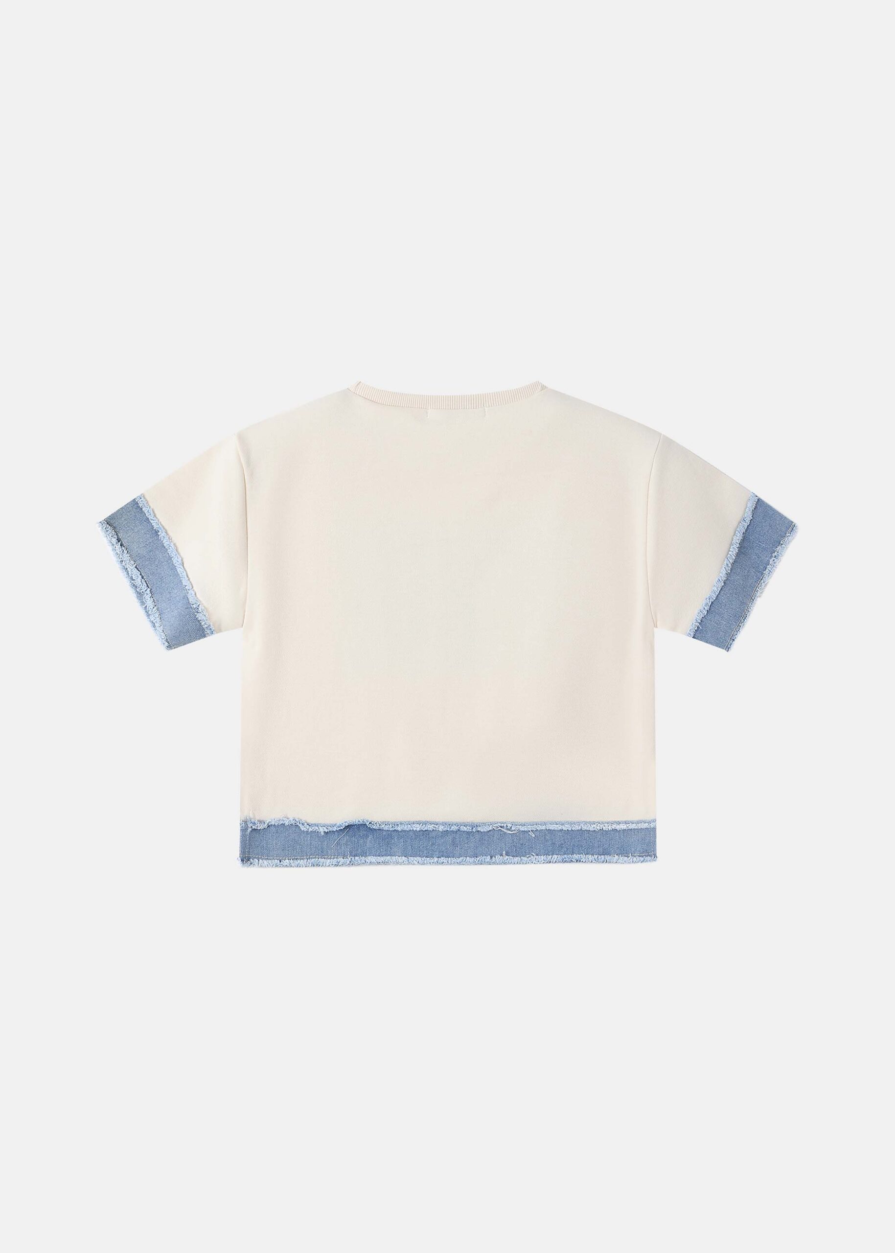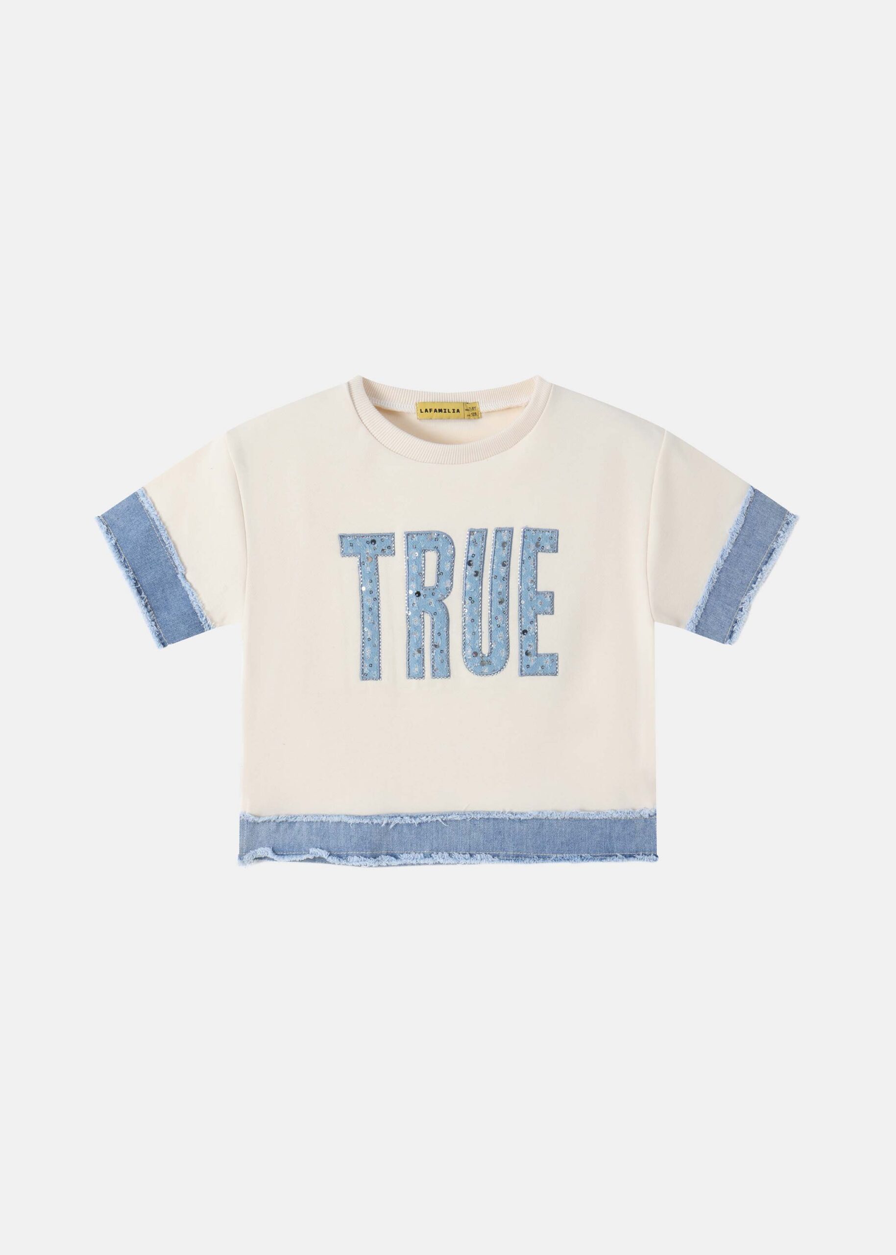 Kids girl t-shirt, two-tone, denim trim details, “True” printed from the front, round neck, short sleeves, unique and modern