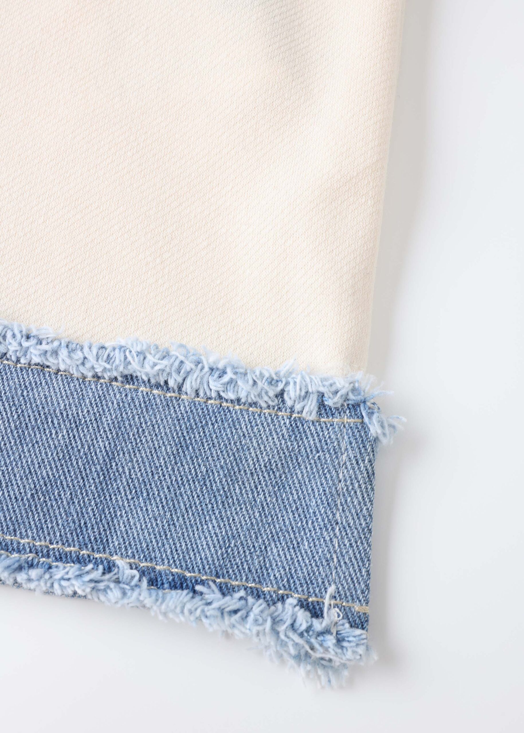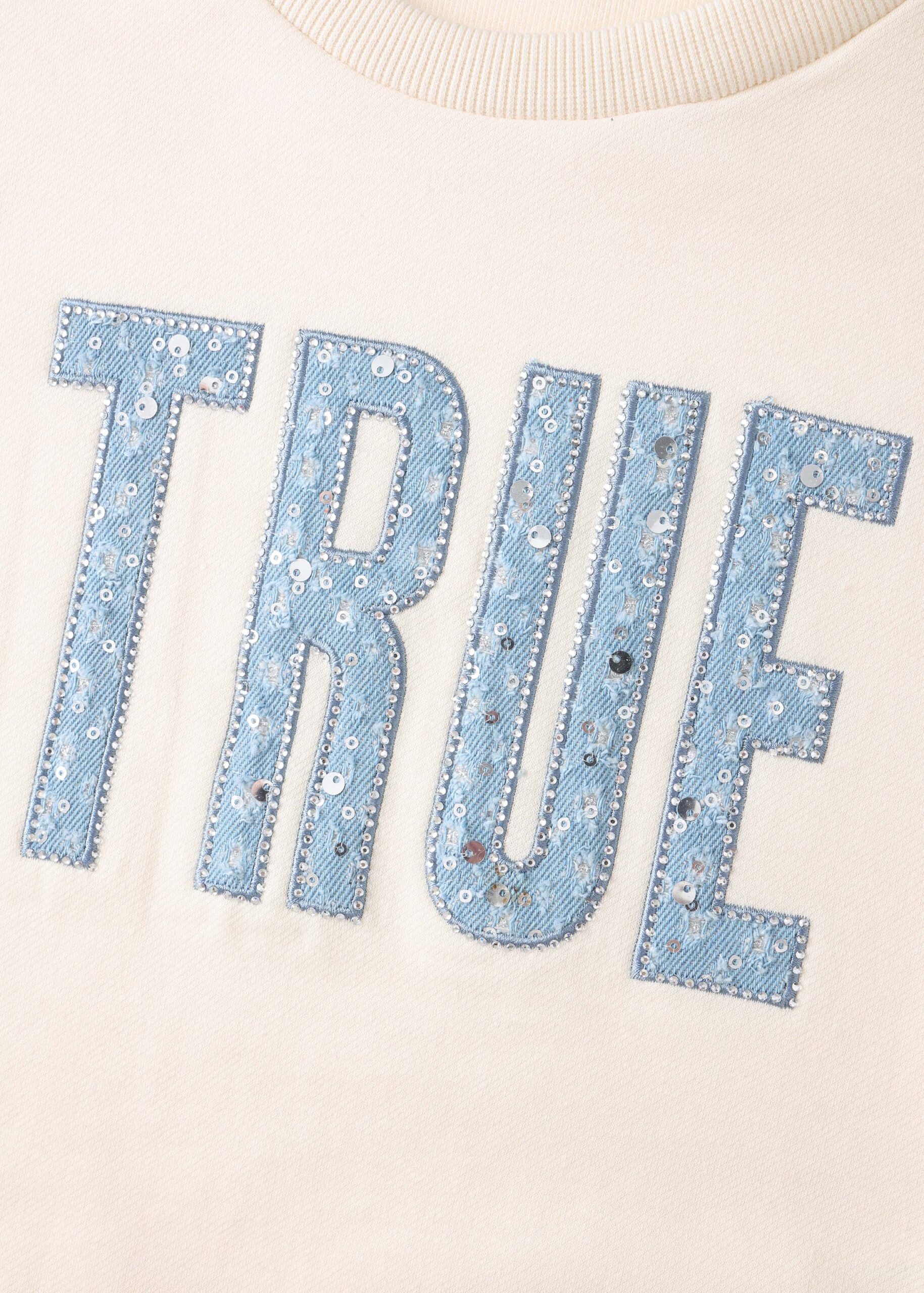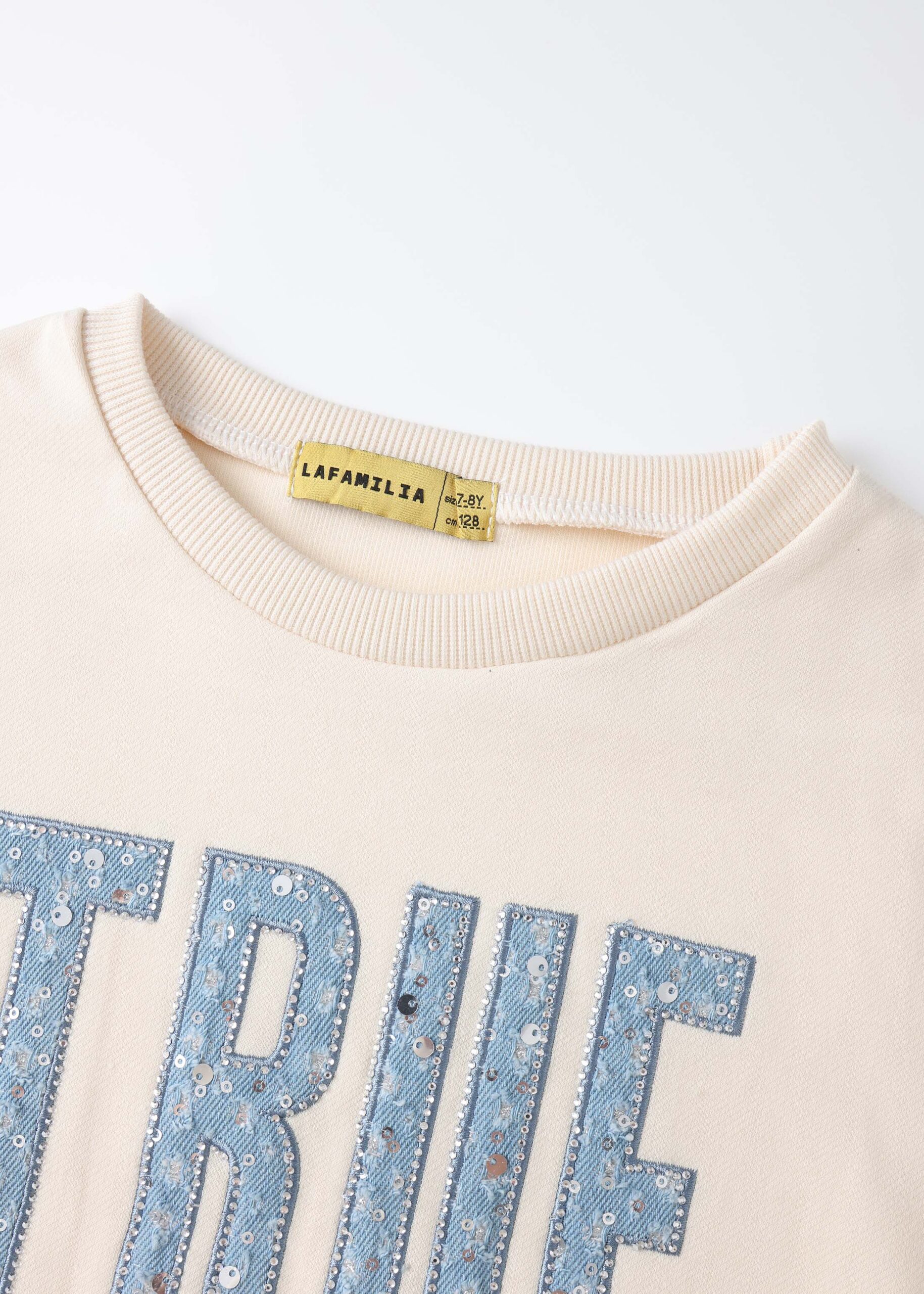 Kids girl t-shirt, two-tone, denim trim details, “True” printed from the front, round neck, short sleeves, unique and modern