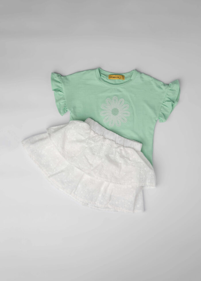طقم اطفال بناتي, قطعتين, بلوزة, طباعة وردة من الامام, ياقة مدورة, اكمام قصيرة مع اكتاف كشكشك, تنورة, قصيرة, كشكش طبقات, خصر مطاطي, مطرزة, انيقة وعصرية