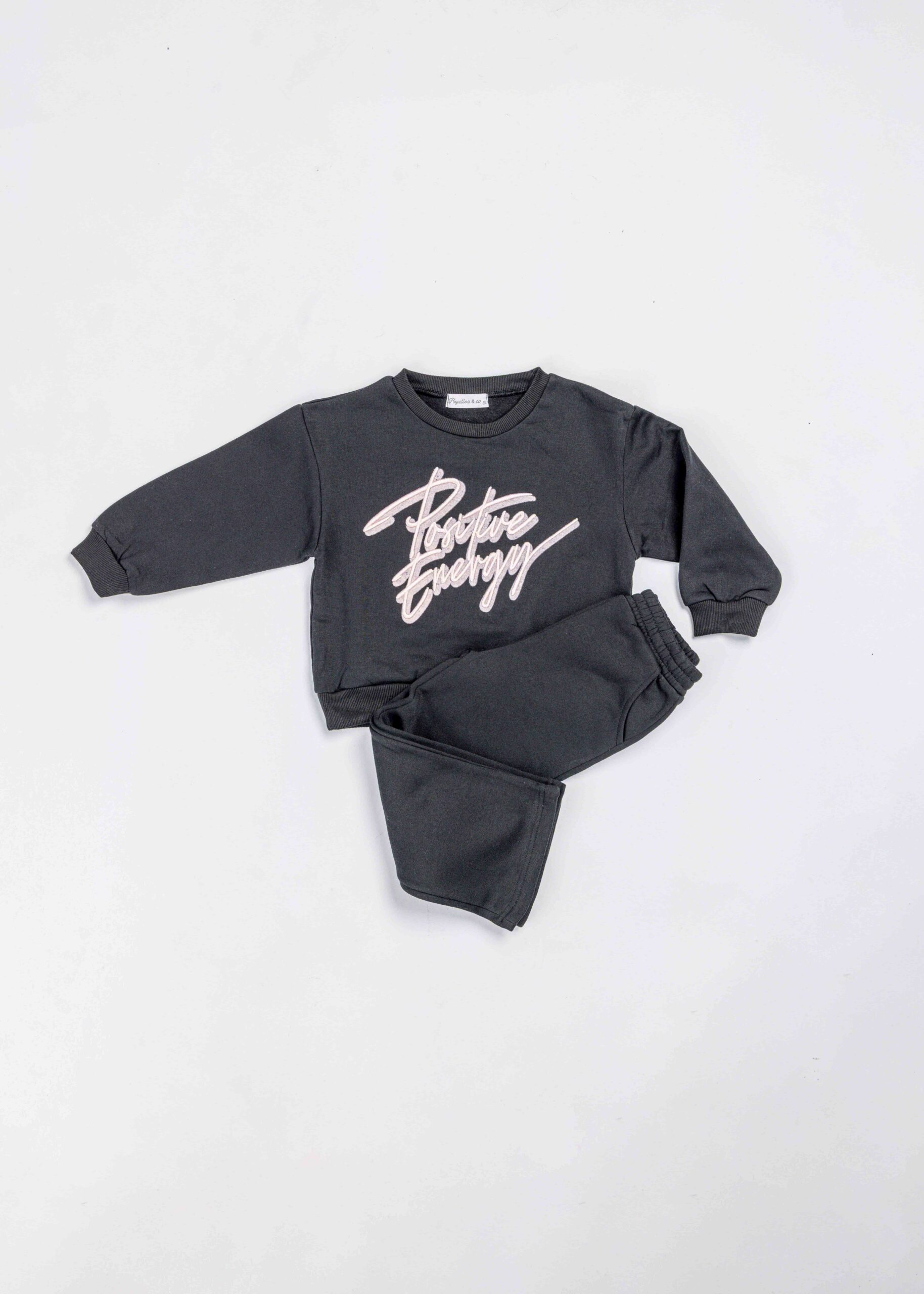 Kids girl suit, two-pieces, blouse, “Positive Energy” printed from the front, round neck, long sleeves with tight cuff, trouser, elastic wasit, side pockets, unique and practical