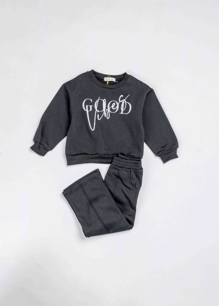 طقم اطفال بناتي, قطعتين, بلوزة, طباعة “Good Vibes” من الامام, ياقة مدورة, اكمام طويلة مع معصم ضيق, بنطلون, خصر مطاطي, جيوب من الامام, انيق وعملي