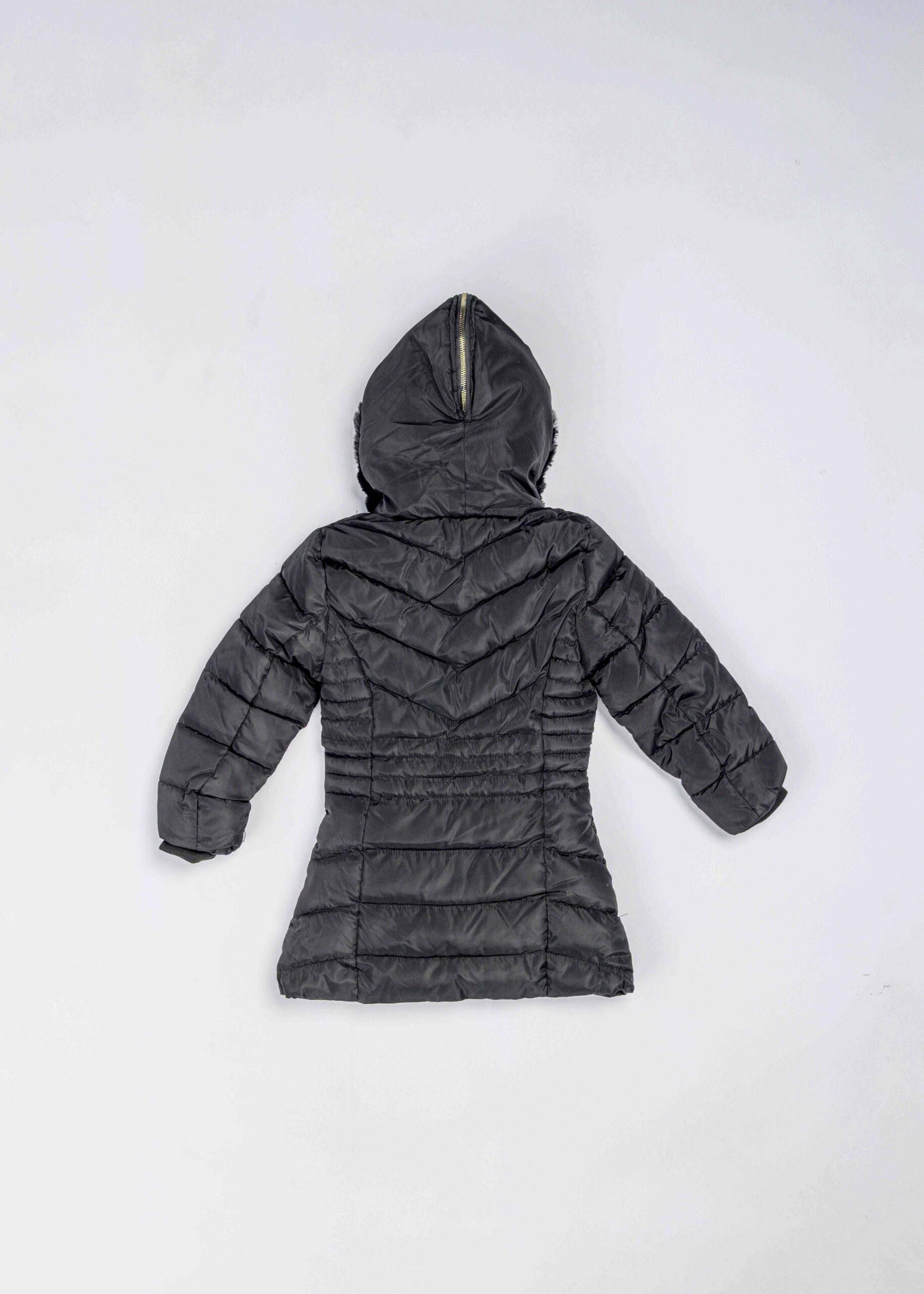 Kids girl jacket, waterproof, striped fabric, hood with fur lined, front zipper closure, long sleeves with elastic cuff, front pockets with zipper closure, unique and warm