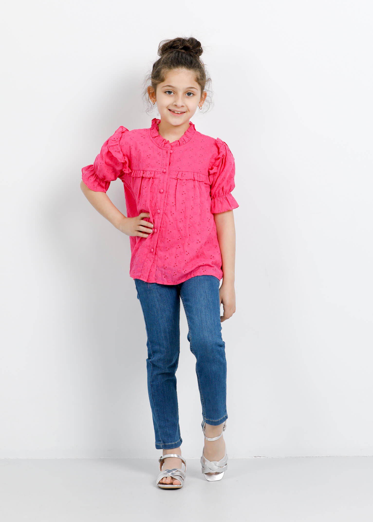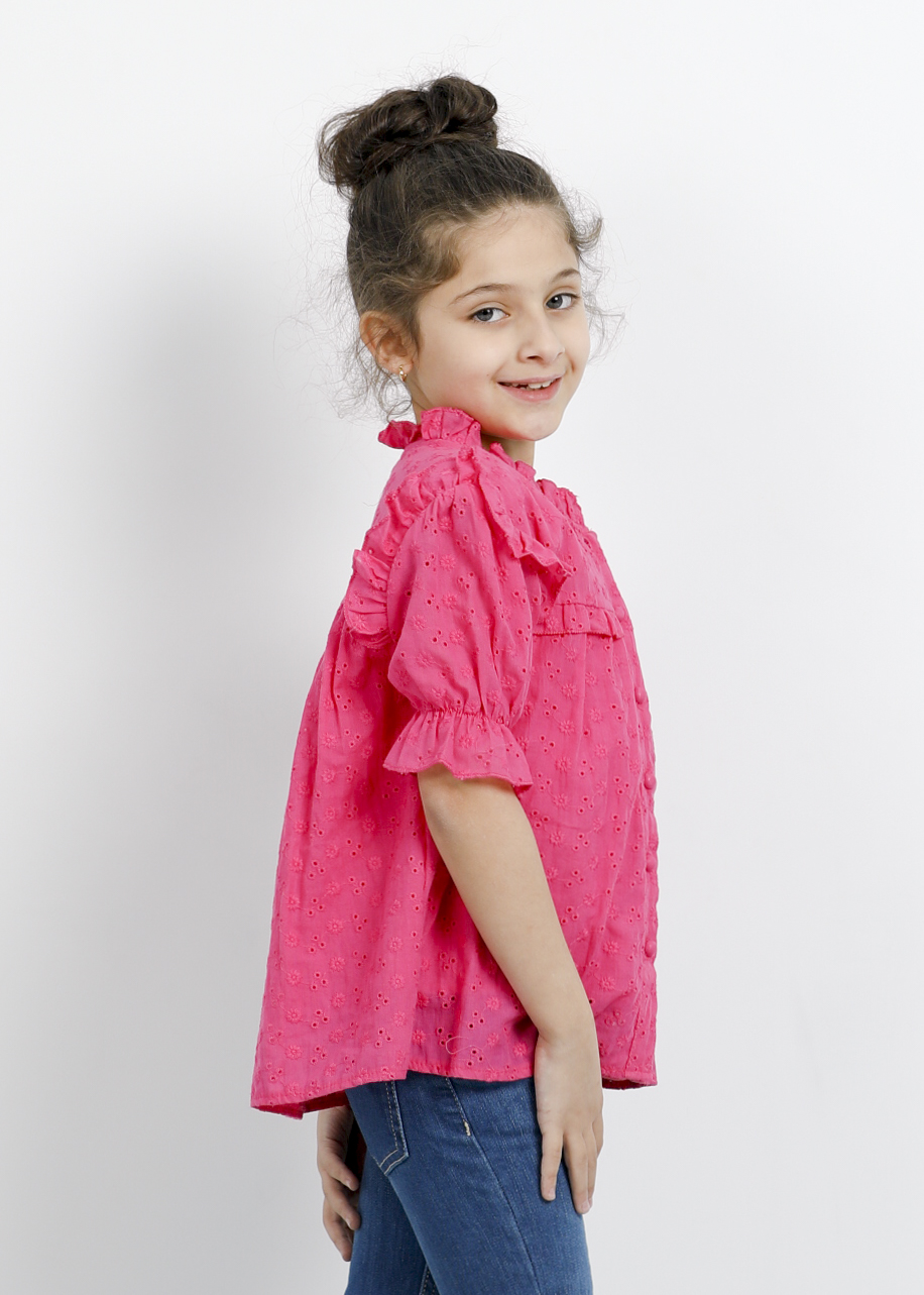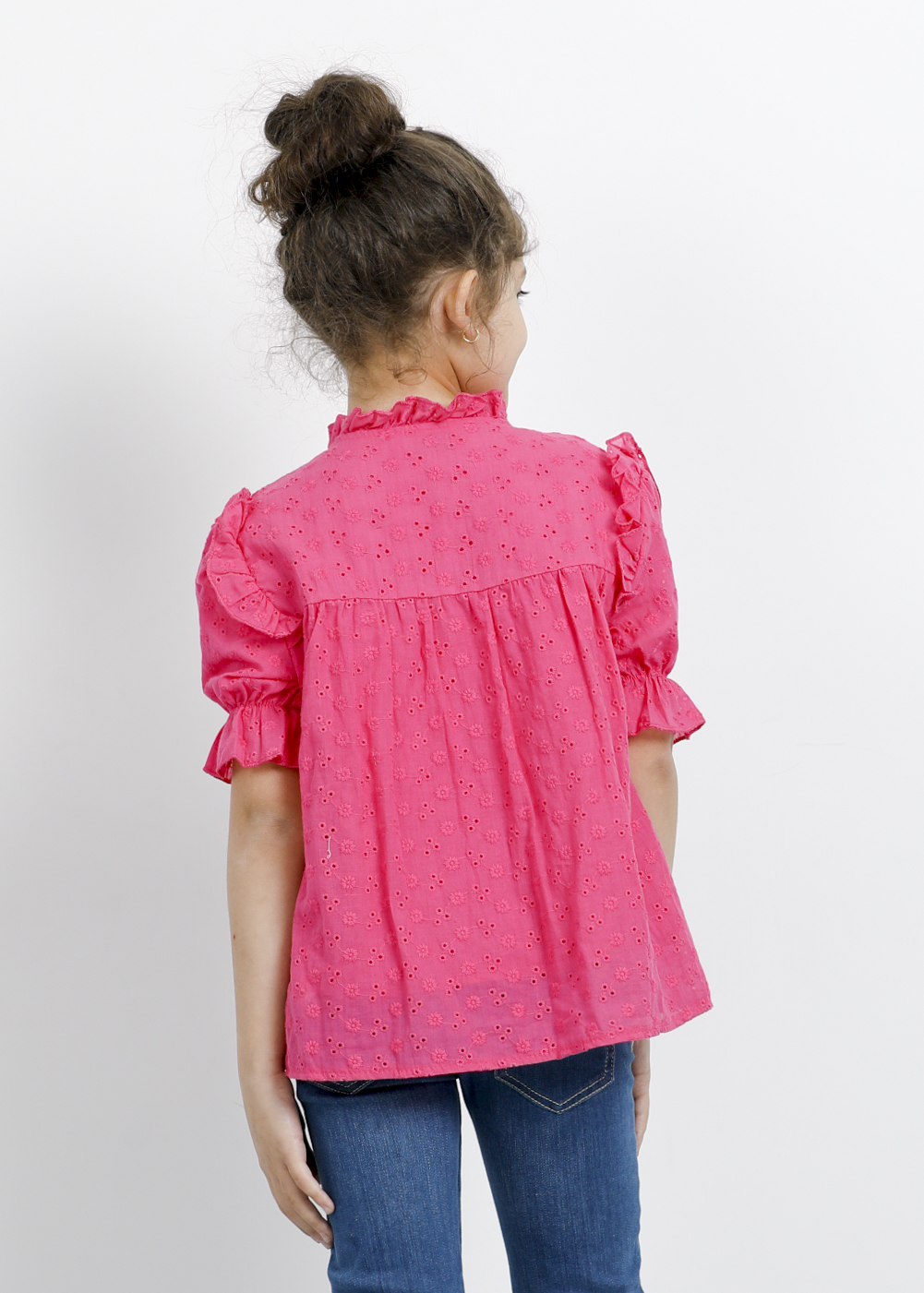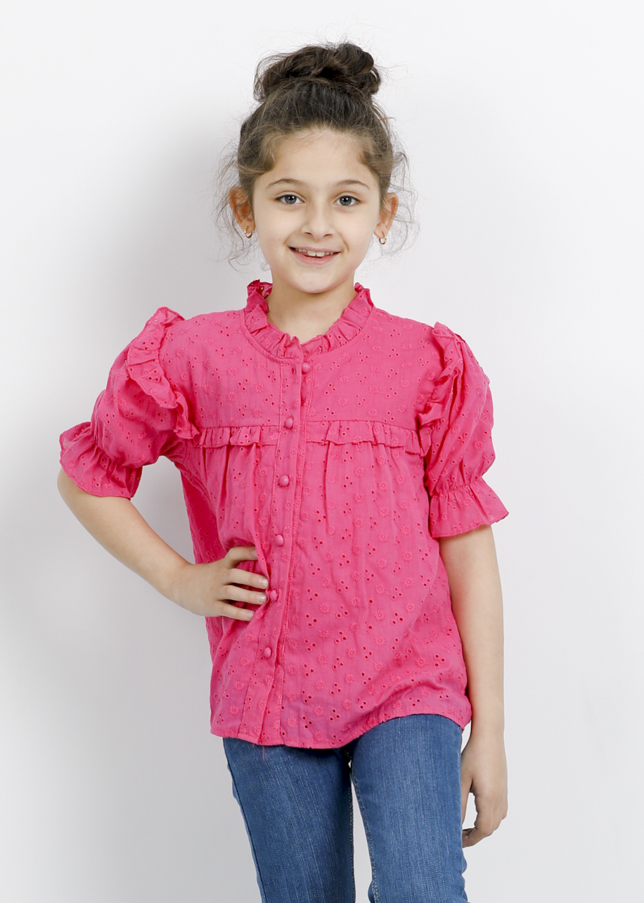 قميص اطفال بناتي, تصميم تطريز مثقوب, اكمام قصيرة مطاطية, اكتاف كشكش, ياقة كشكش, ازرار امامية, 80% قطن 20% بوليستر
