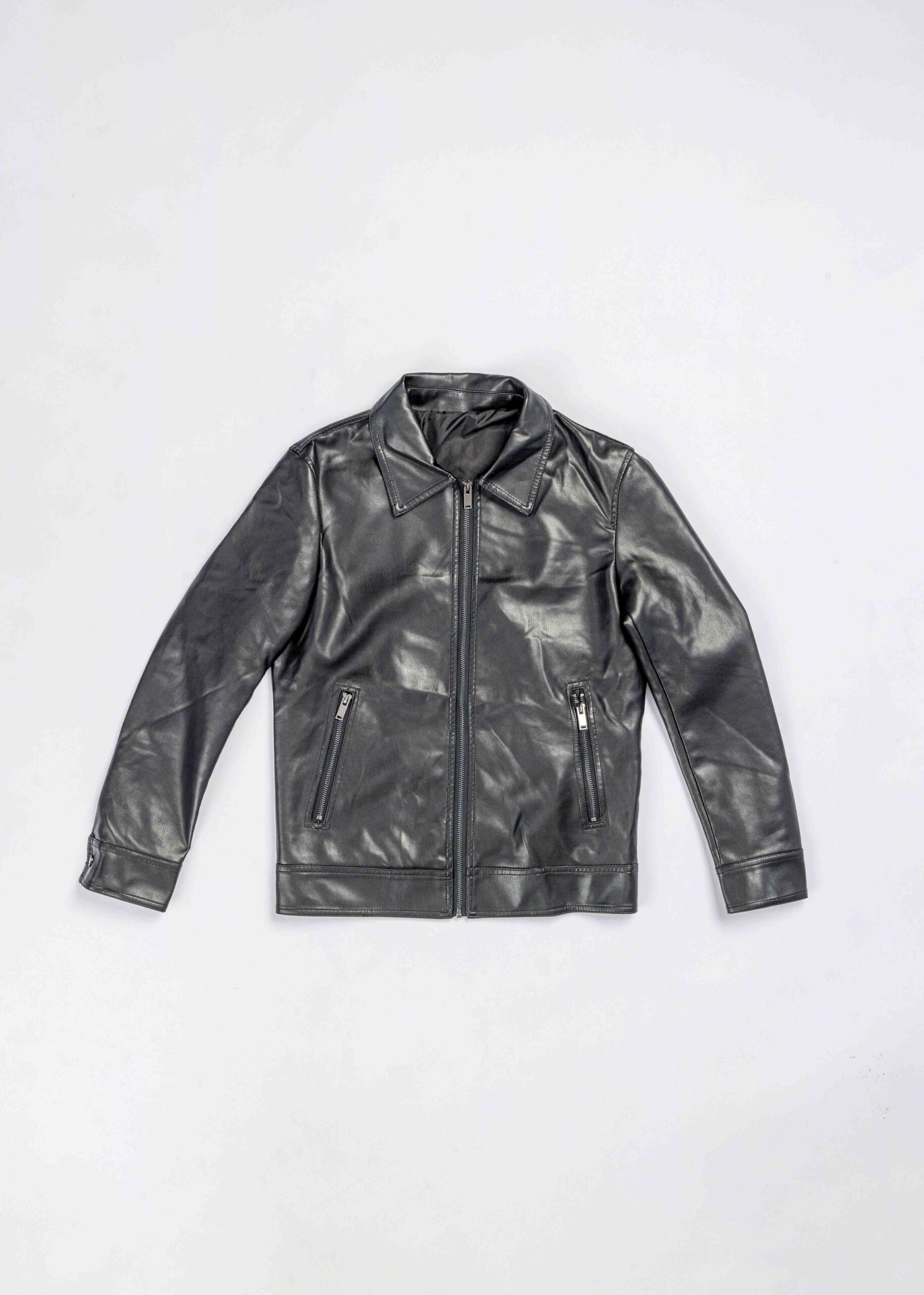 Men jacket, leather, rolled collar, front zipper closure, front pockets with zipper closure, long sleeves, tight cuff with buttons, unique and modern