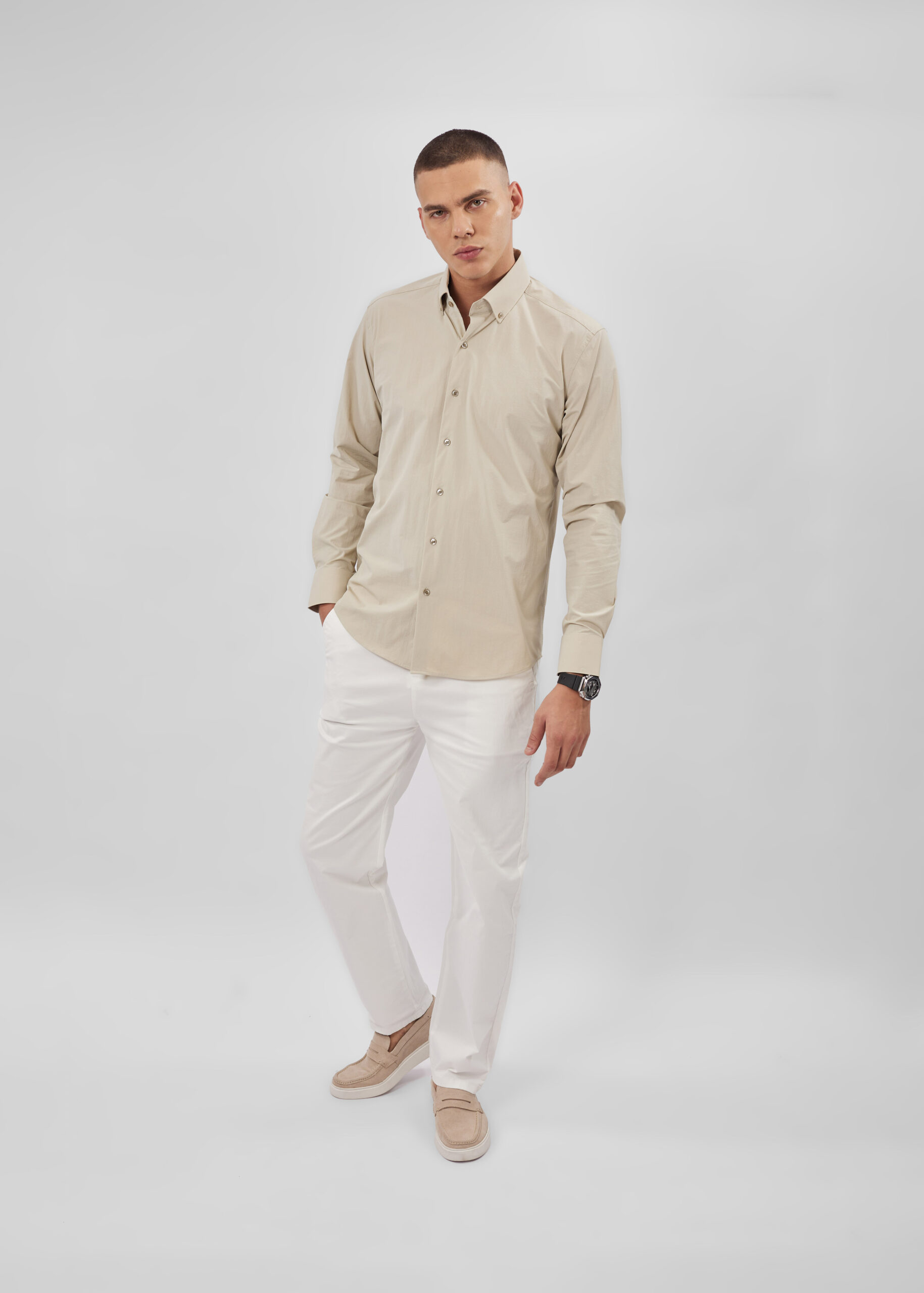 قميص رجالي, Slim-Fit, سادة, ازرار من الامام للاغلاق, ياقة مثنية مع زر من الامام, اكمام طويلة مع معصم ضيق, انيق وعملي