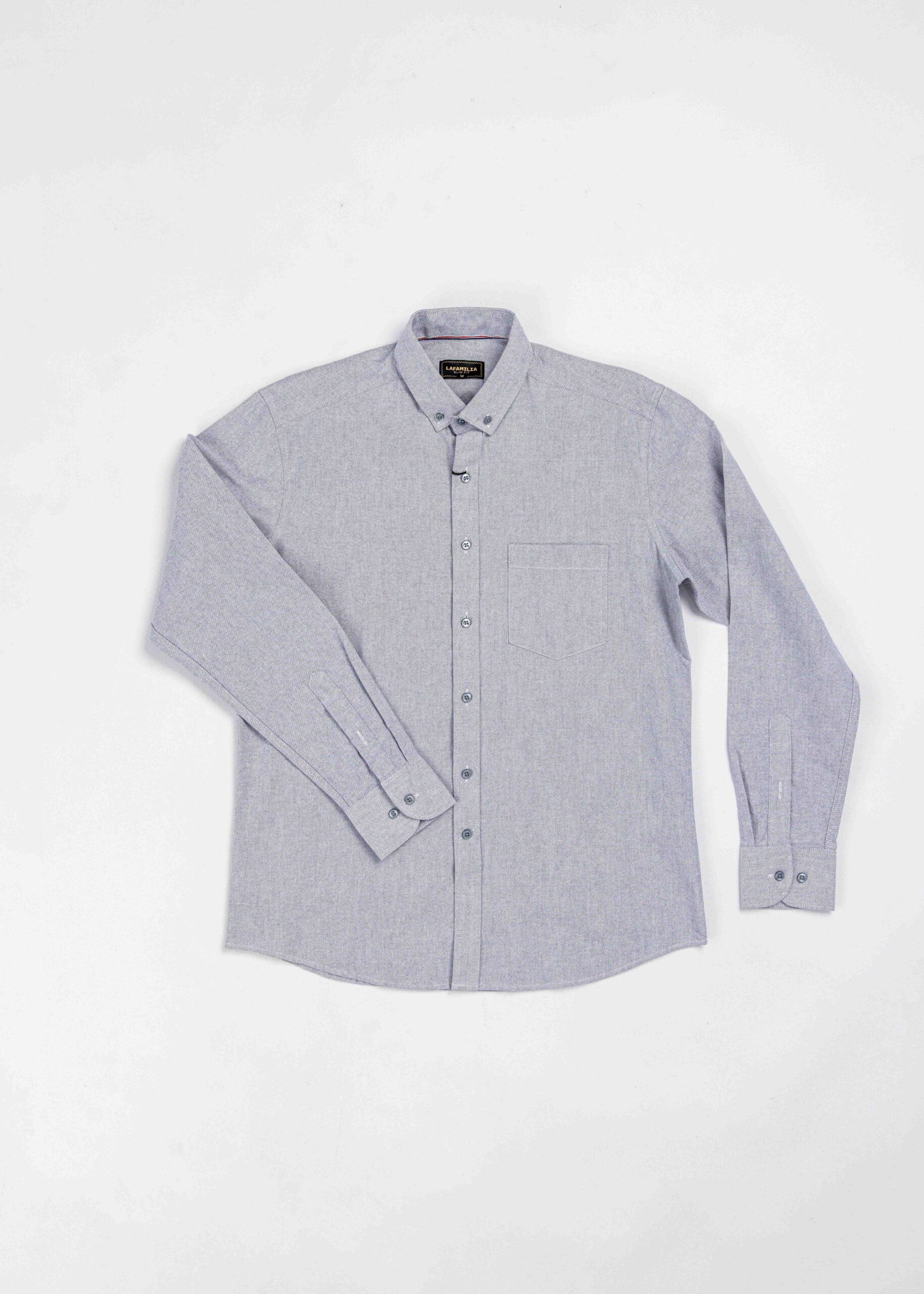 Men shirt, plain, slim-fit, rolled collar with front button, long sleeves, tight cuff with buttons, front buttons to close, front pocket, unique and modern