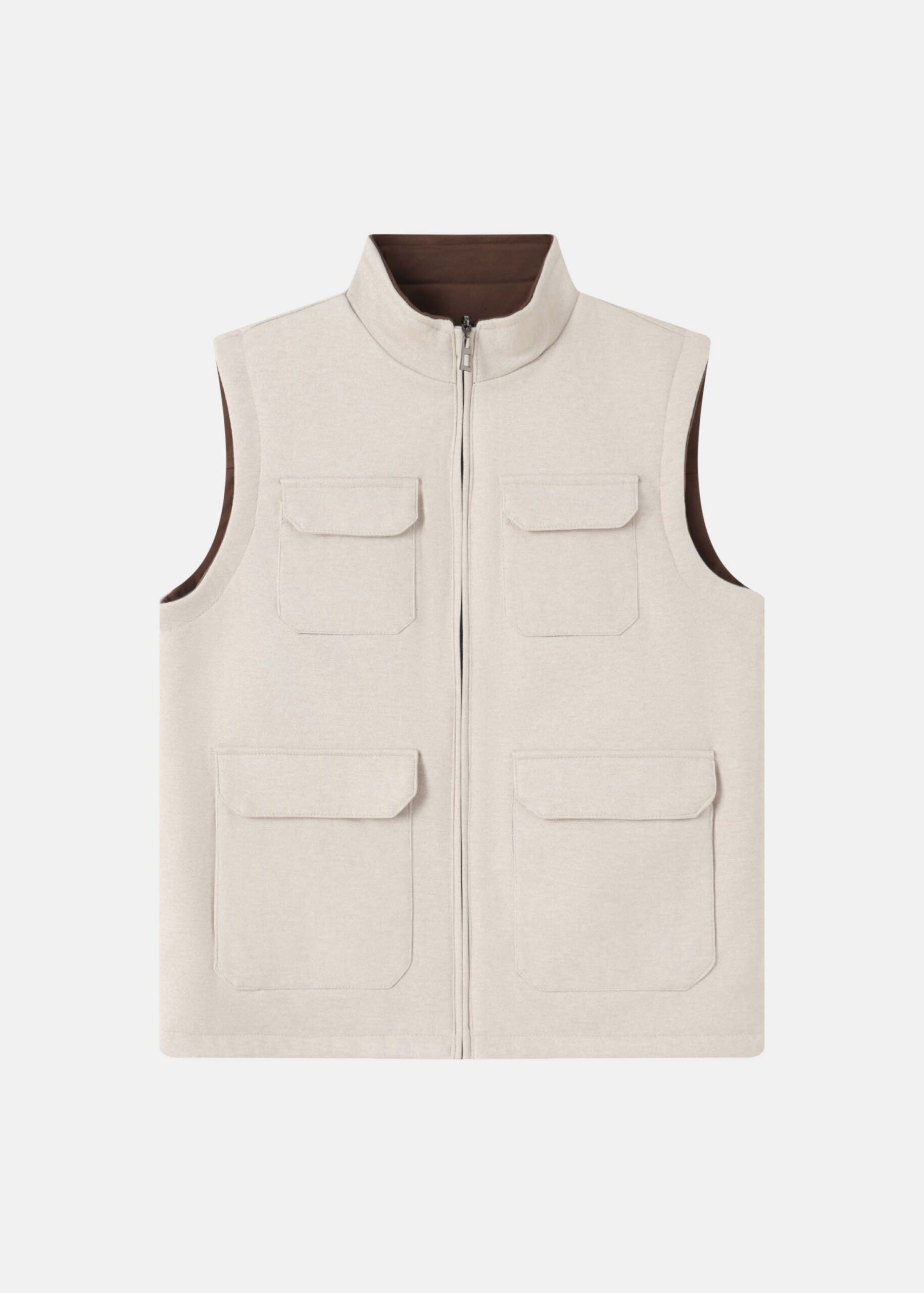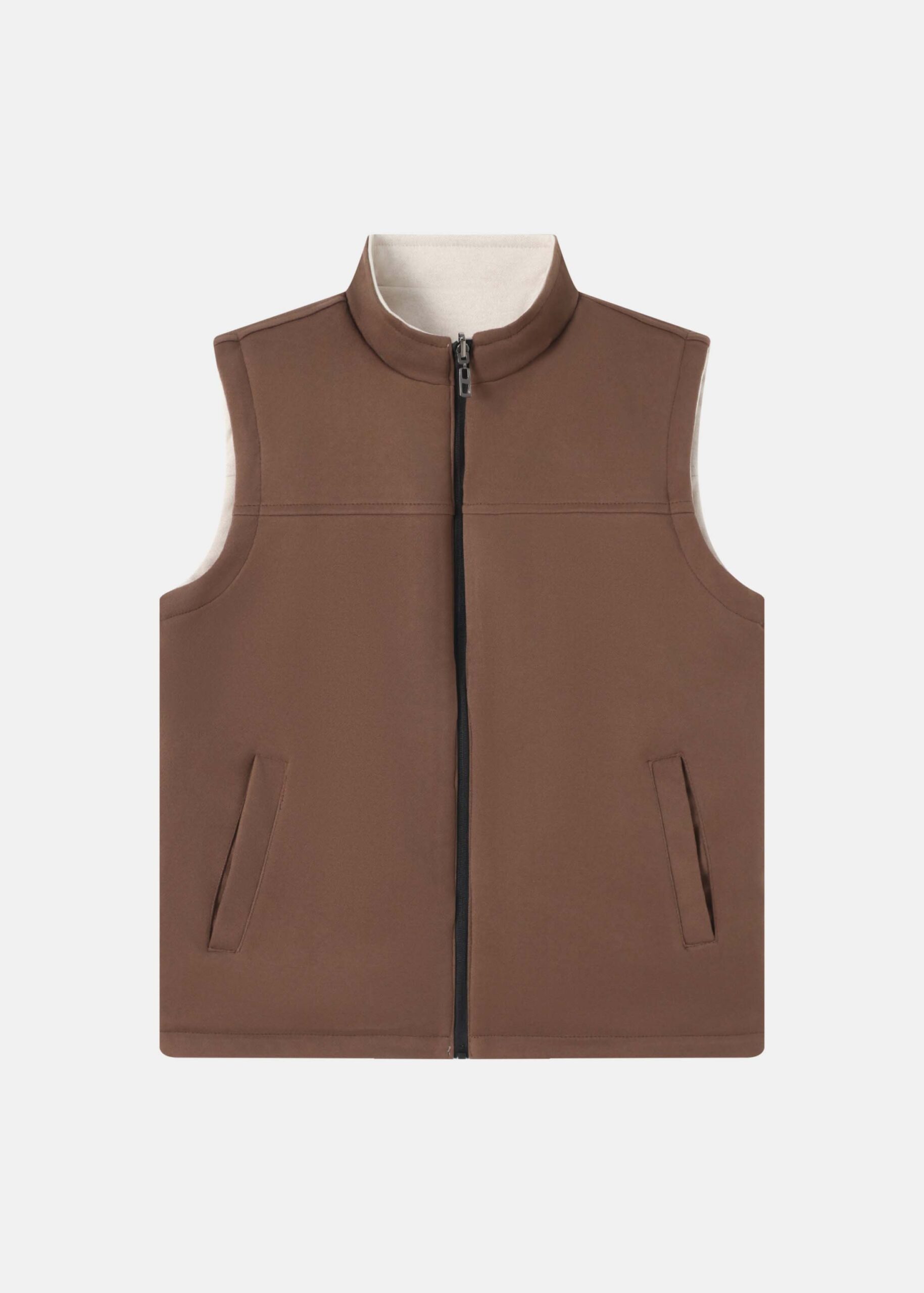 Men vest, plain, reversible, two-tone, sleeveless, stand collar, front zipper closure, front pockets, unique and practical