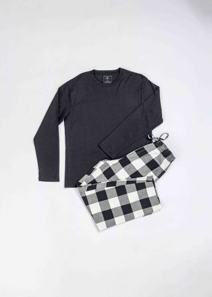 بيجامة رجالي, قطعتين, بلوزة, سادة, ياقة مدورة, اكمام طويلة, بنطلون, كاروهات, خصر مطاطي مع حبل للربط من الامام, مريحة وعملية