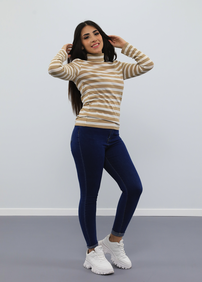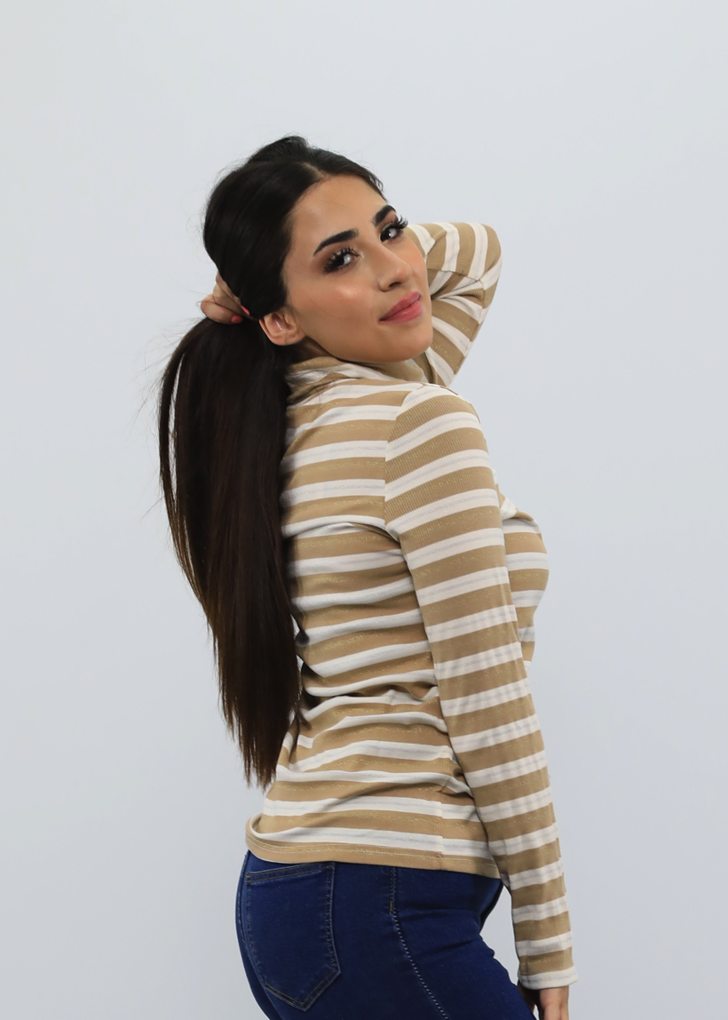 بلوزة ستاتي مخططة واسعة أنيقة و دافئة بأكمام طويلة و قبة عالية مصنوعة من 69% بوليستر، 20% رايون، 5% لوريكس، 6% سباندكس
