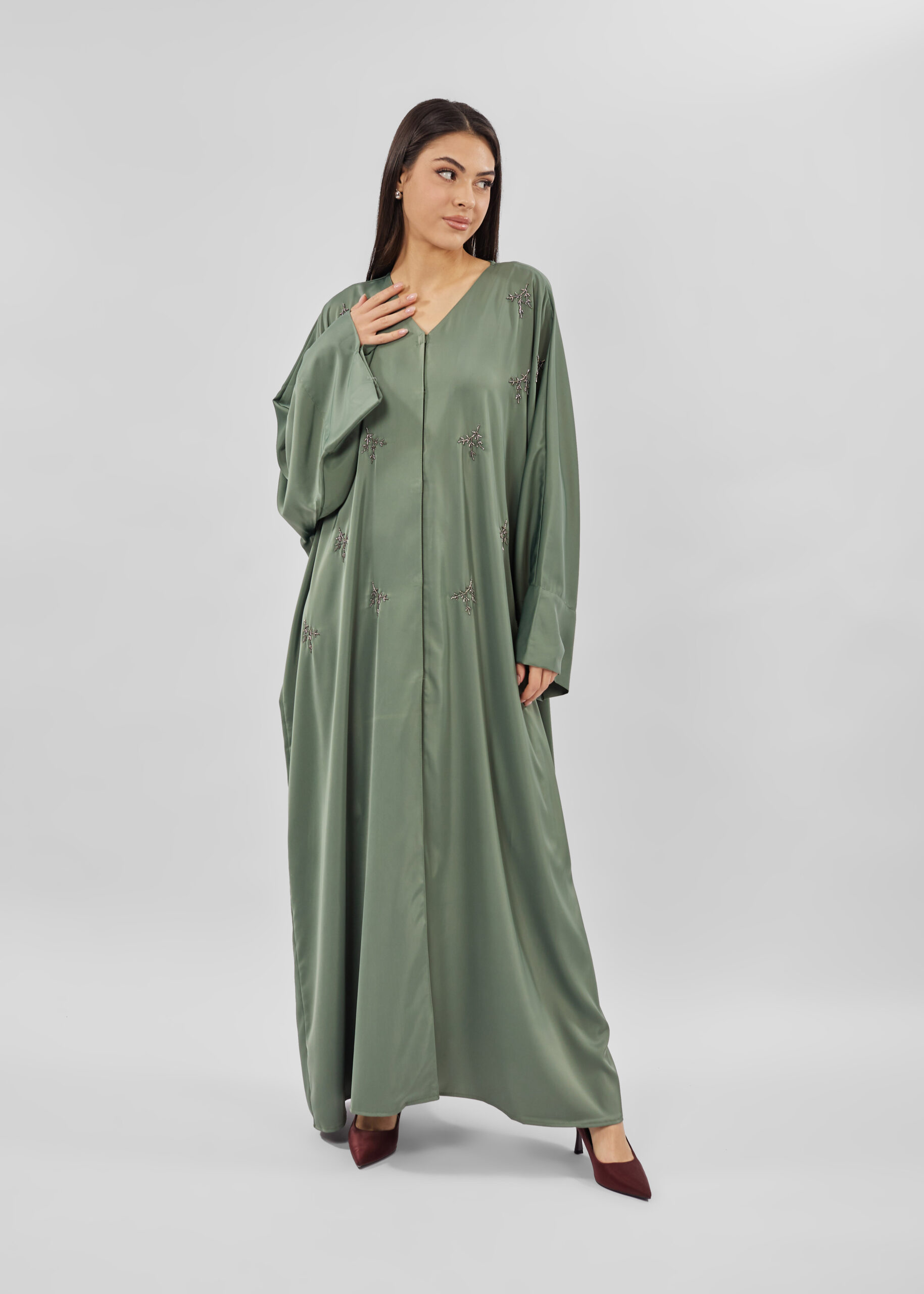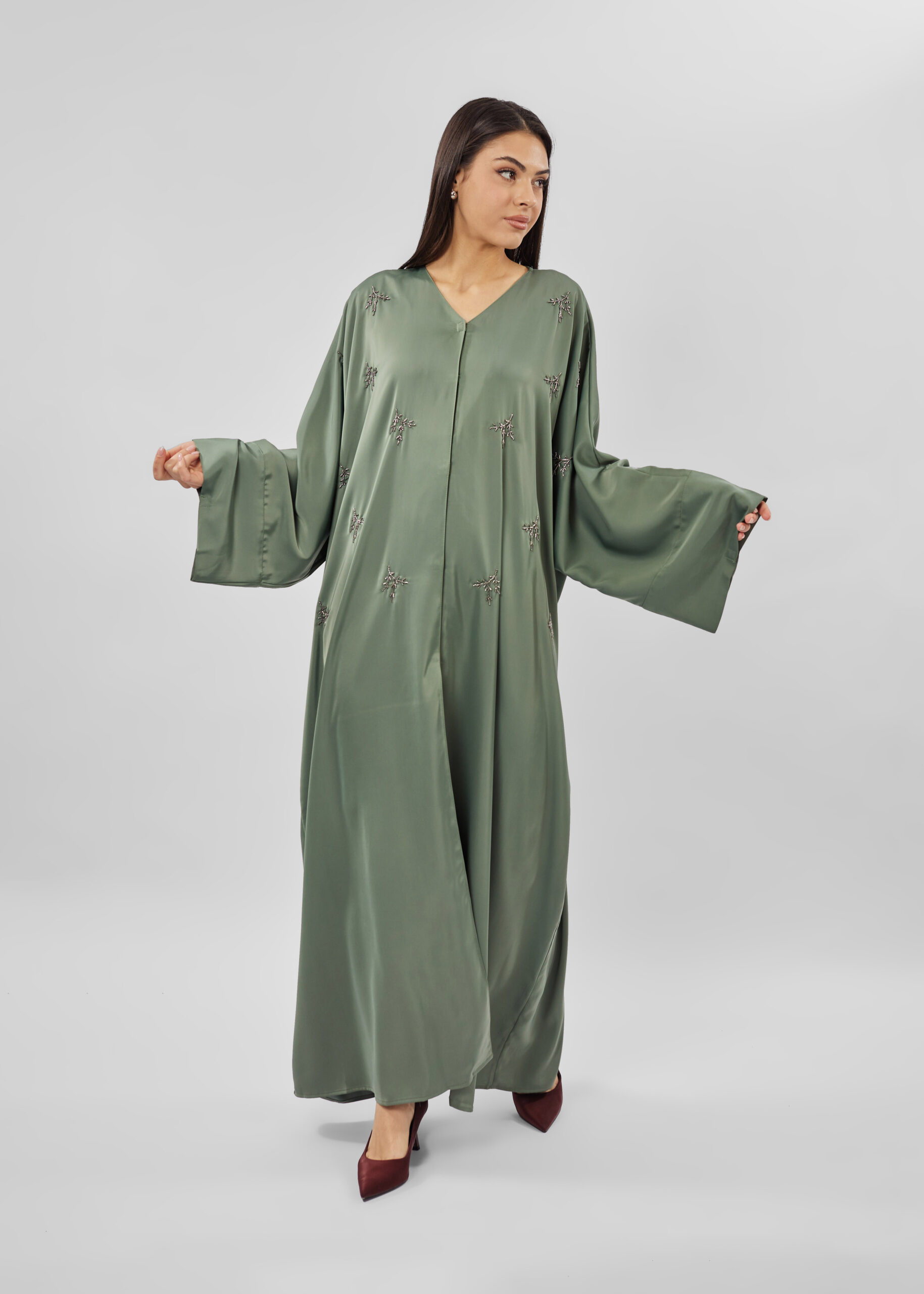 عباية نسائي, مزينة بالخرز, اكمام طويلة, ازرار كبس من الامام للاغلاق, ياقة سبعة, انيقة وعصرية