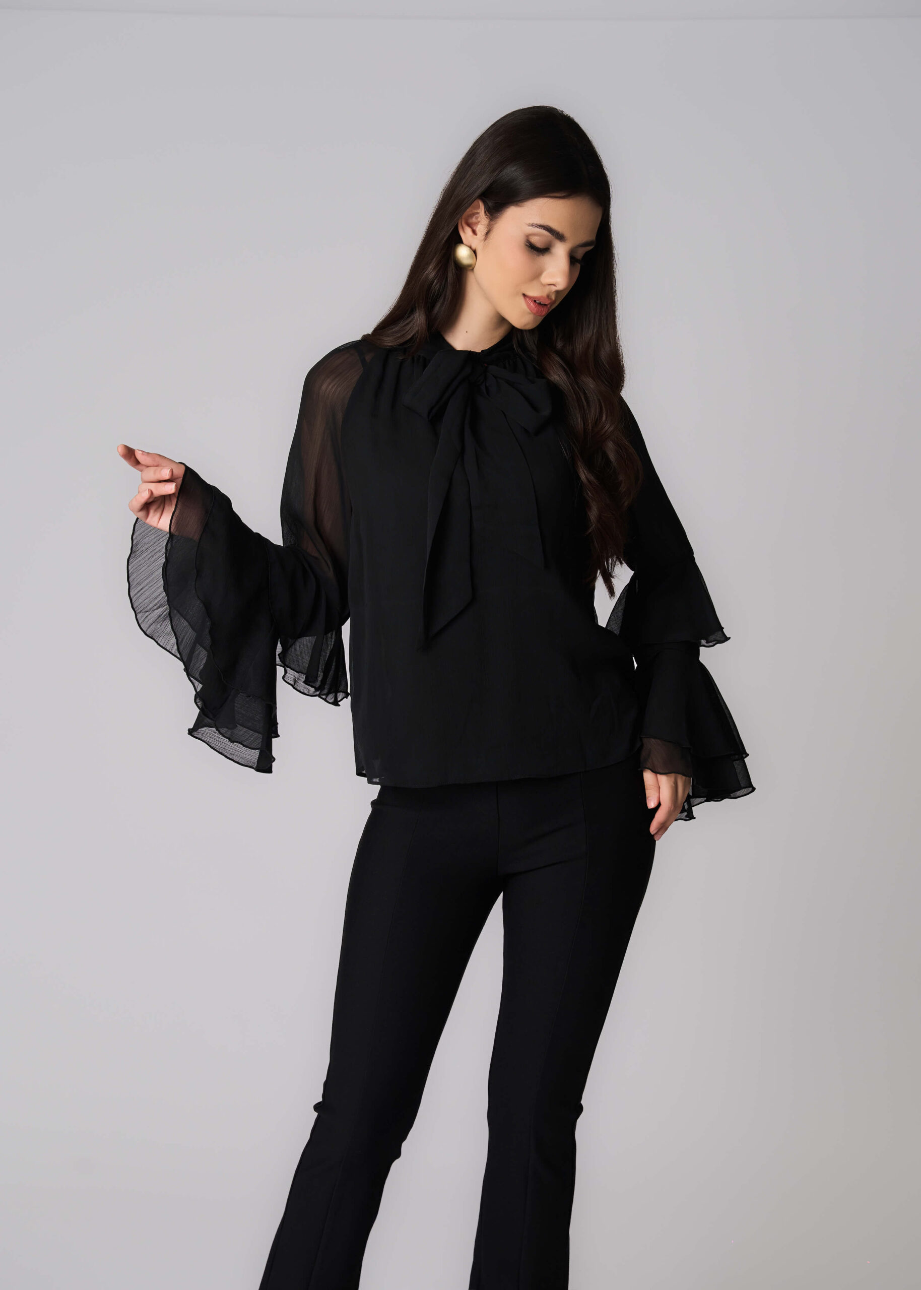 بلوزة نسائي, شيفون, ياقة مدورة مع ربطة من الامام, اكمام طويلة مزينة بطبقات كشكش, انيقة وعصري