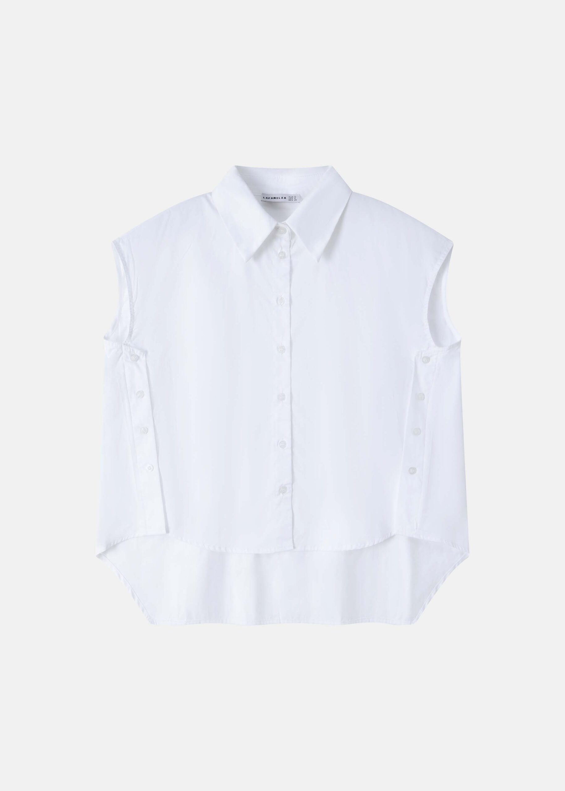 قميص نسائي, قصير, ياقة مثنية, ازرار من الامام للاغلاق, بدون اكمام, غير متساوي الطول, مزين بازرار من الجانبين, انيق وعصري