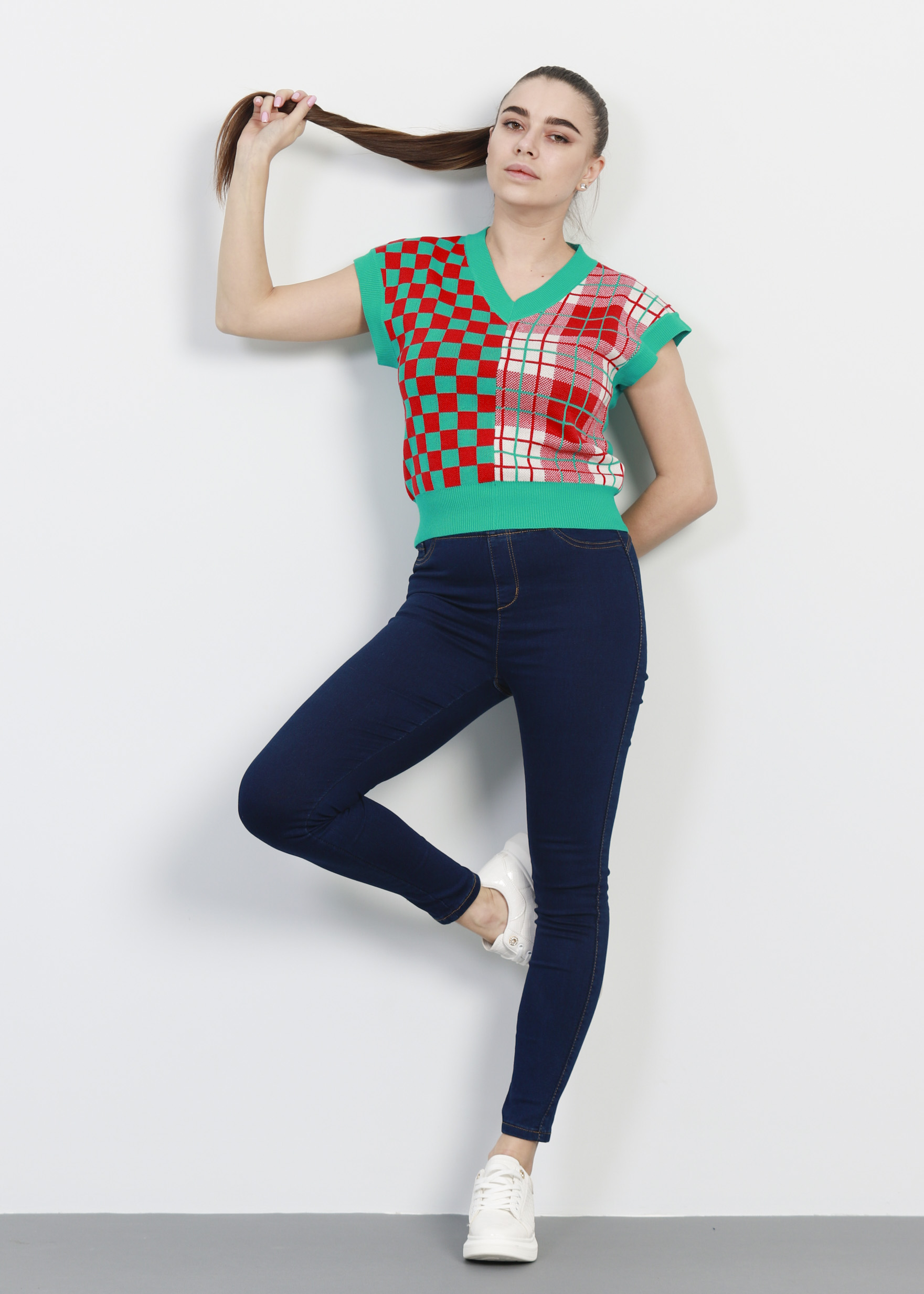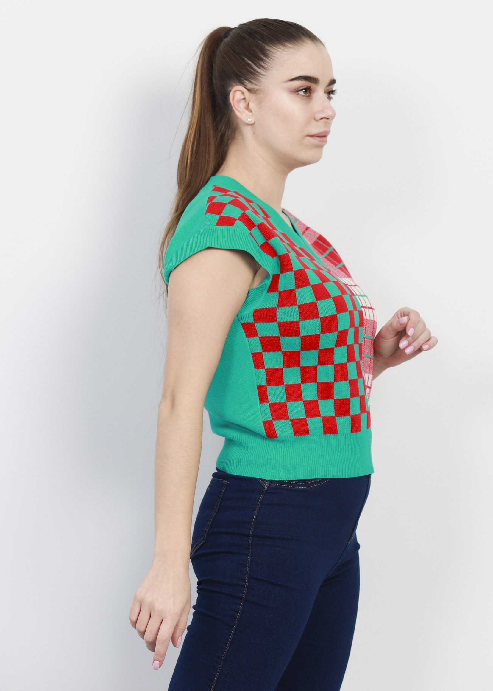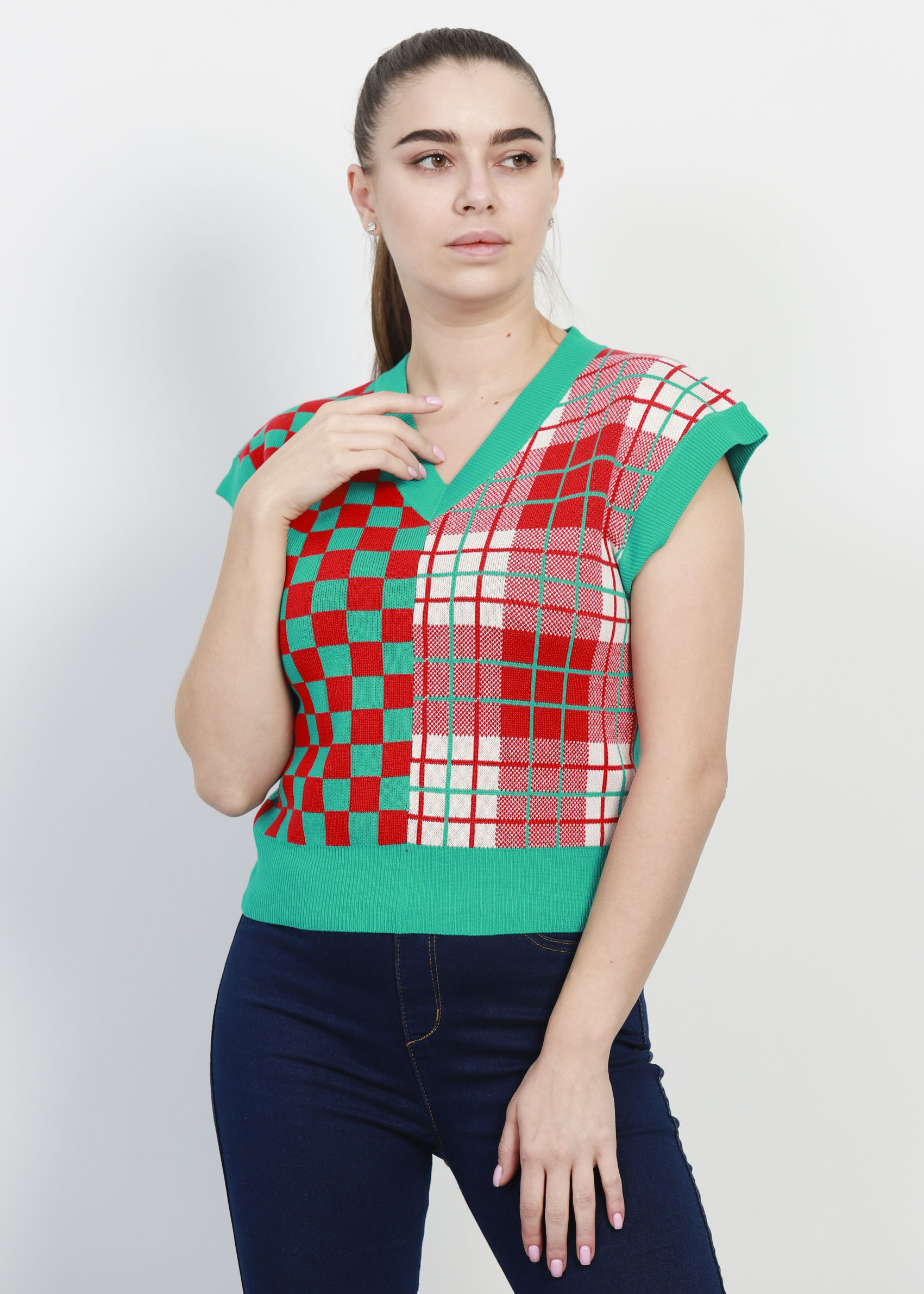 فيست نسائي, تصميم محبوك, كاروهات, عدة الوان, بدون اكمام, ياقة سبعة, سادة من الخلف, انيق وعصري, 90% بوليستر 10% بولي اميد
