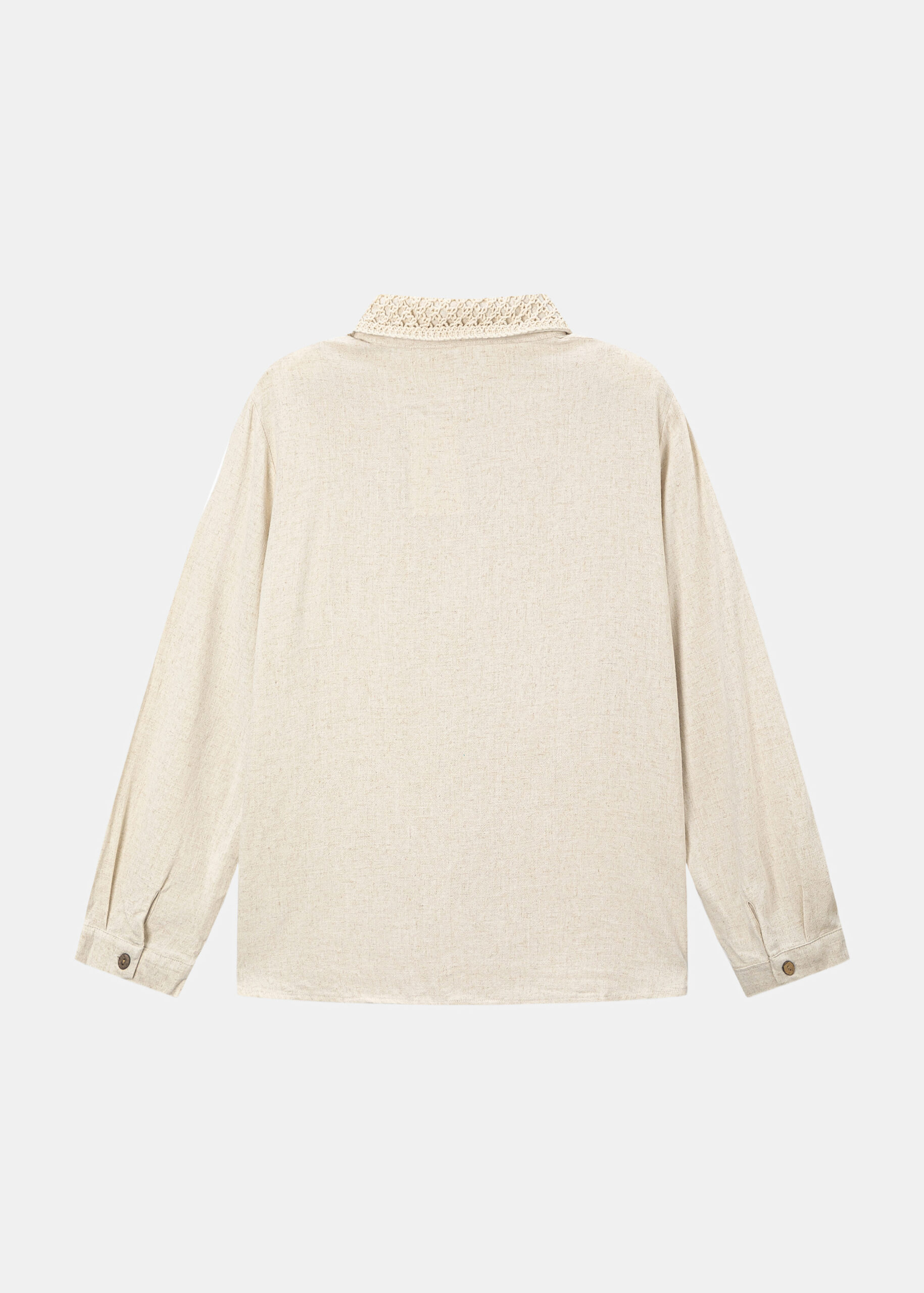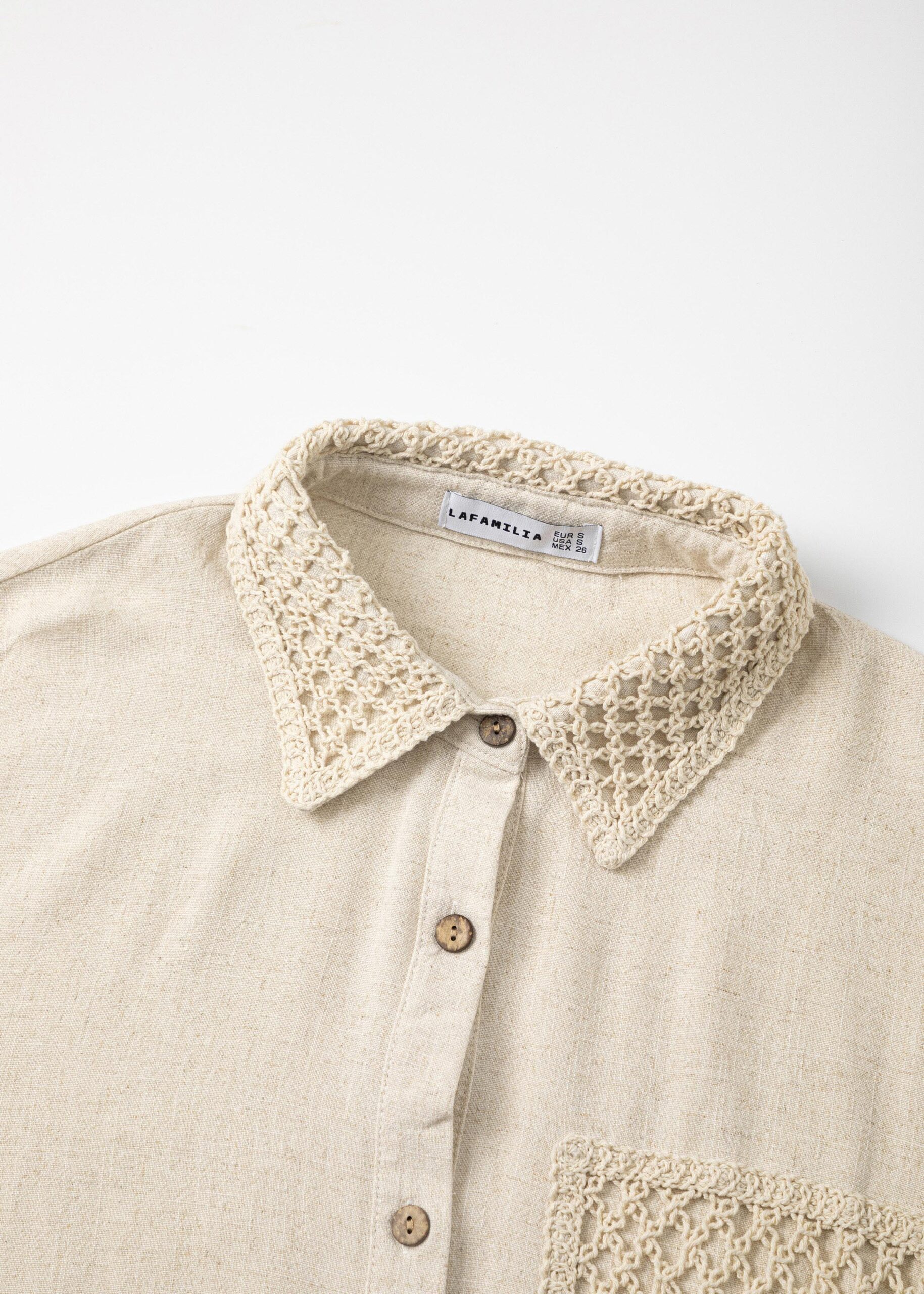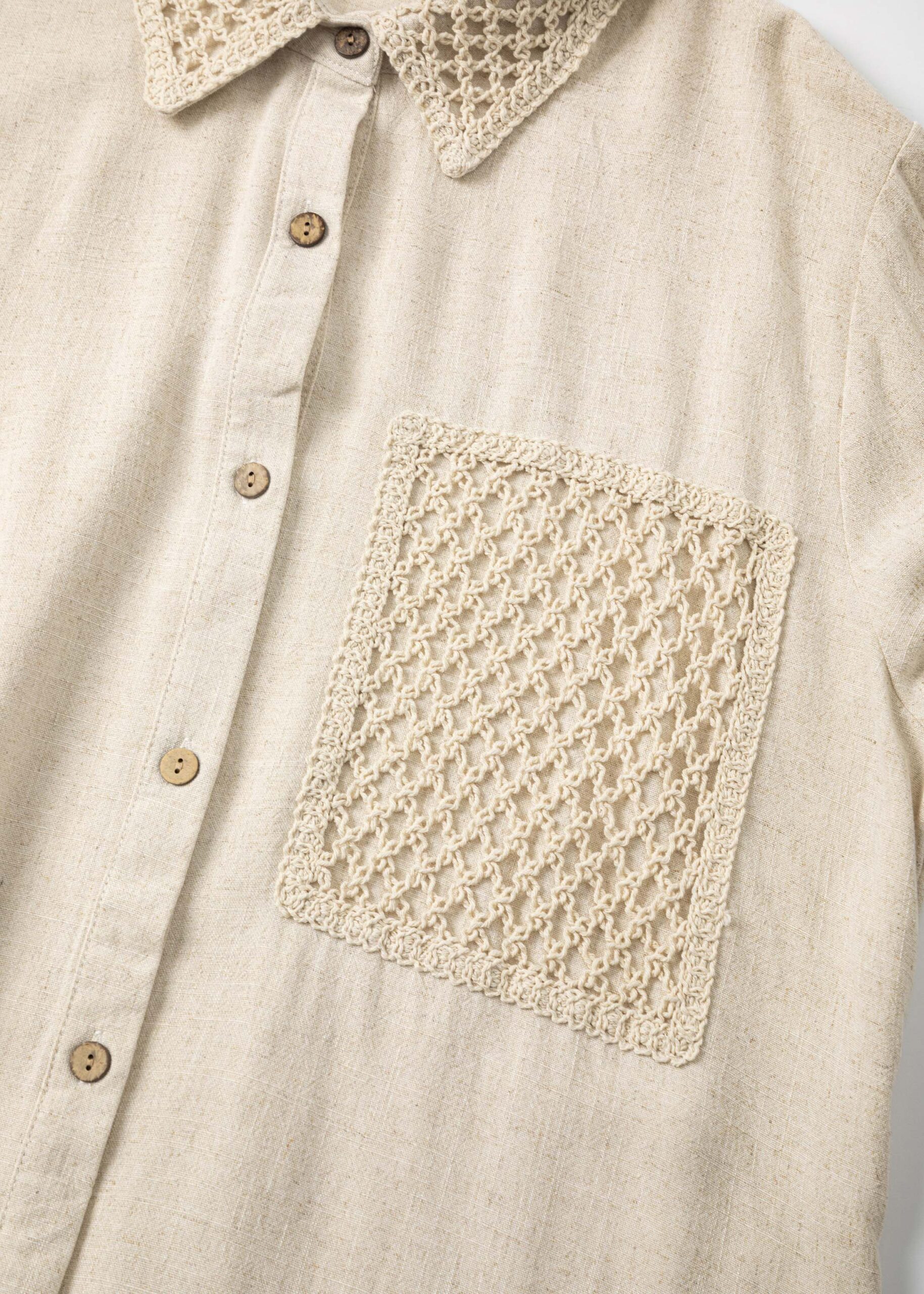 قميص نسائي, تصميم كروشيه, ازرار من الامام للاغلاق, اكمام طويلة مع معصم ضيق, ياقة مثنية مع زر من الامام, جيب امامي, انيق وعصري